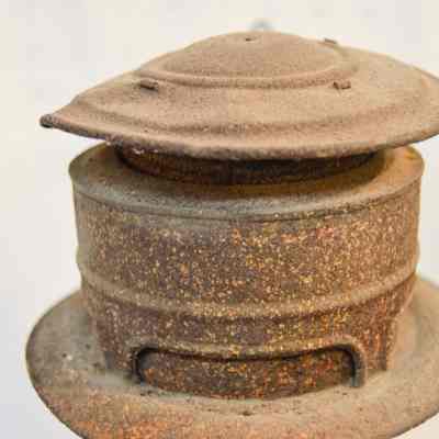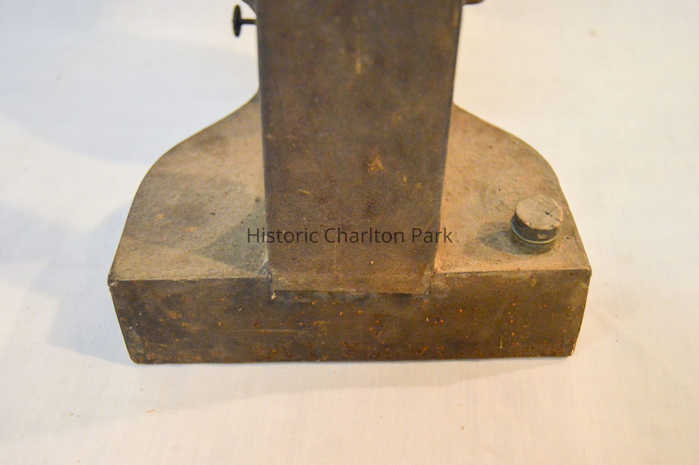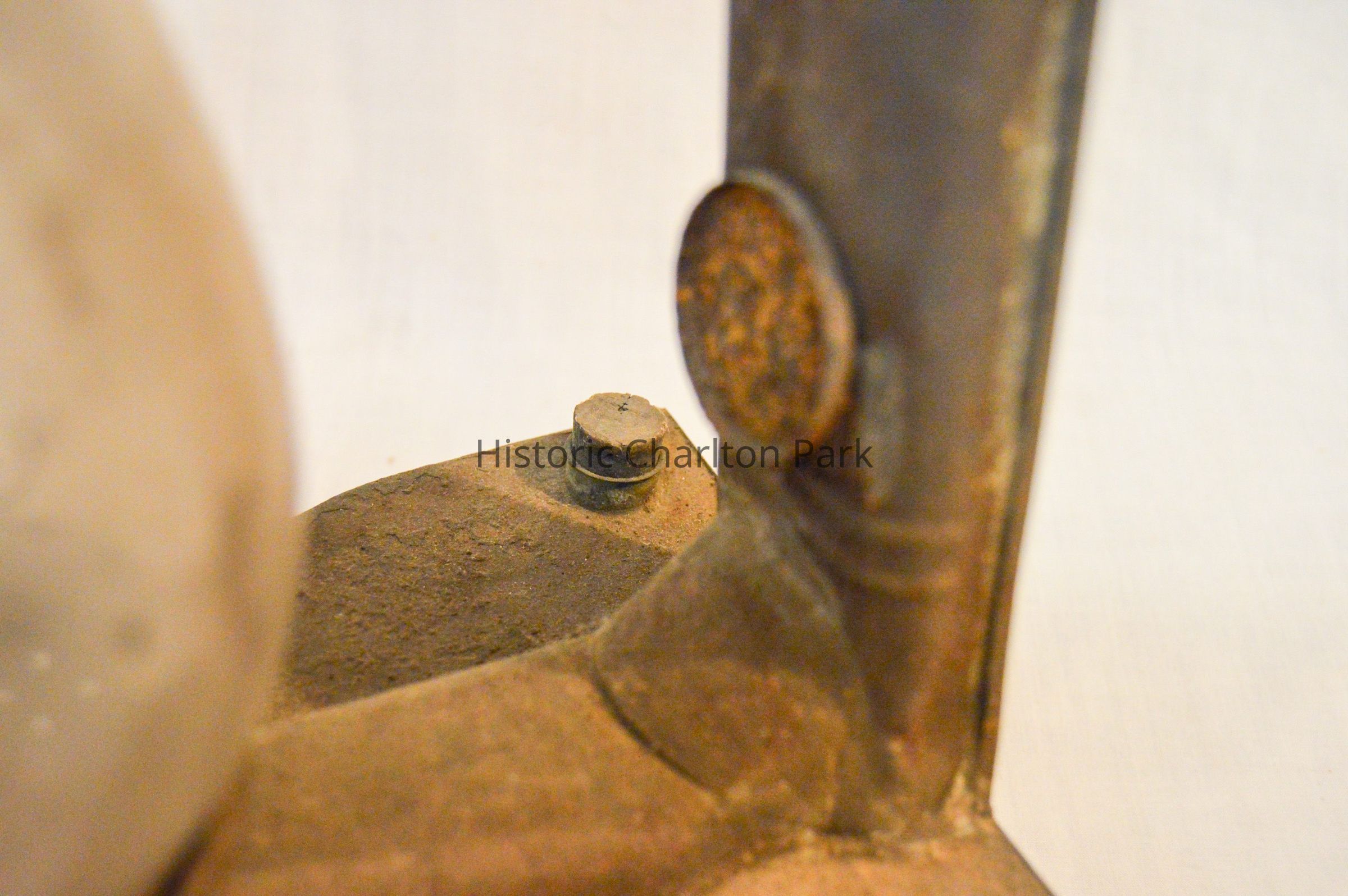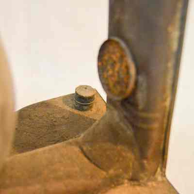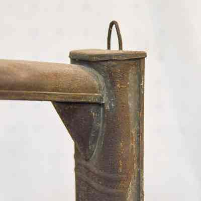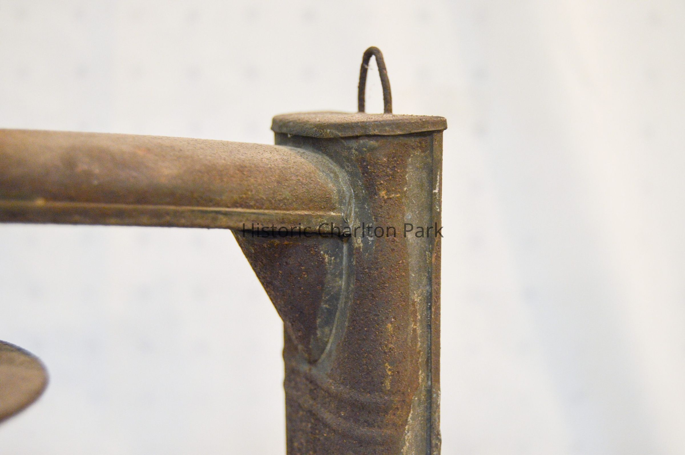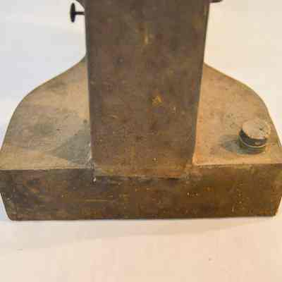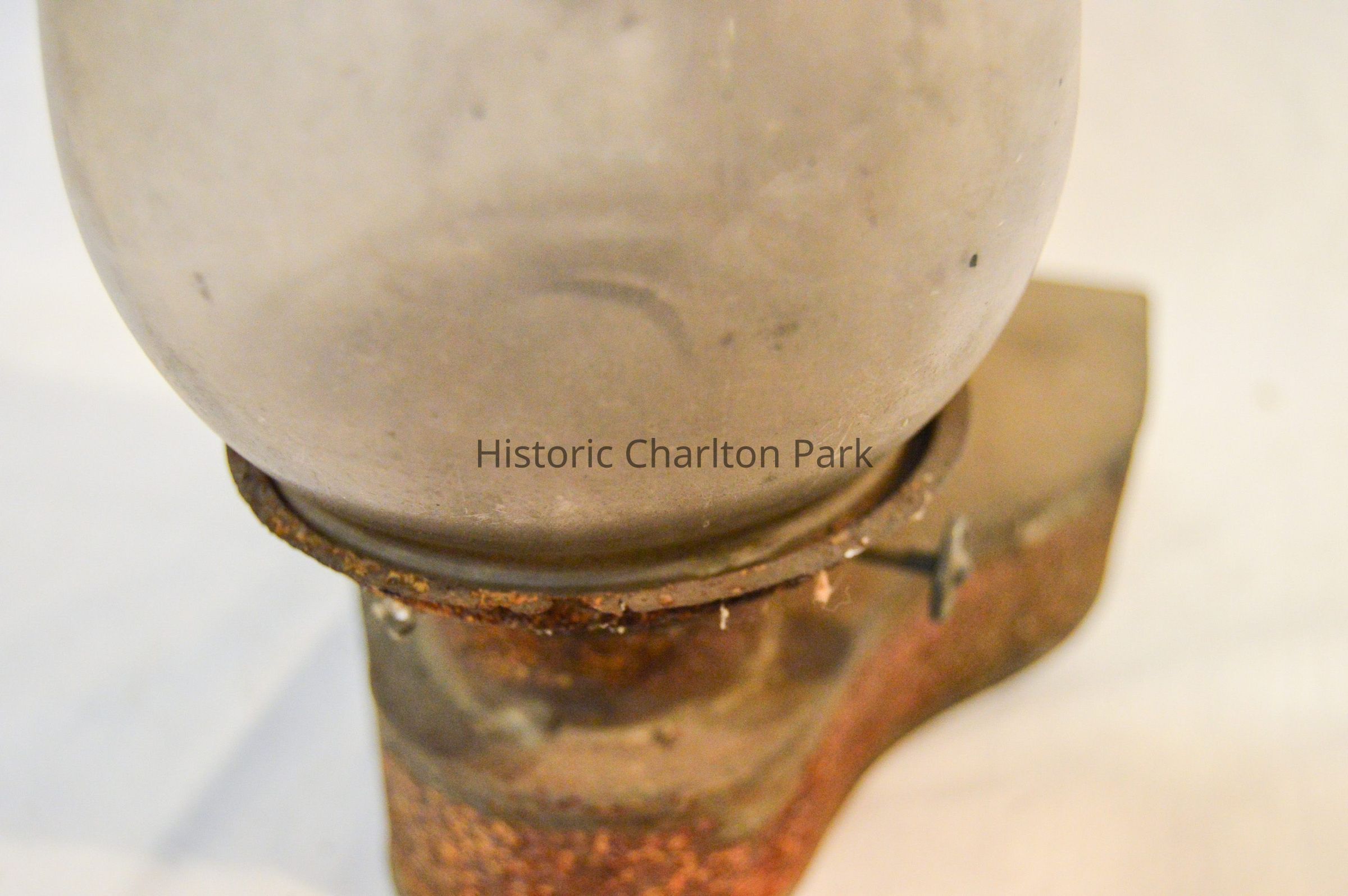 Large kerosene lamp made of metal and has a large frame, likely for mounting to a wall. The base of the lamp is trapezoidal, with a rounded portion at the front. Above the front of the frame sits the burner, which is comprised of a round knob off the right side, a metal right with circular vents, and a dome-shaped emitter in the center. The emitter has a slot in the top for the wick. The glass chimney, which has a somewhat pear-like shape, sits on top of the burner. There is a large structure at the back of the lantern that extends upward and over the chimney, capping it at its top opening. The cap is cylindrical and has a disc around the bottom. The top also somewhat disc-shaped. There is a circular attachment on the back structure near the base, which is circular and likely where a reflector attaches. There is also a small, circular fuel cap on the left side of the base.Dimensions