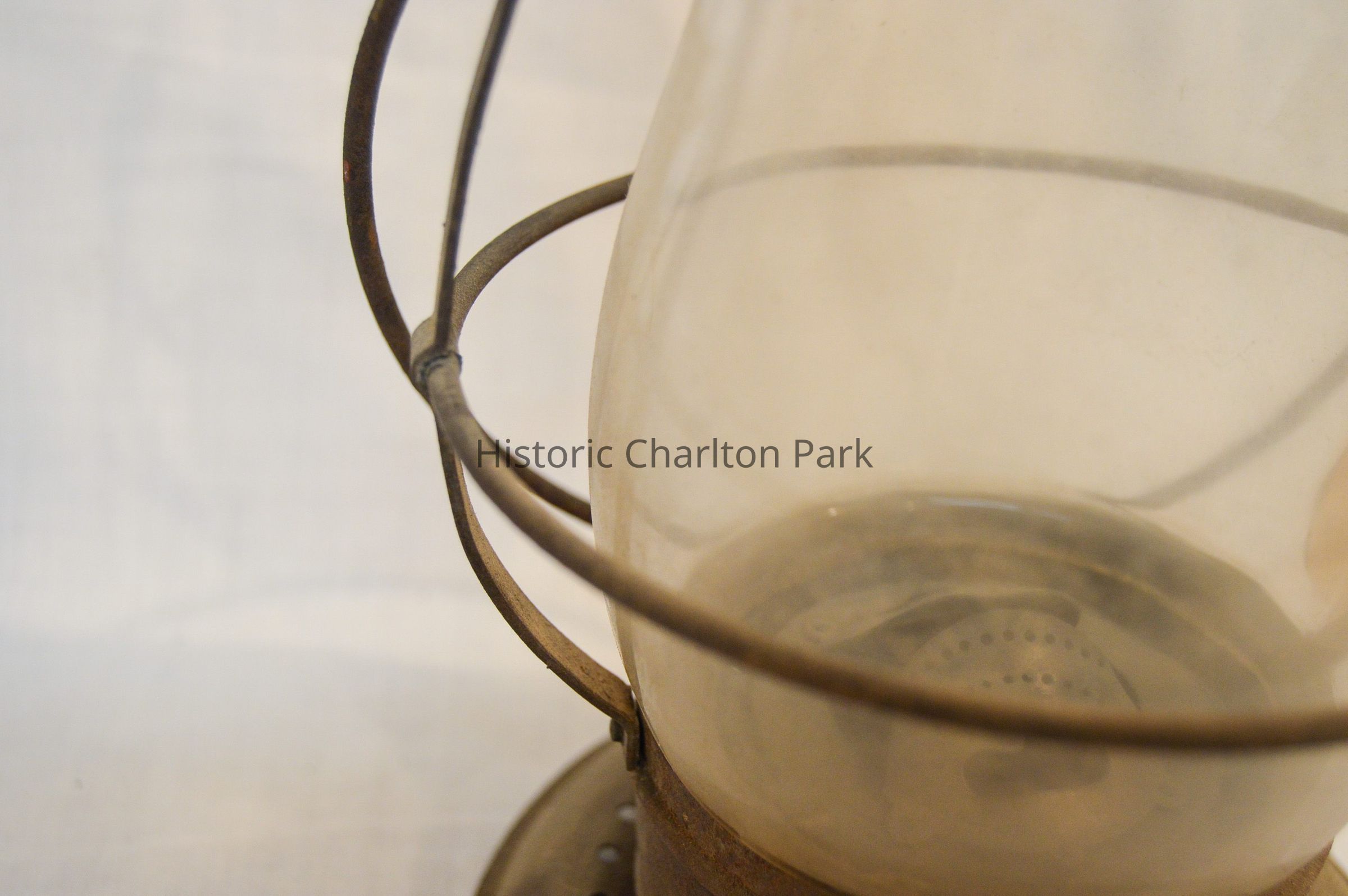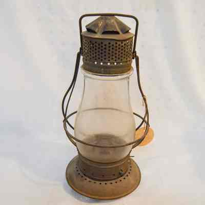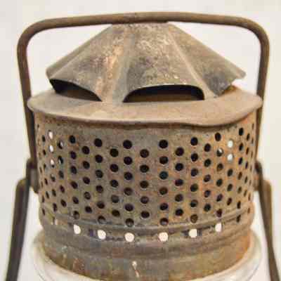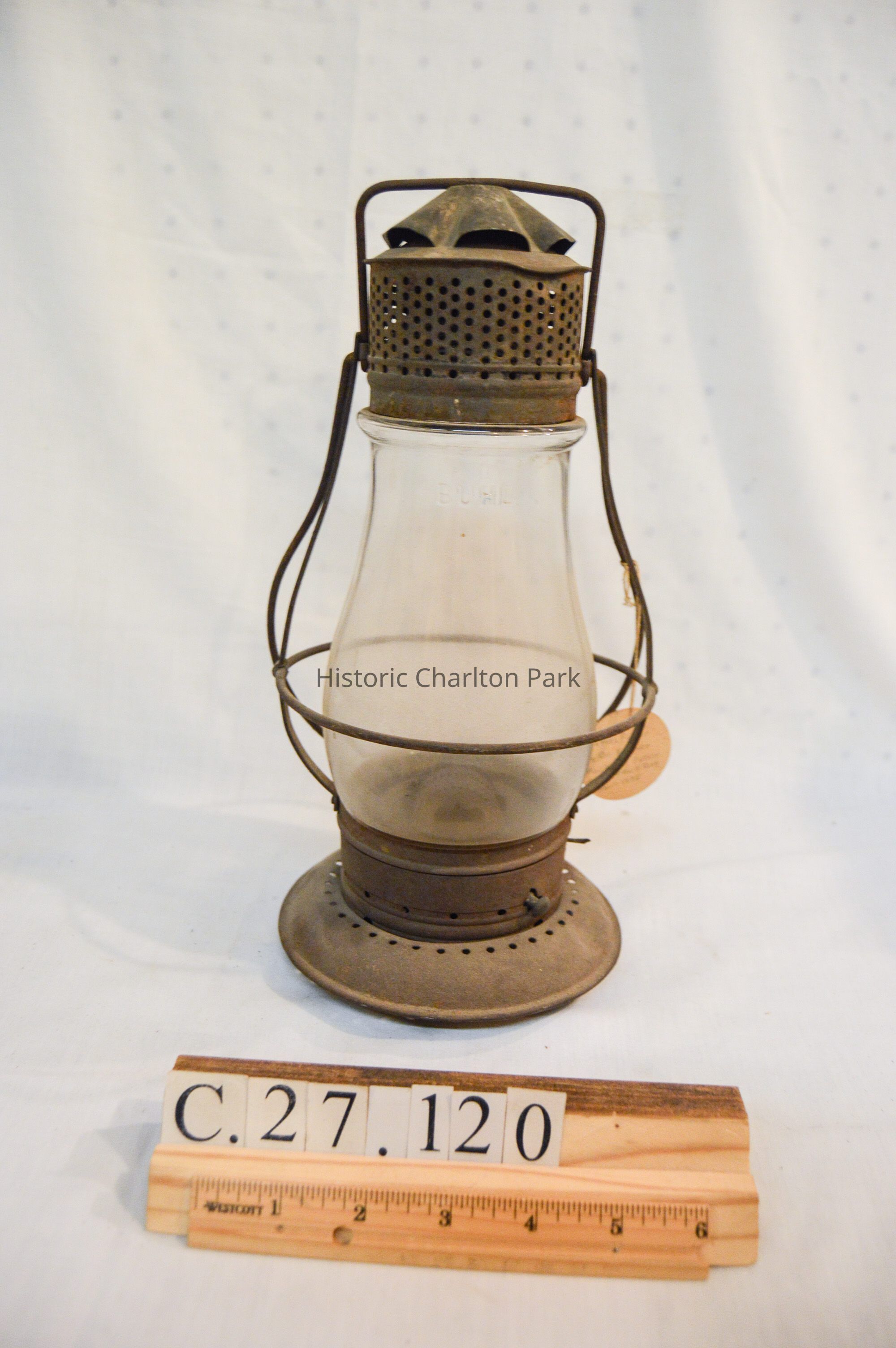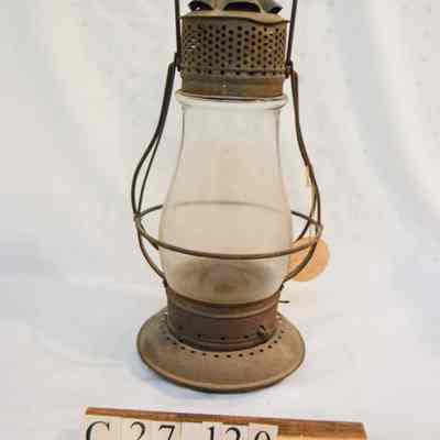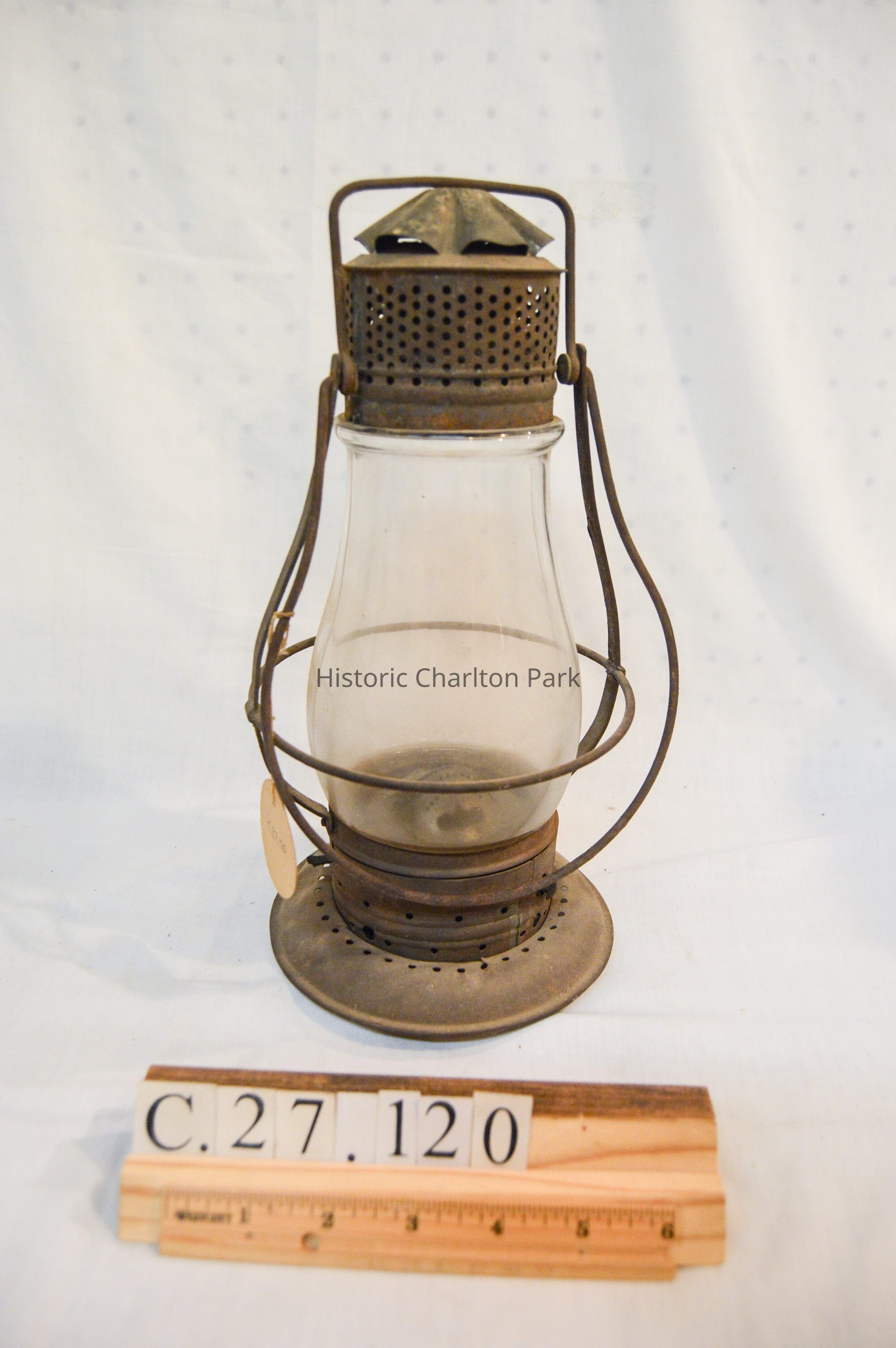 Metal and glass oil lantern with a base made of metal and has a cylindrical shape. There is a metal skirt around the base with circular holes around the inside edge. The base has two protrusions, one of them a small circular knob and the other a pointed piece of metal, both of which are near each other. The base supports the lamp chimney, which is made of clear glass. The glass is round and tapers inward towards the top. The lamp chimney is surrounded by a metal wire frame on two sides. A circular metal wire is attached to this frame and loops around the chimney. The cap to the chimney is made of metal and has a cylindrical shape with circular vents along the side. The top is conical ruffled. A looped metal handle is attached to the cap.Inscription/Signature/Marks