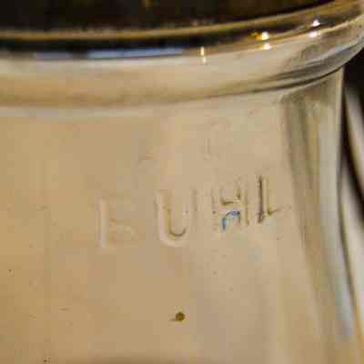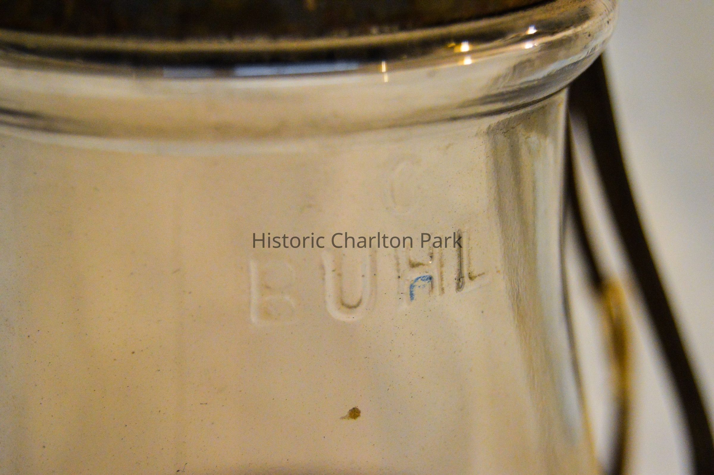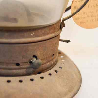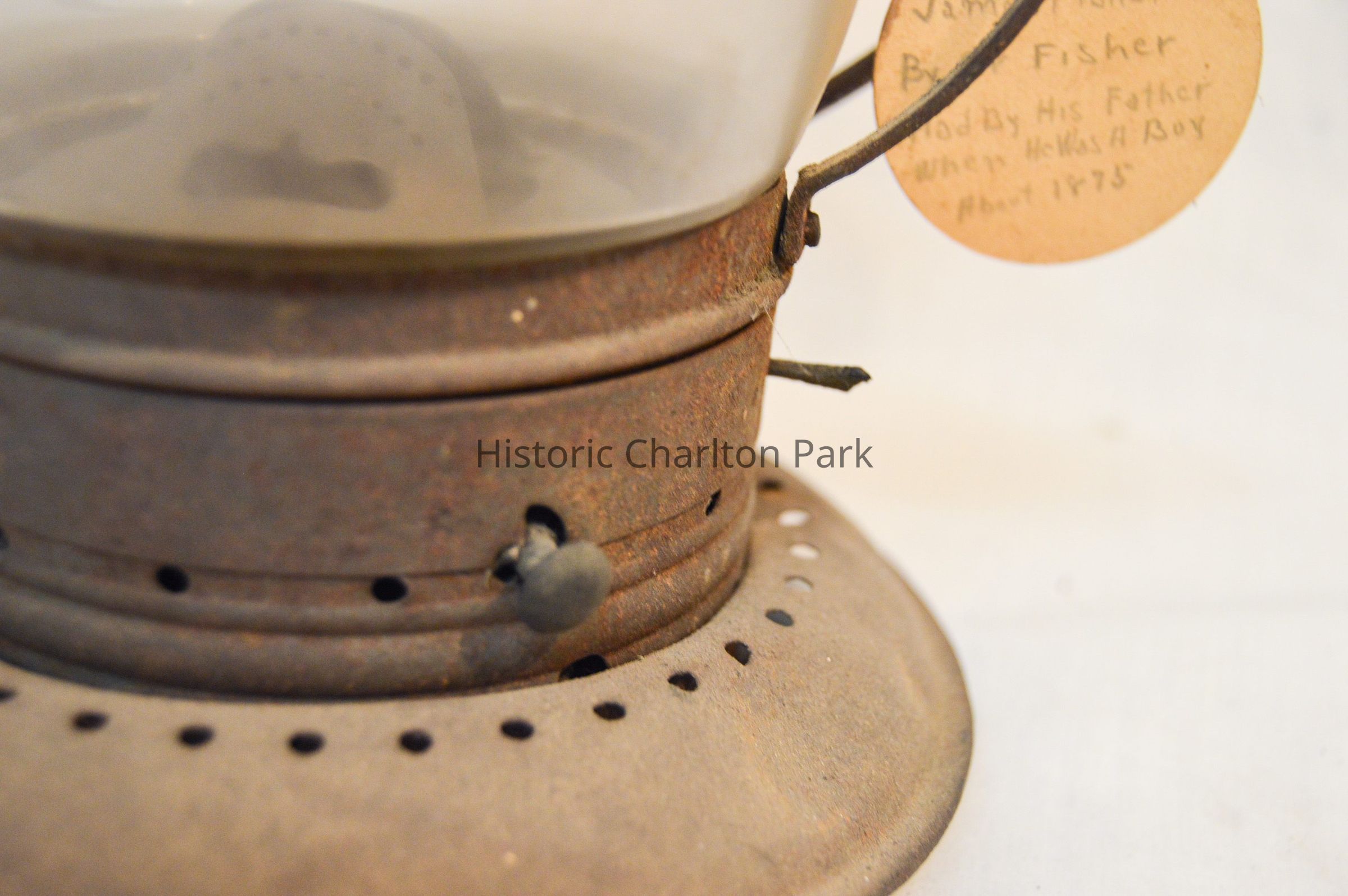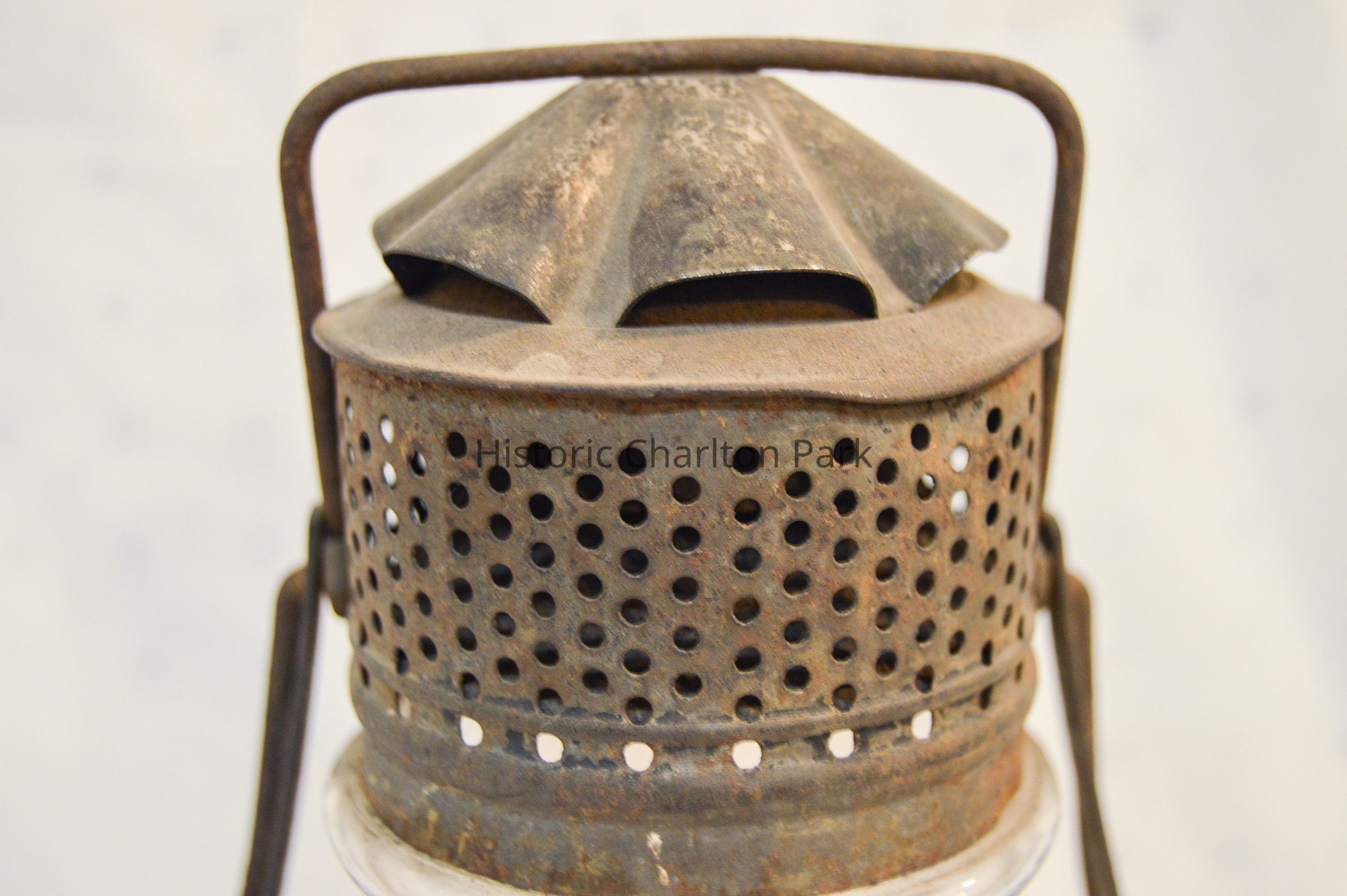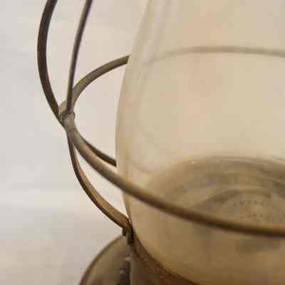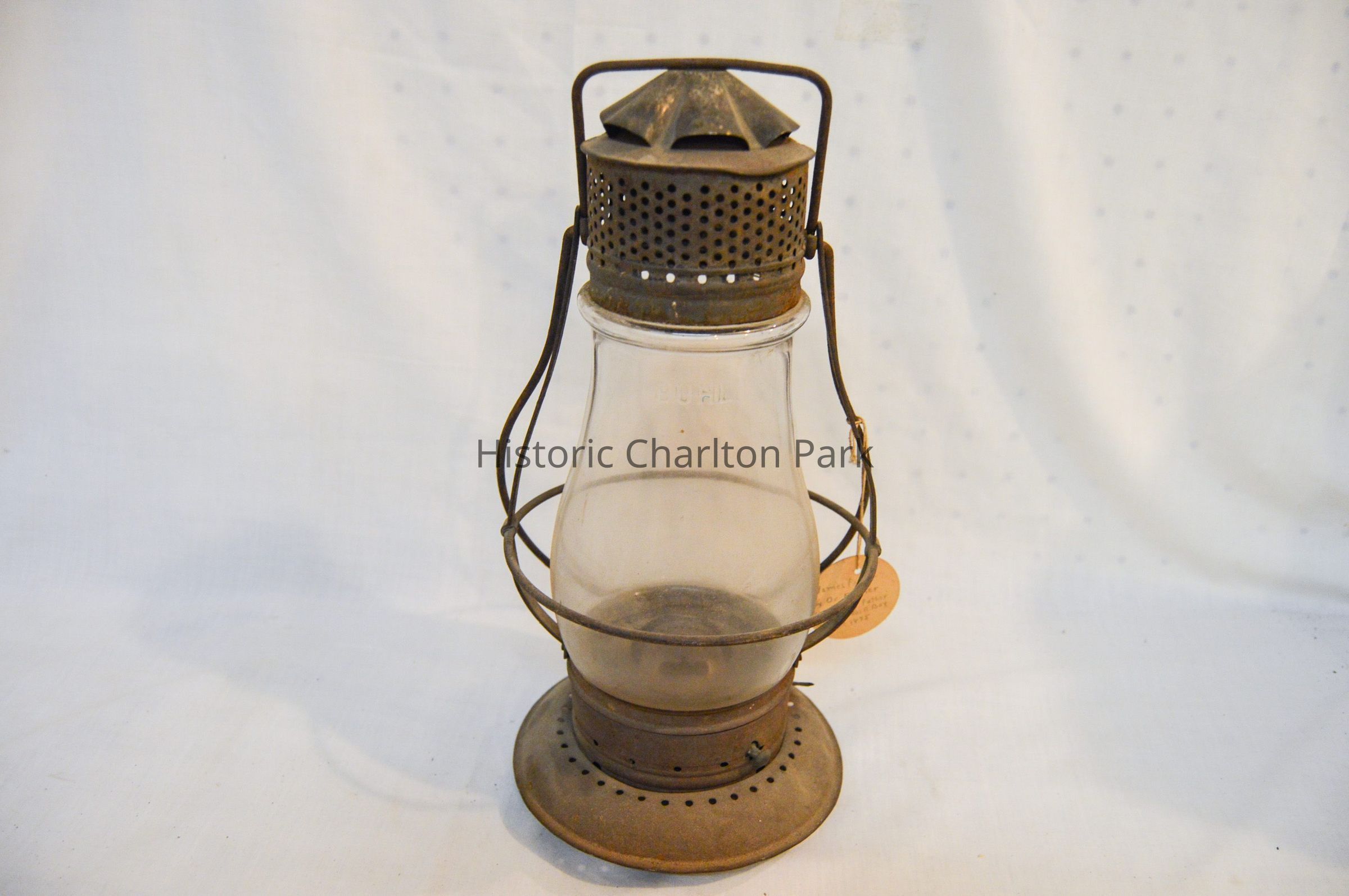 Metal and glass oil lantern with a base made of metal and has a cylindrical shape. There is a metal skirt around the base with circular holes around the inside edge. The base has two protrusions, one of them a small circular knob and the other a pointed piece of metal, both of which are near each other. The base supports the lamp chimney, which is made of clear glass. The glass is round and tapers inward towards the top. The lamp chimney is surrounded by a metal wire frame on two sides. A circular metal wire is attached to this frame and loops around the chimney. The cap to the chimney is made of metal and has a cylindrical shape with circular vents along the side. The top is conical ruffled. A looped metal handle is attached to the cap.Inscription/Signature/Marks