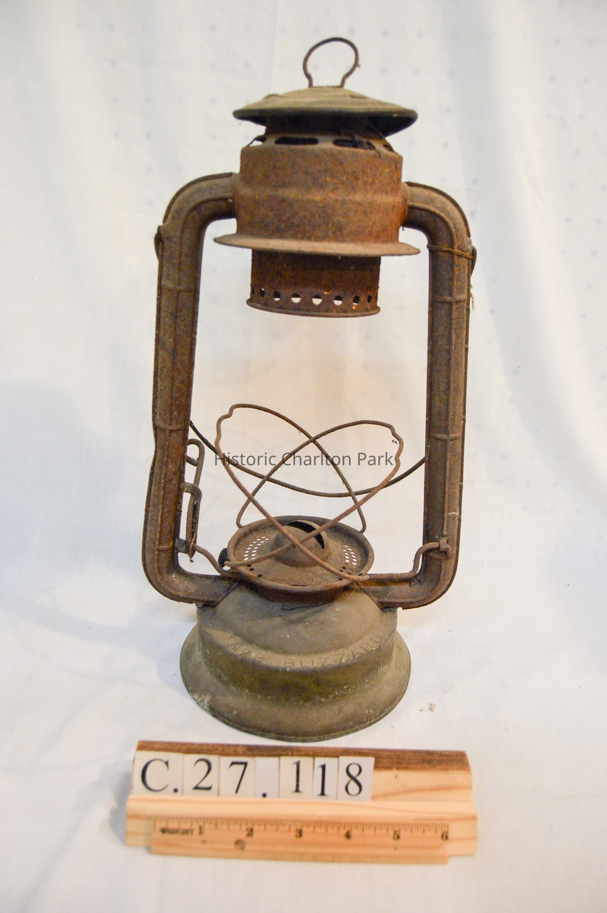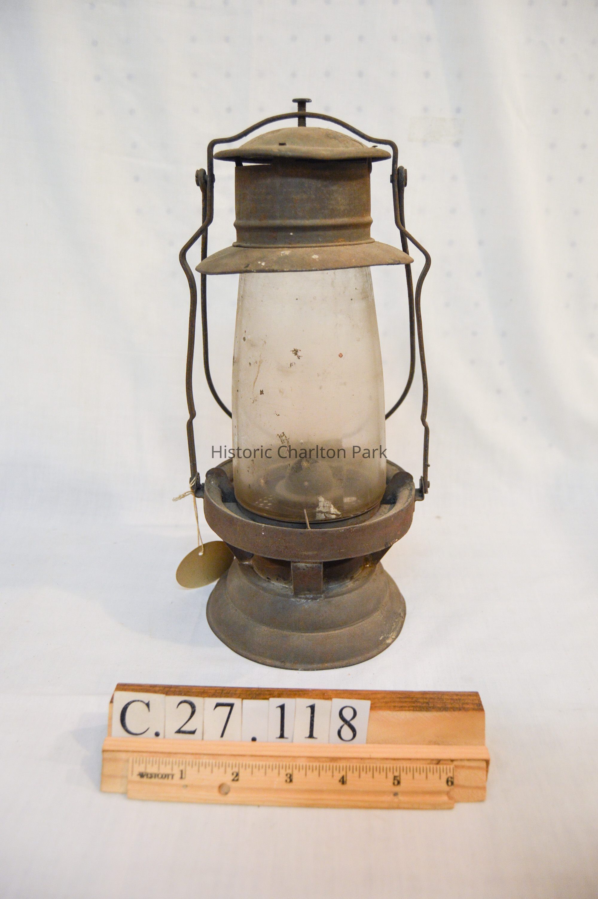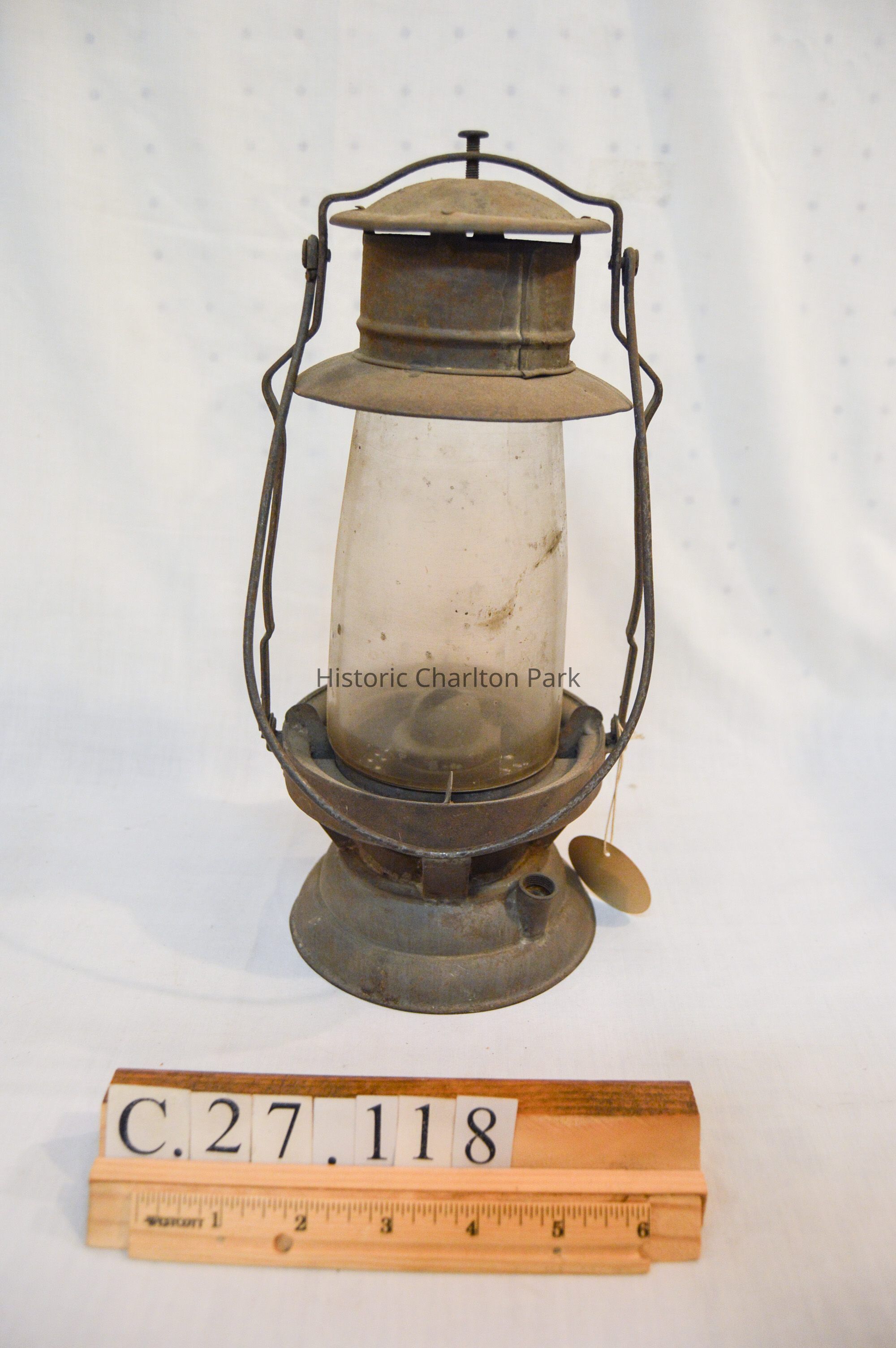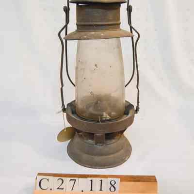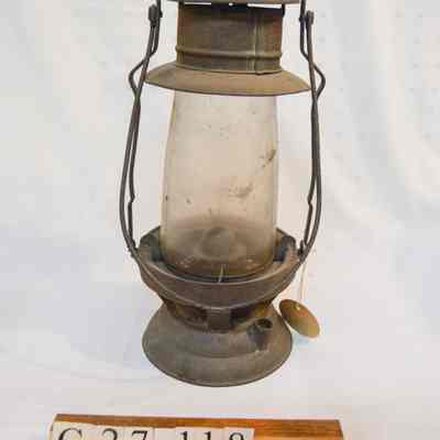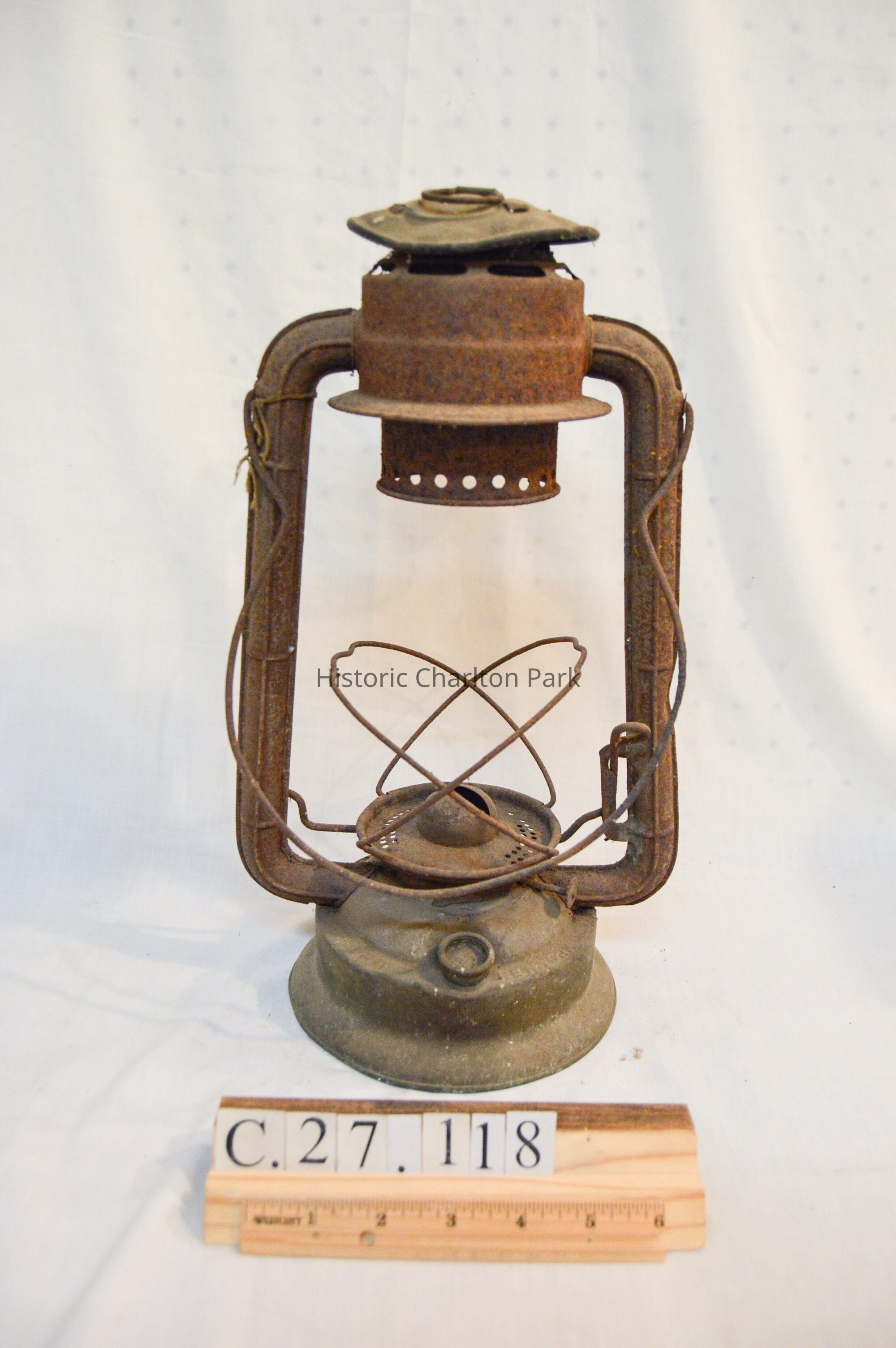 2. Metal kerosene lantern. The lantern has a circular base with a small spout on the front edge. The body of the lamp has a circular holder for the burner held up by four brackets attached to the base. The burner is round and consists of a metal ring with circular vents and a dome-shaped emitter with a slot in the top. There is a cylindrical glass chimney resting on top of the burner. The top of the lamp sits on top of the chimney and has a cylindrical shape with a flat, circular lip around the bottom and a dome-shaped top. The top of the lantern is connected to a two-pronged frame that also attaches to the base, and has a looped metal handle.Inscription/Signature/Marks