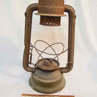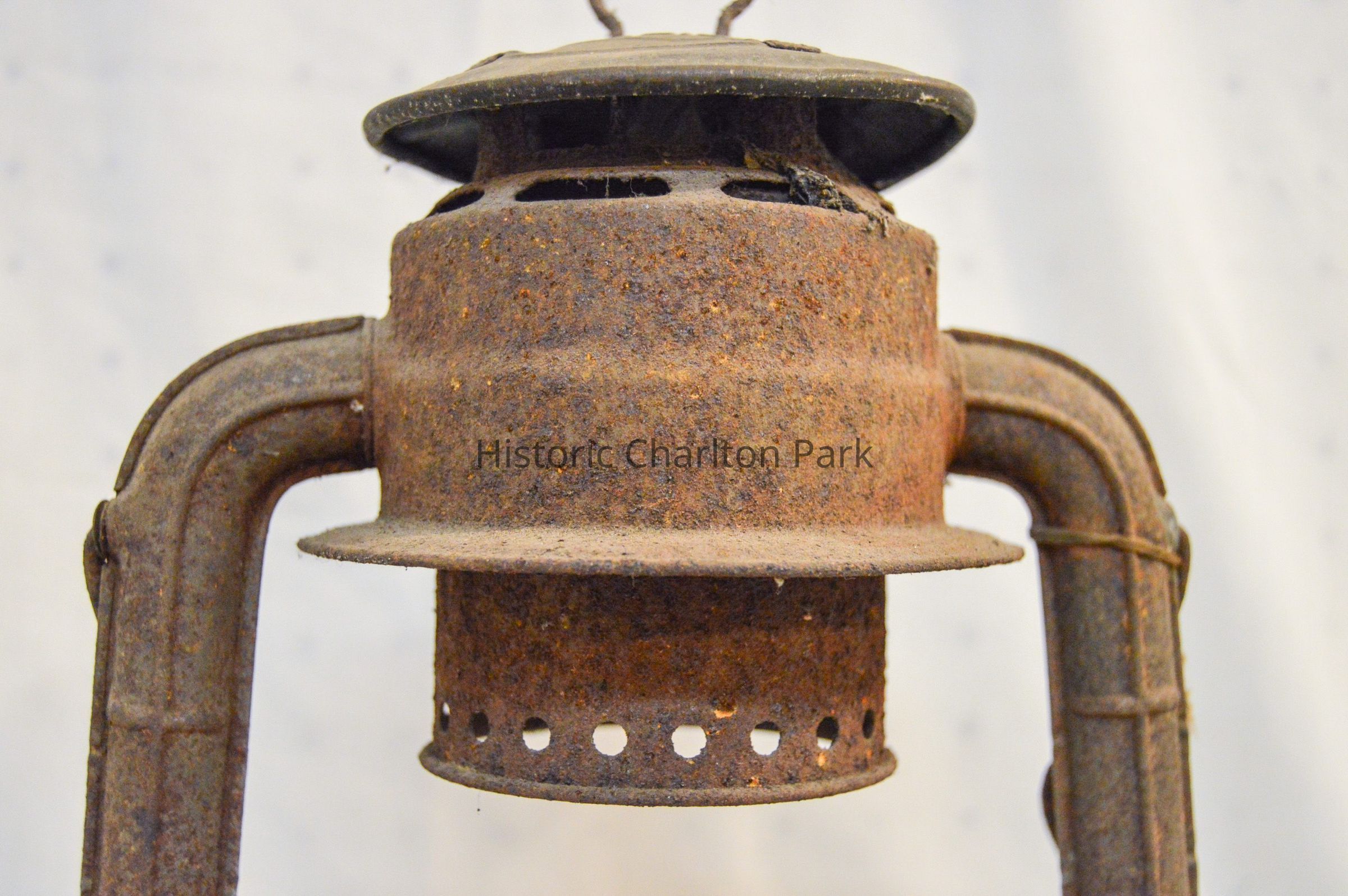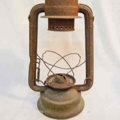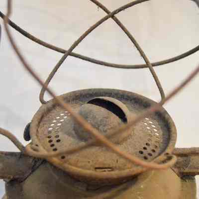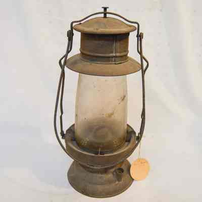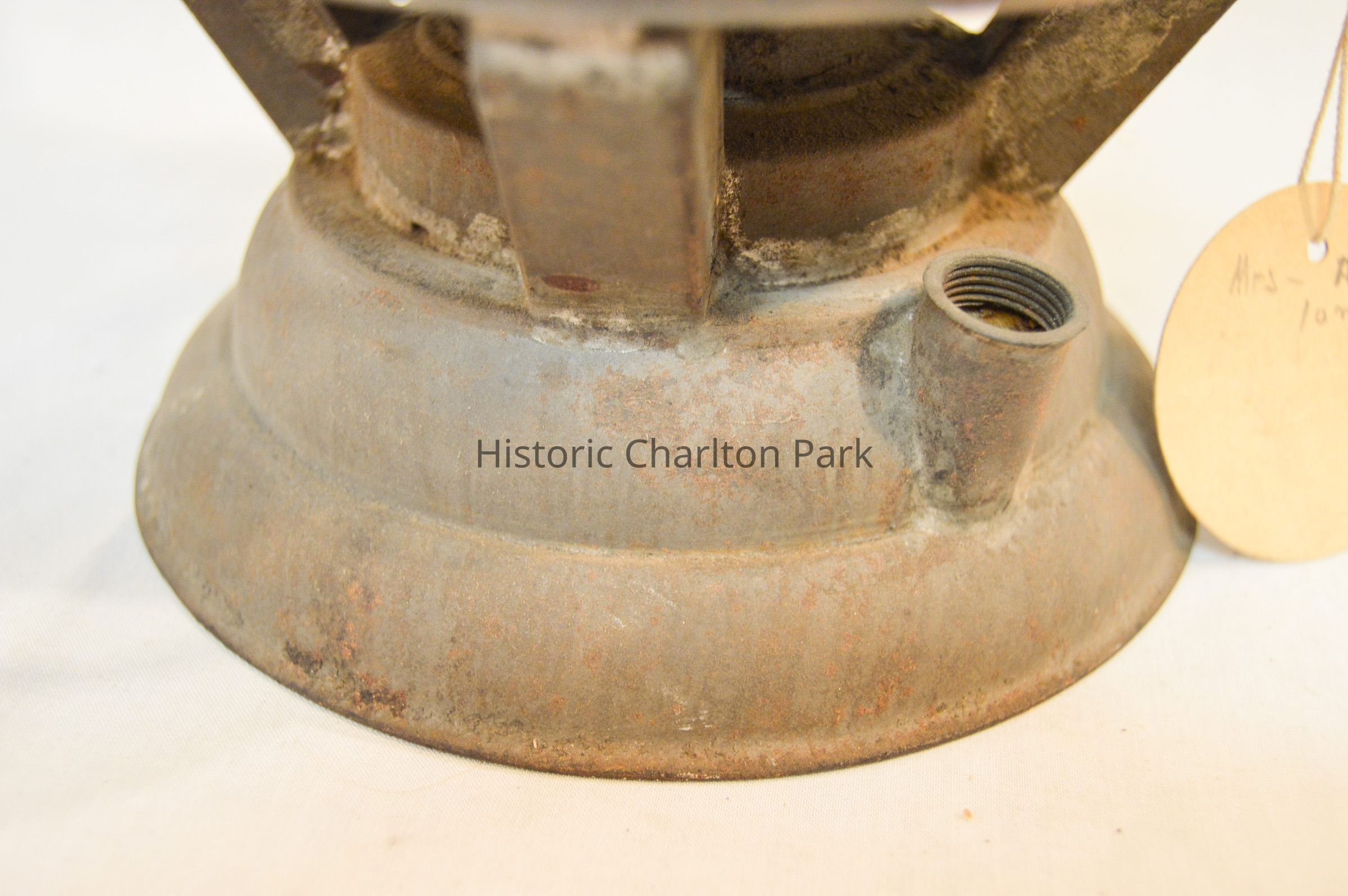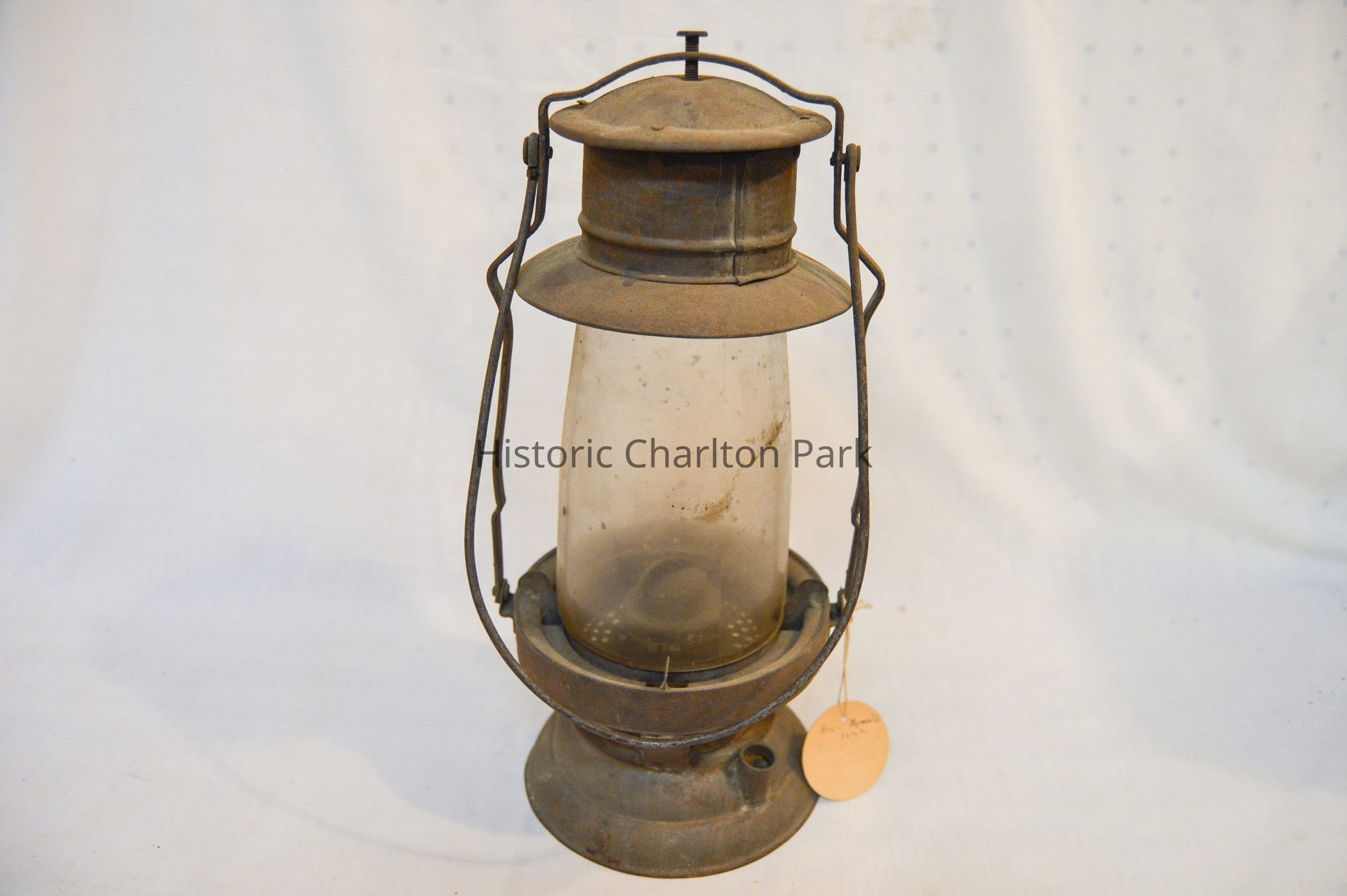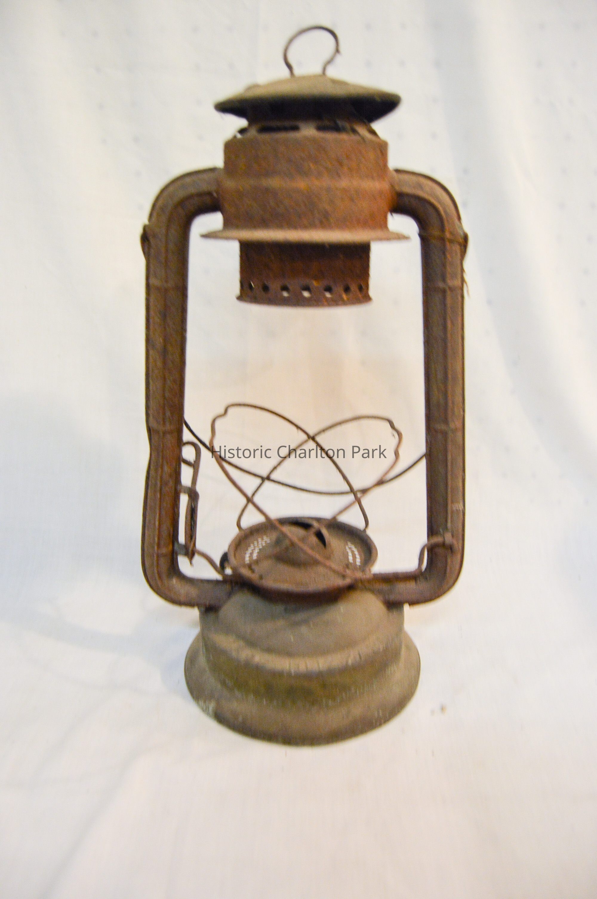 2. Metal kerosene lantern. The lantern has a circular base with a small spout on the front edge. The body of the lamp has a circular holder for the burner held up by four brackets attached to the base. The burner is round and consists of a metal ring with circular vents and a dome-shaped emitter with a slot in the top. There is a cylindrical glass chimney resting on top of the burner. The top of the lamp sits on top of the chimney and has a cylindrical shape with a flat, circular lip around the bottom and a dome-shaped top. The top of the lantern is connected to a two-pronged frame that also attaches to the base, and has a looped metal handle.Inscription/Signature/Marks