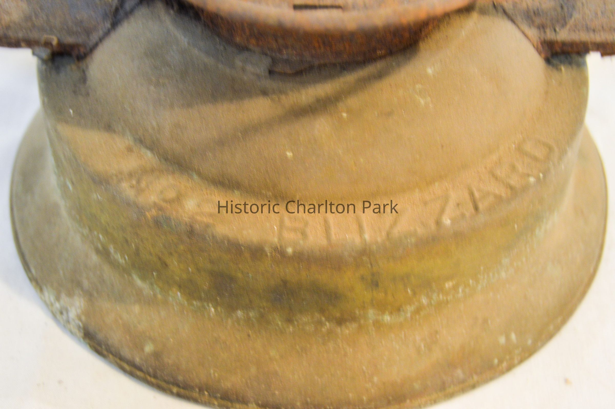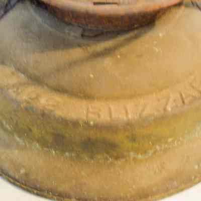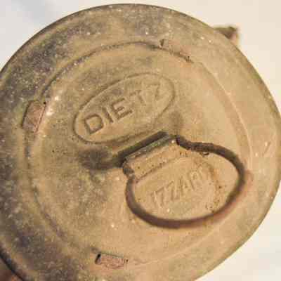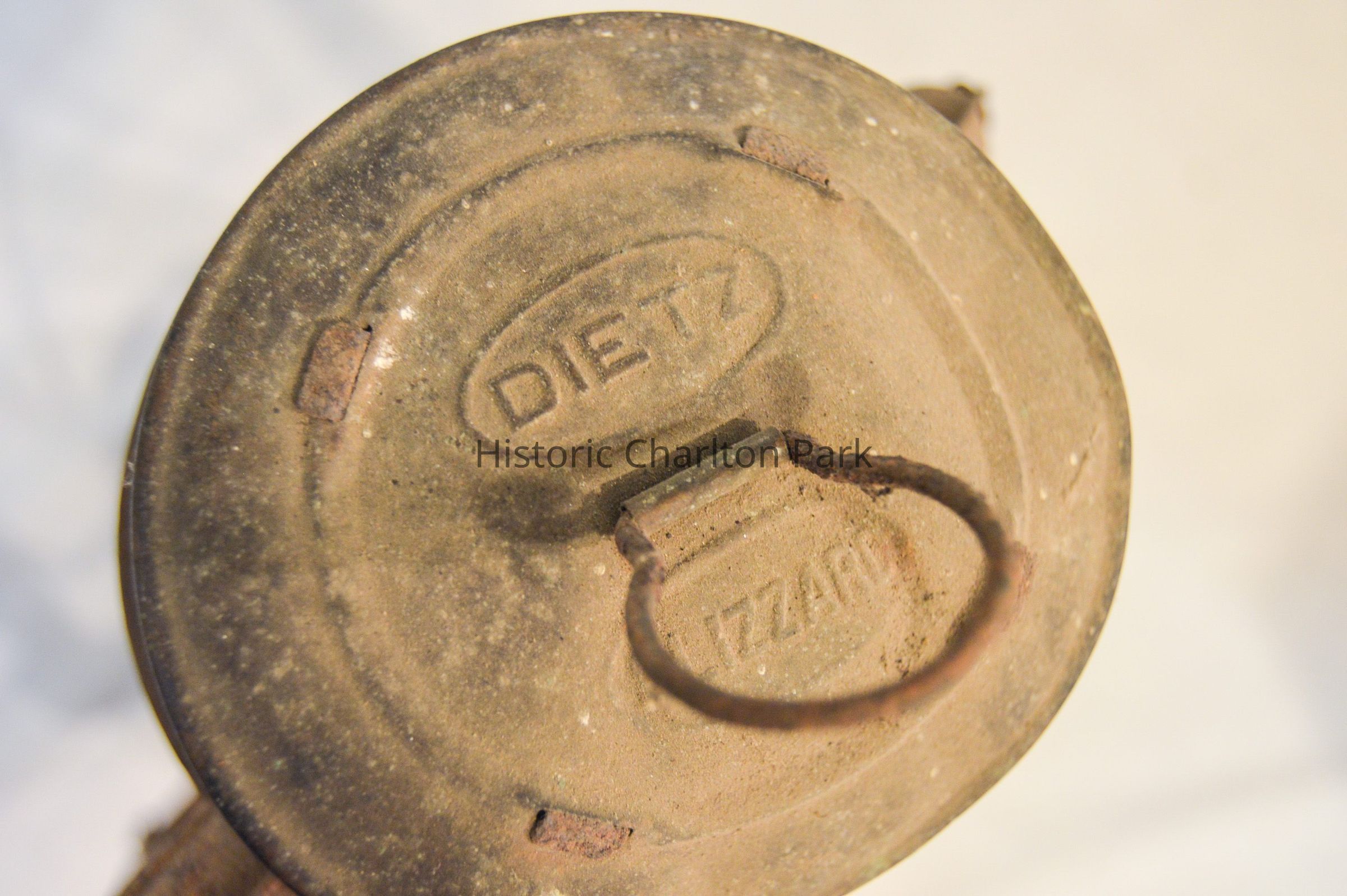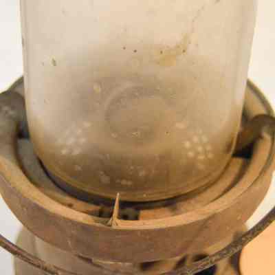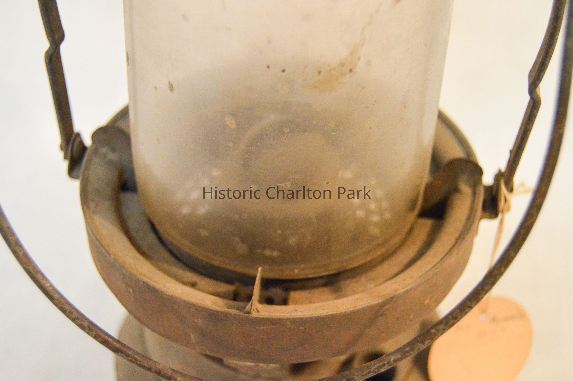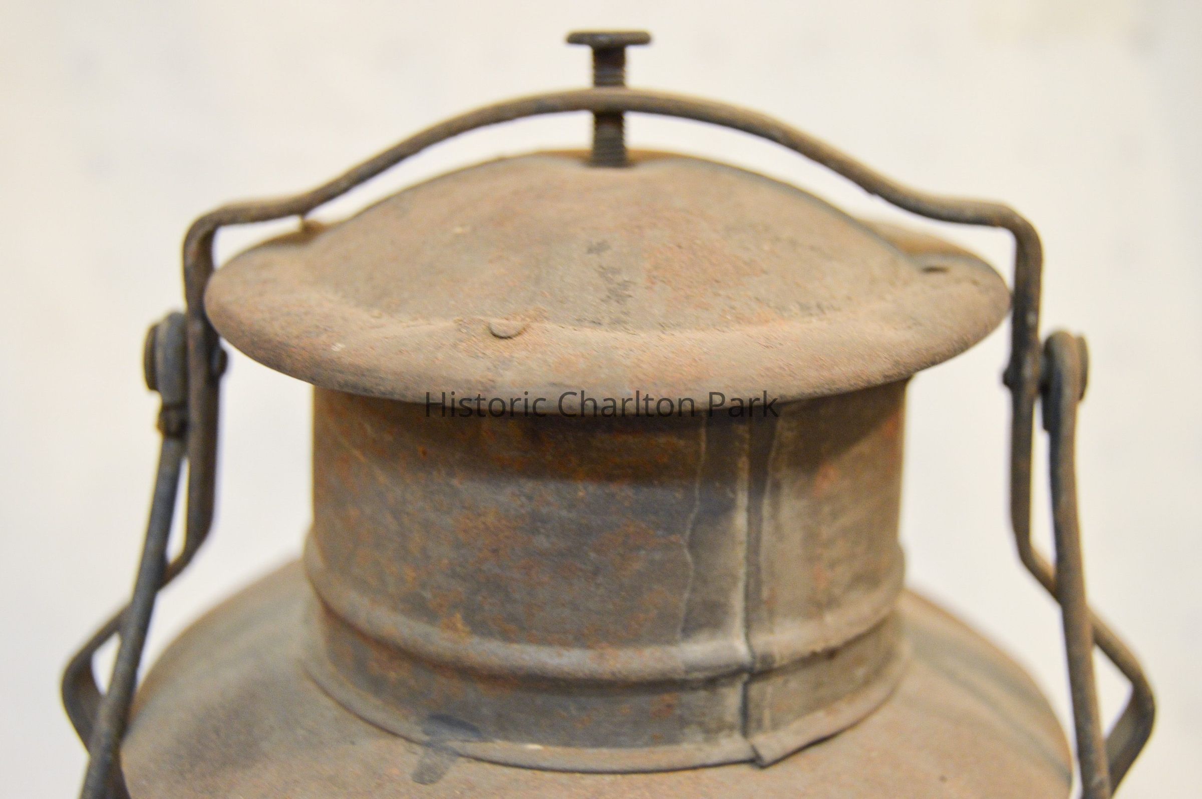 2. Metal kerosene lantern. The lantern has a circular base with a small spout on the front edge. The body of the lamp has a circular holder for the burner held up by four brackets attached to the base. The burner is round and consists of a metal ring with circular vents and a dome-shaped emitter with a slot in the top. There is a cylindrical glass chimney resting on top of the burner. The top of the lamp sits on top of the chimney and has a cylindrical shape with a flat, circular lip around the bottom and a dome-shaped top. The top of the lantern is connected to a two-pronged frame that also attaches to the base, and has a looped metal handle.Inscription/Signature/Marks
