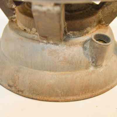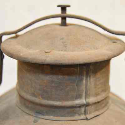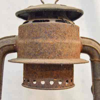 1. Kerosene barn lantern made of metal. The base of the lantern is cylindrical and has a fuel cap on the front. The burner sits on top of the base and consists of a metal ring with crossed metal wires above it and a dome-shaped burner in the center. The burner has a slot in the top and a knob below that adjust the flame level. The frame of the lantern consists of two large, cylindrical arms on either side that hold up the cylindrical top. The top of the lantern has vents at the top and bottom edges and a slightly dome-shaped cap with a small, circular handle. There is a large, looped handle attached to the arms of the frame. The lantern is missing a glass chimney.