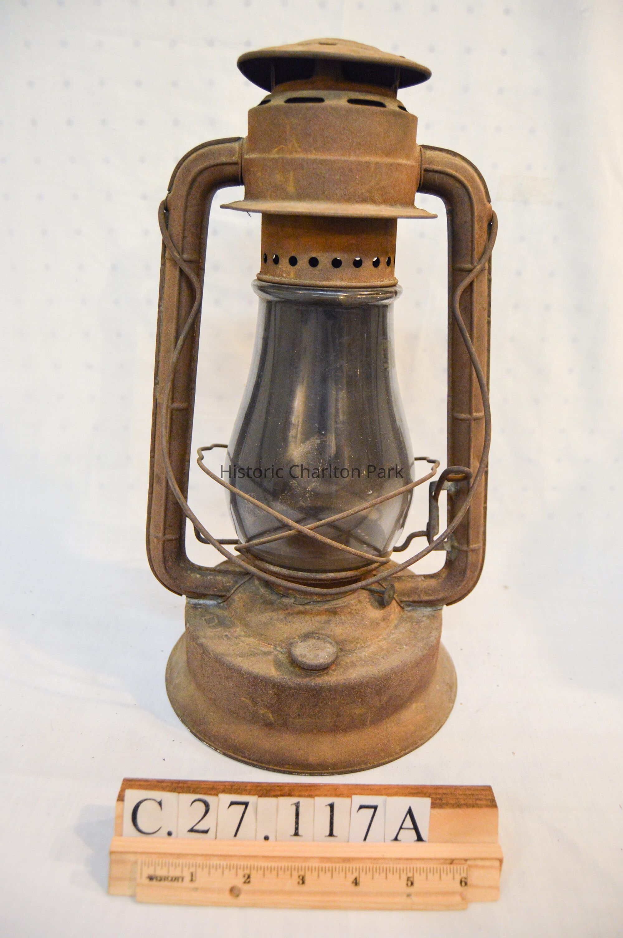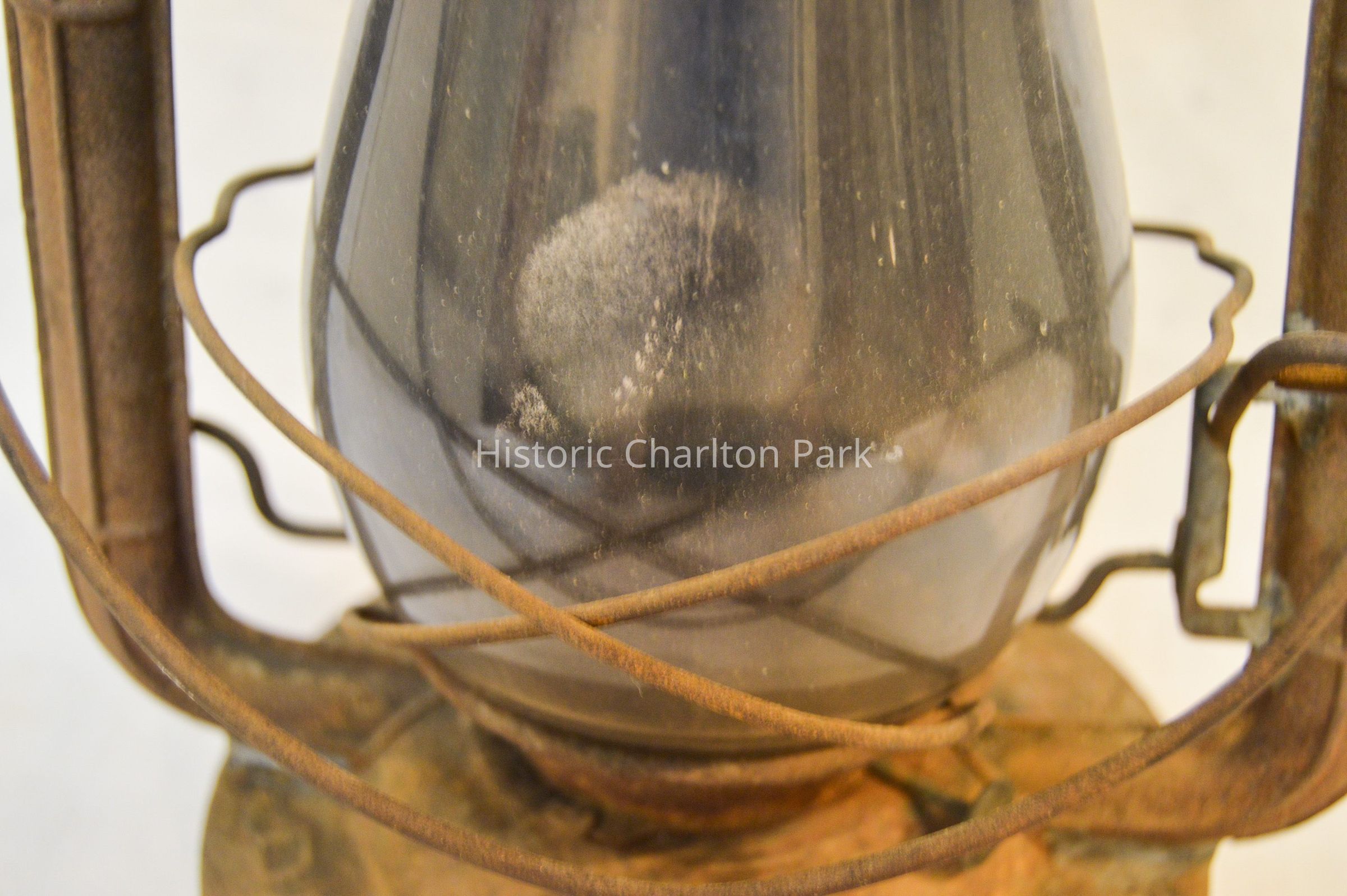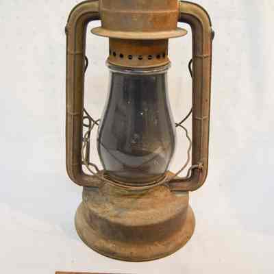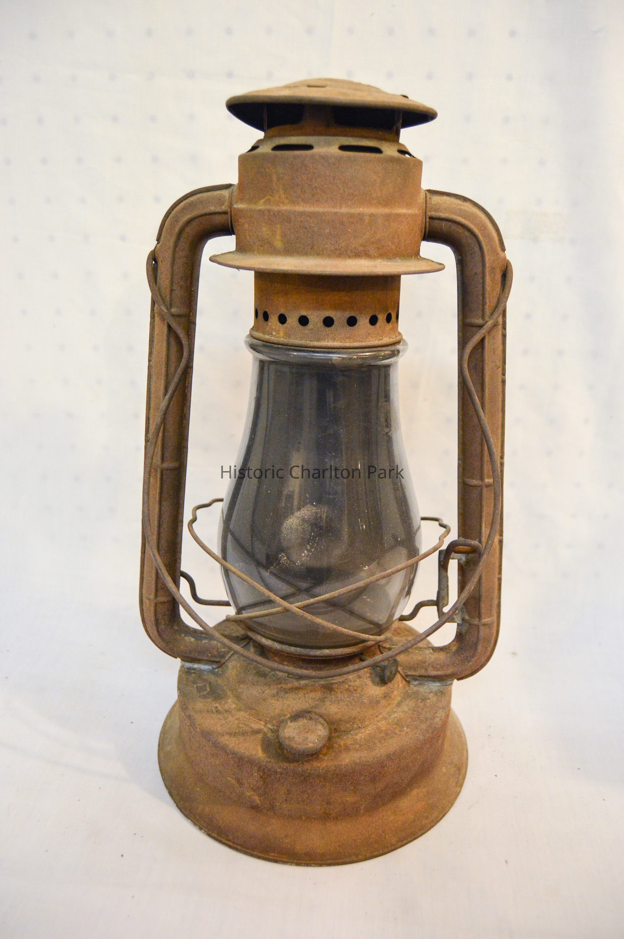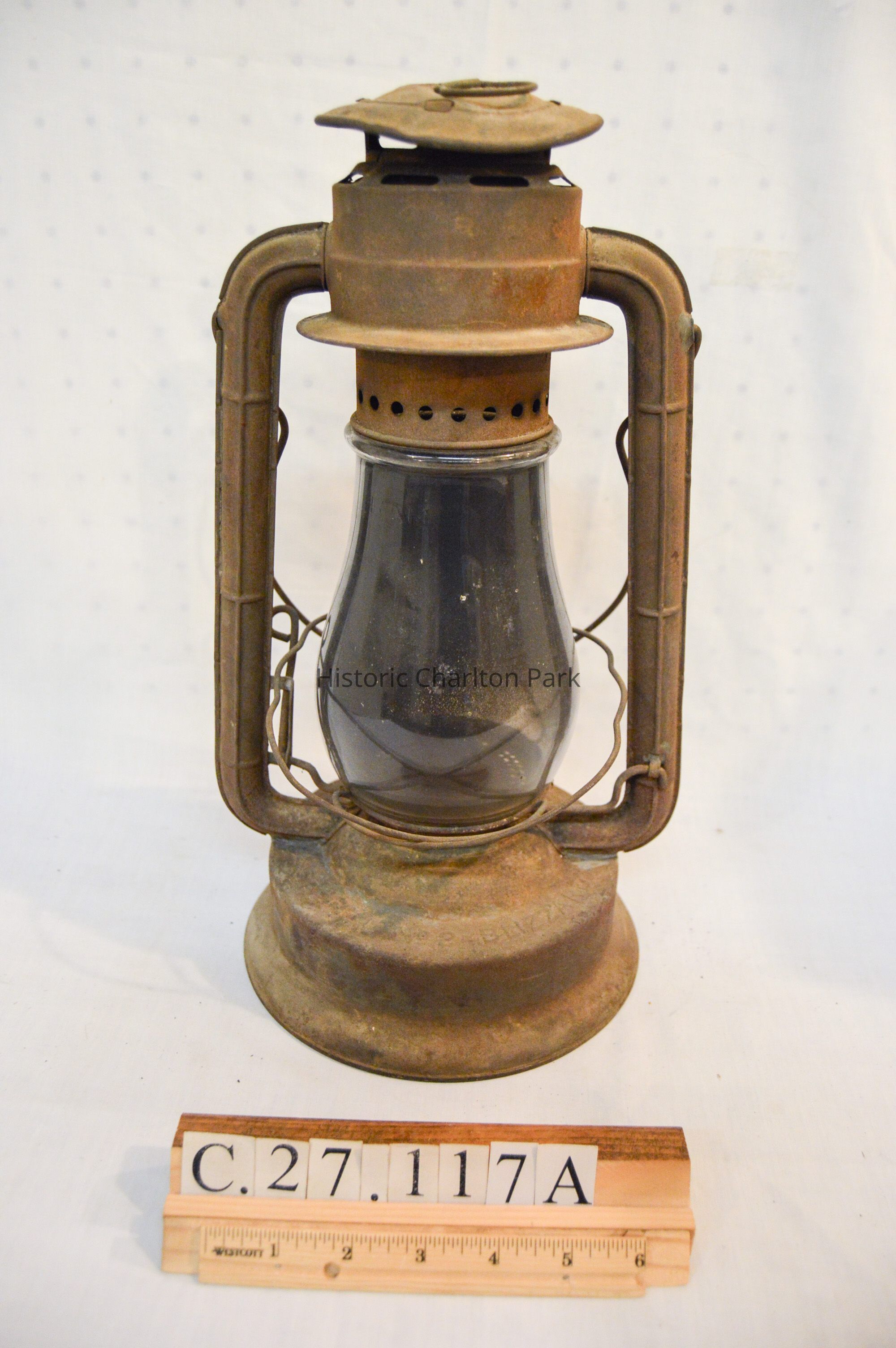 Large kerosene lantern with a cylindrical base and a lip around the bottom. There is a fuel cap on the front and a burner in the center. The burner consists of a round, wick-adjusting knob, a metal ring with circular vents, and a dome-shaped emitter with an opening on top for the wick. The glass chimney is pear-shaped and sits on top of the burner. The glass is tinted dark gray with soot on the inside. The chimney is enclosed by crossed metal wires around the bottom. The frame of the lantern is large and rectangular, extending on either side of the chimney and covering it at the top with a cylindrical cap. The bottom edge of the cap has circular vents, and the top has ovular vents. There is a flat portion at the very top with an inscription and a small, circular handle. A larger handle is attached to the fame.Inscription/Signature/Marks