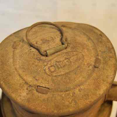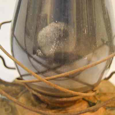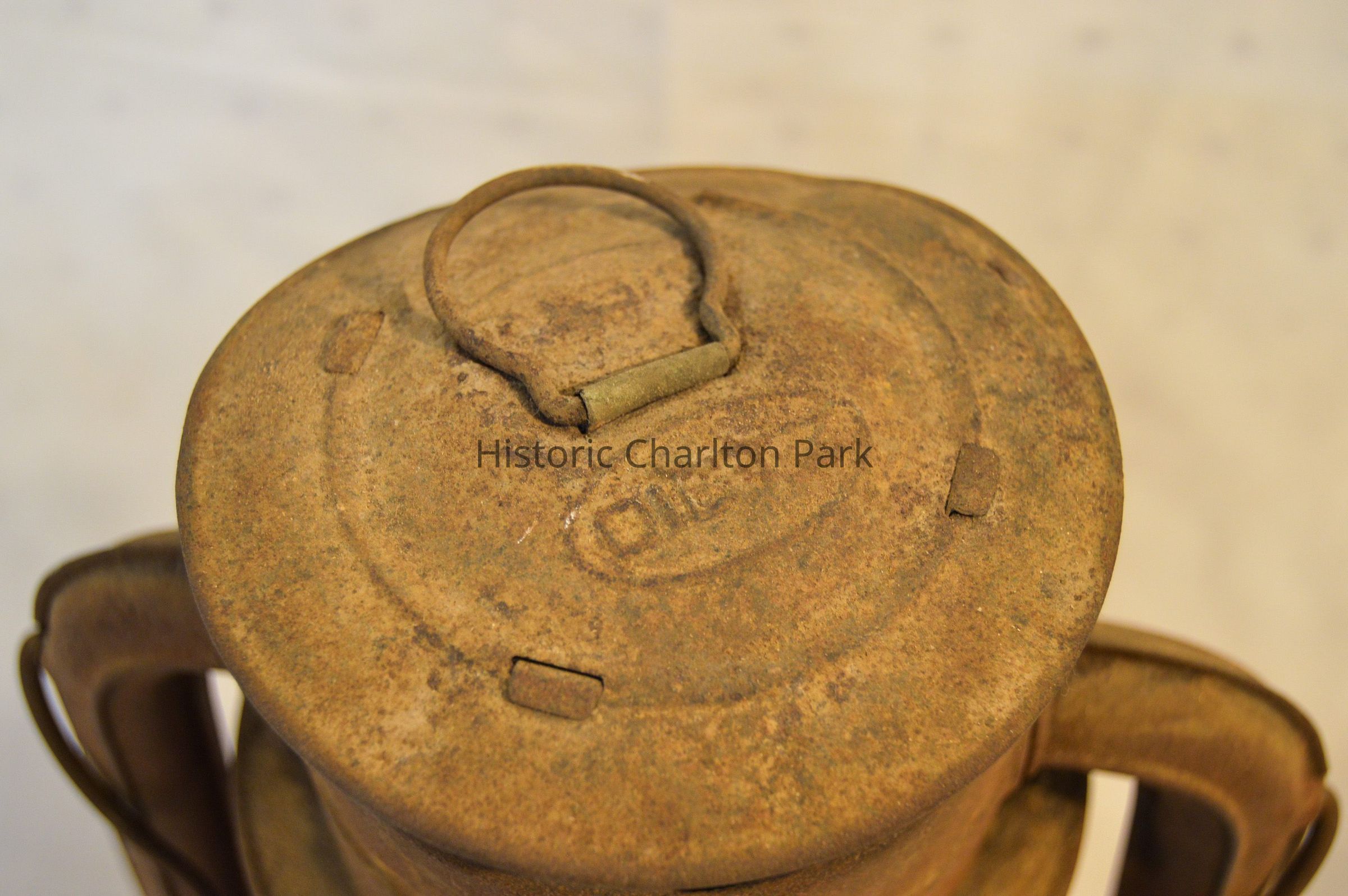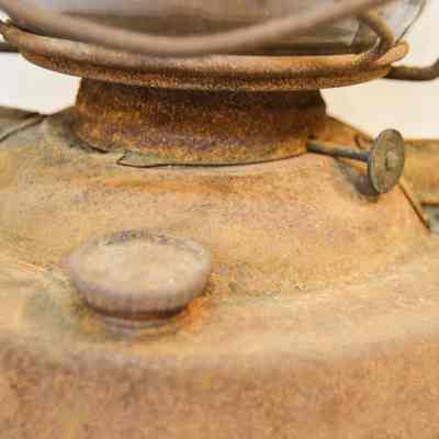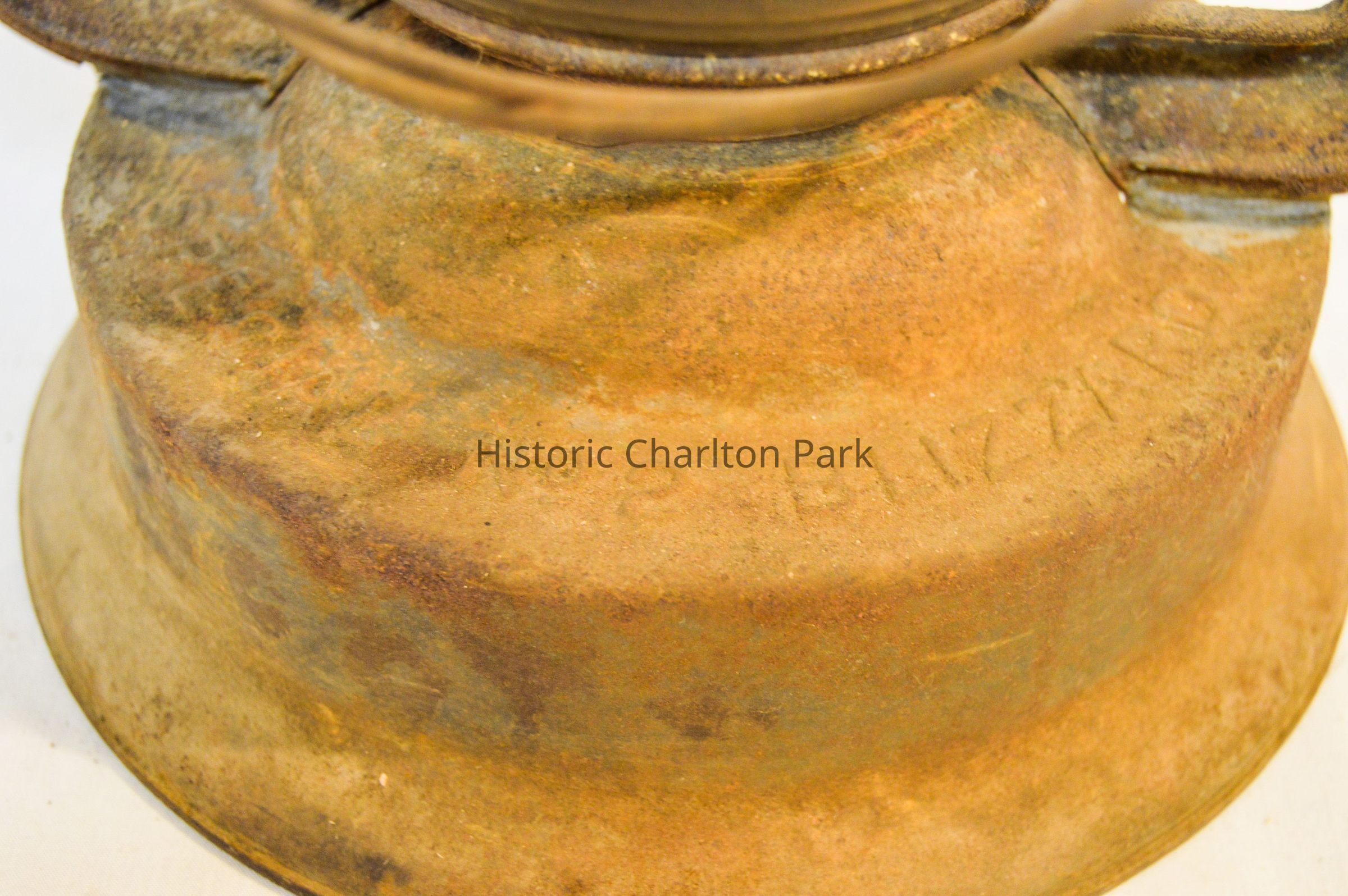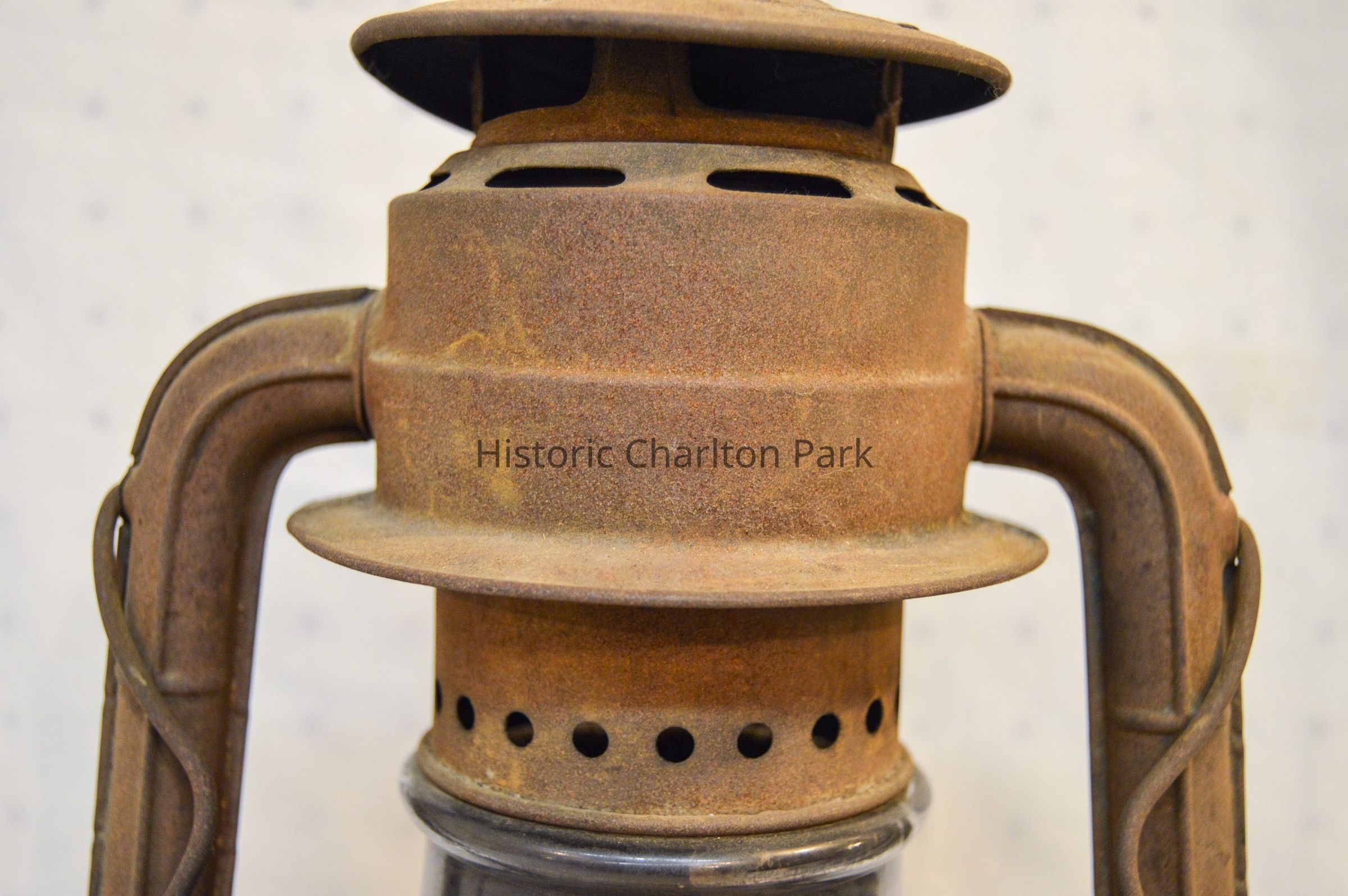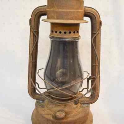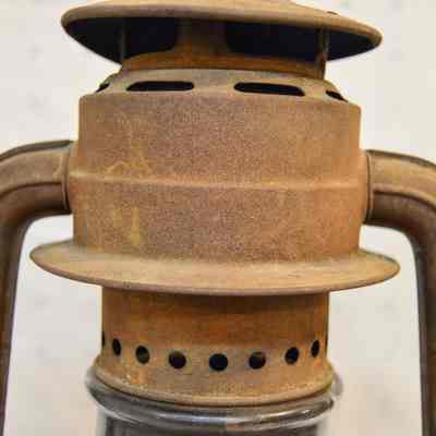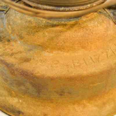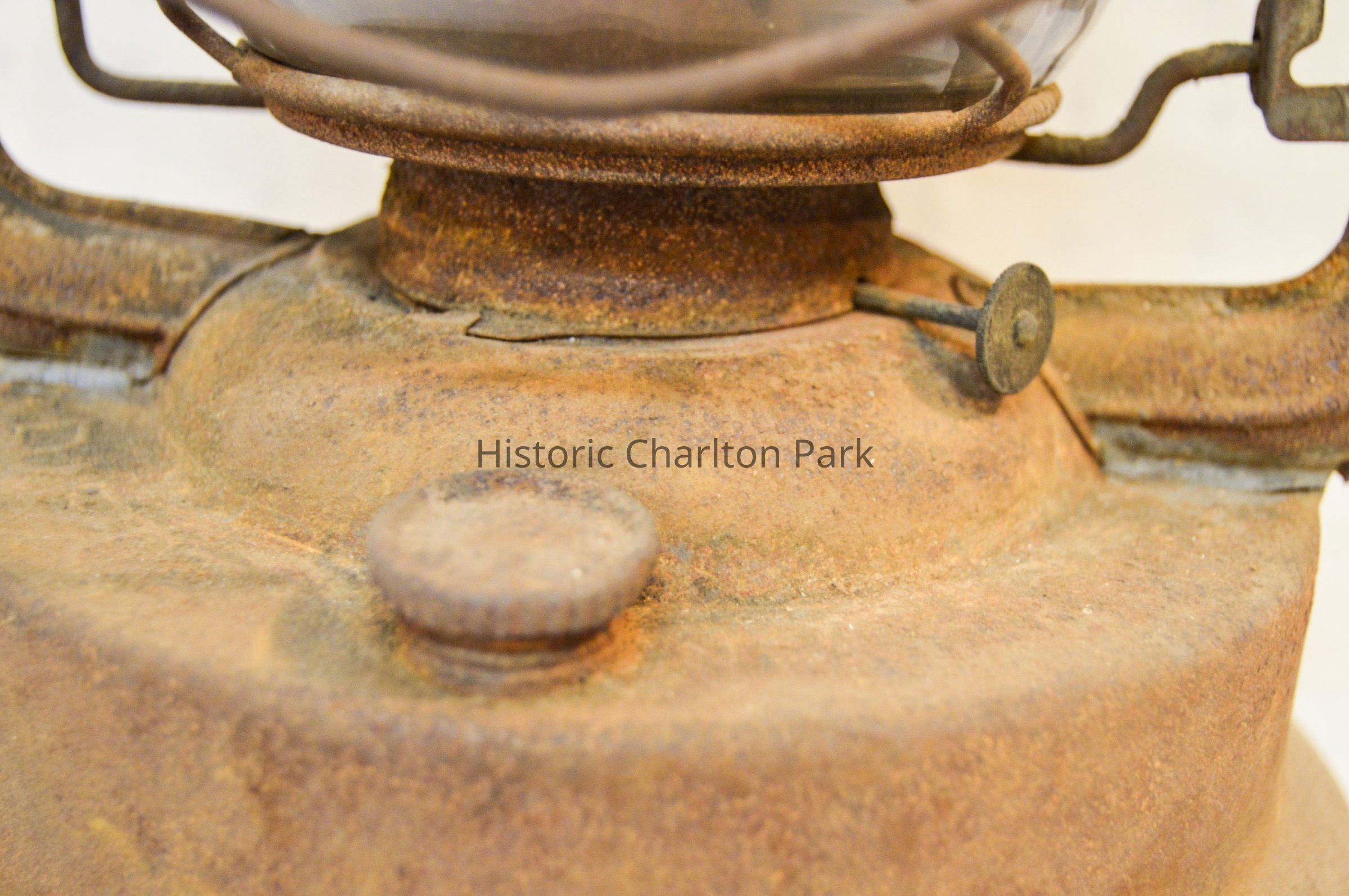 Large kerosene lantern with a cylindrical base and a lip around the bottom. There is a fuel cap on the front and a burner in the center. The burner consists of a round, wick-adjusting knob, a metal ring with circular vents, and a dome-shaped emitter with an opening on top for the wick. The glass chimney is pear-shaped and sits on top of the burner. The glass is tinted dark gray with soot on the inside. The chimney is enclosed by crossed metal wires around the bottom. The frame of the lantern is large and rectangular, extending on either side of the chimney and covering it at the top with a cylindrical cap. The bottom edge of the cap has circular vents, and the top has ovular vents. There is a flat portion at the very top with an inscription and a small, circular handle. A larger handle is attached to the fame.Inscription/Signature/Marks