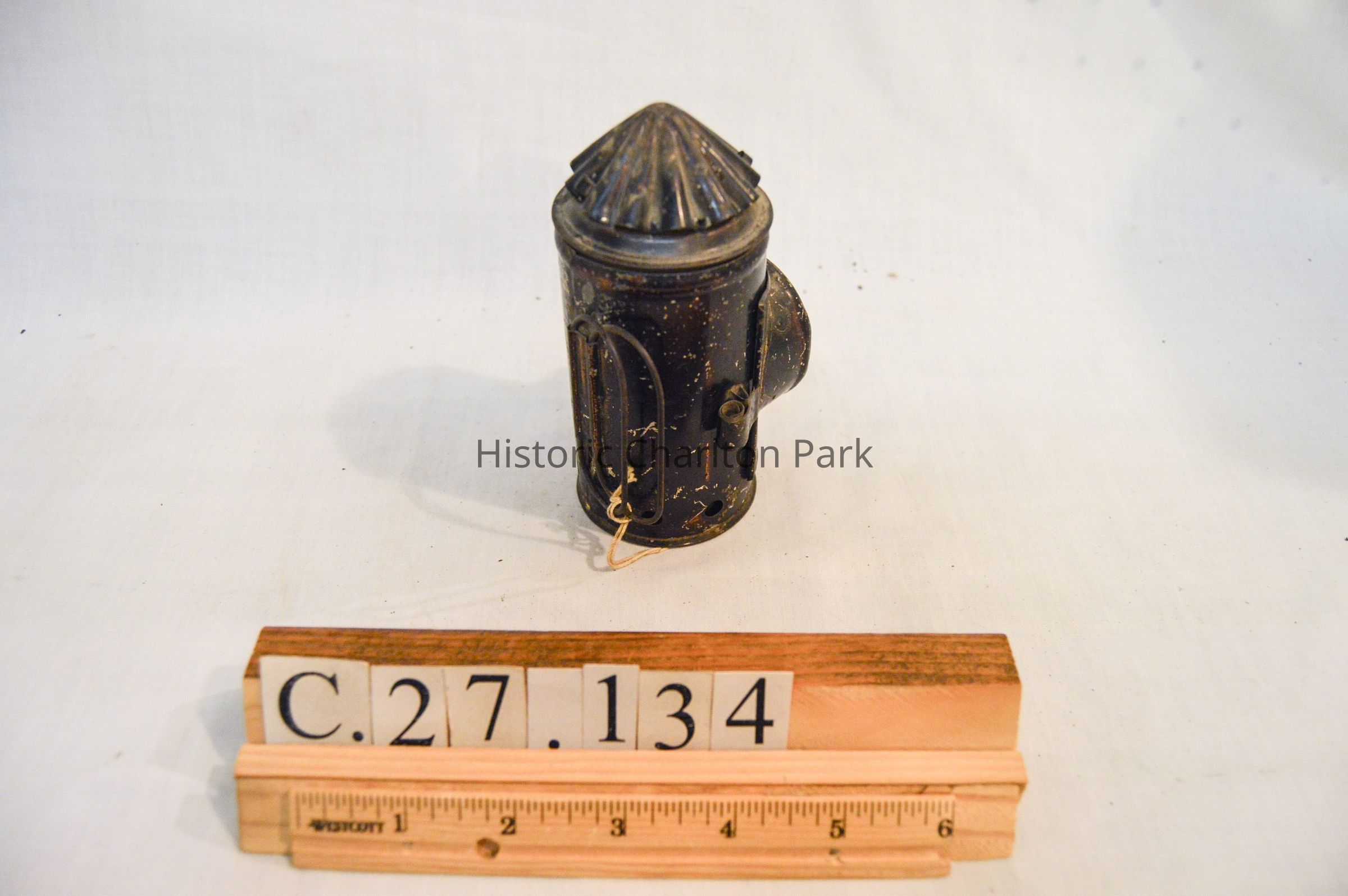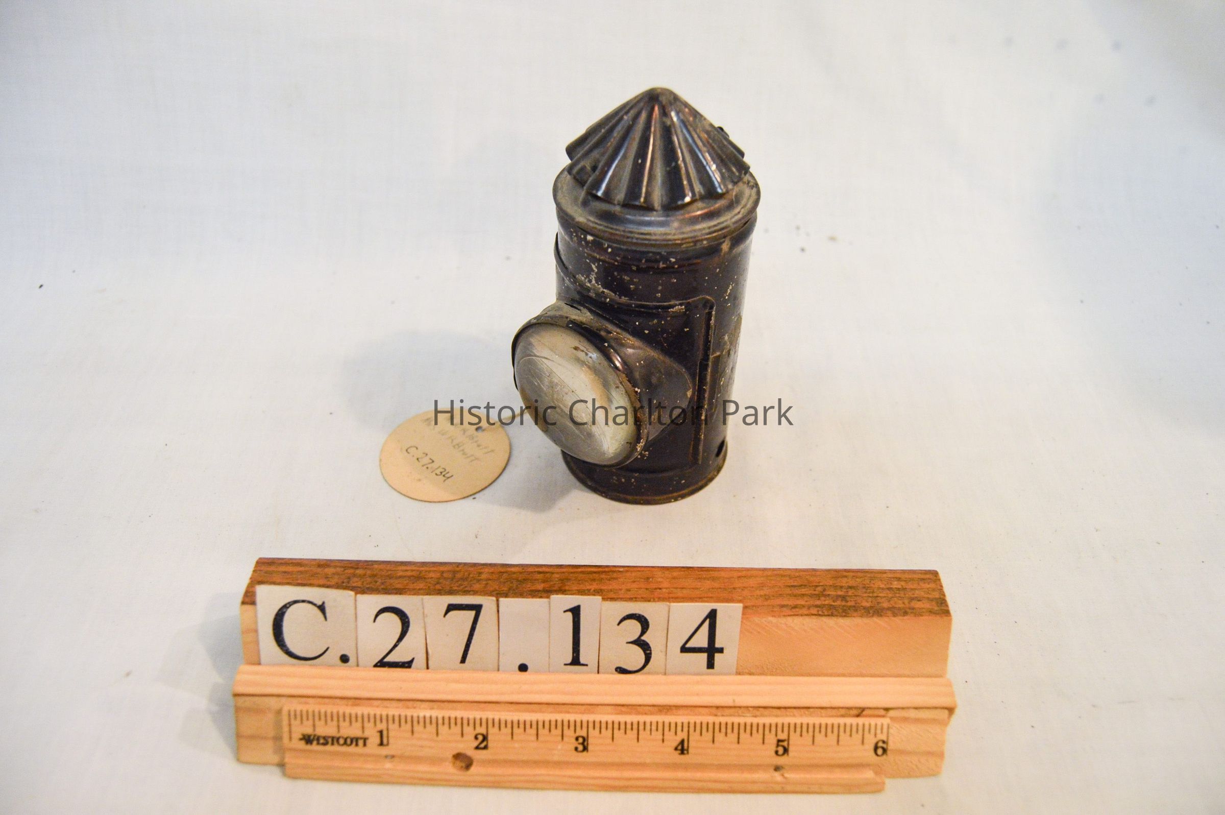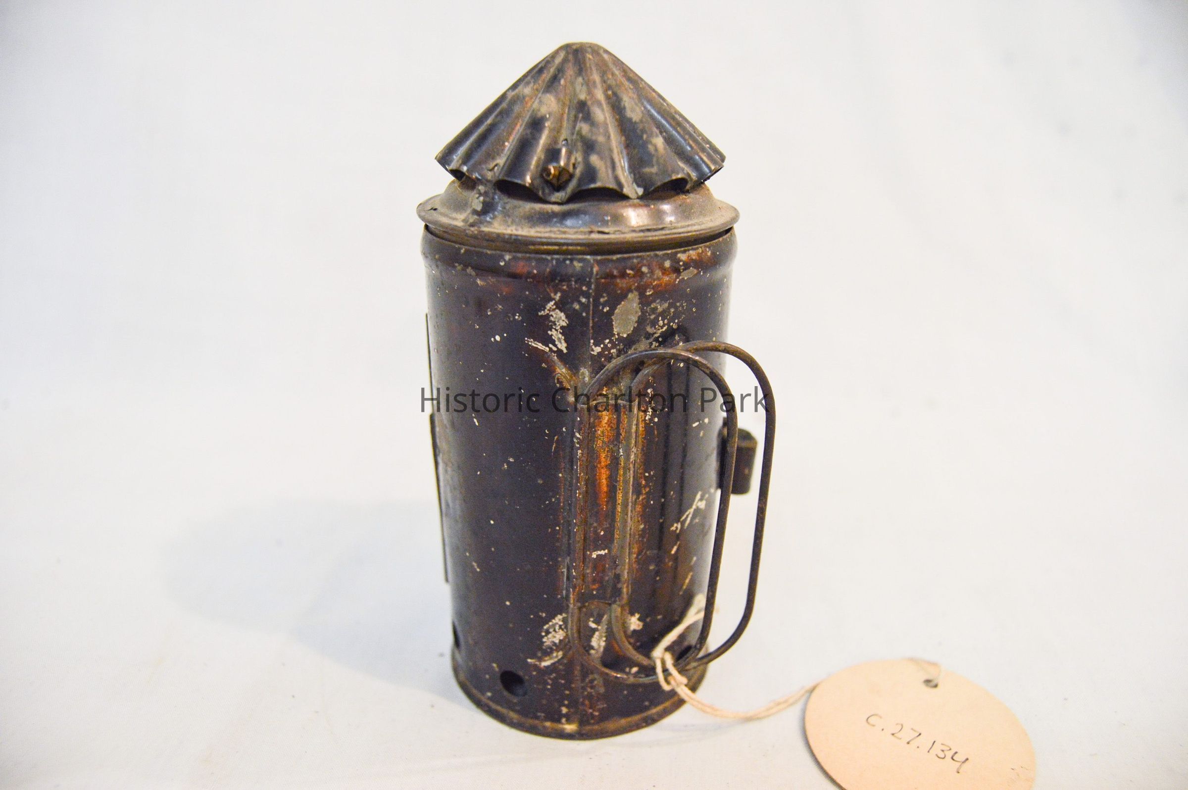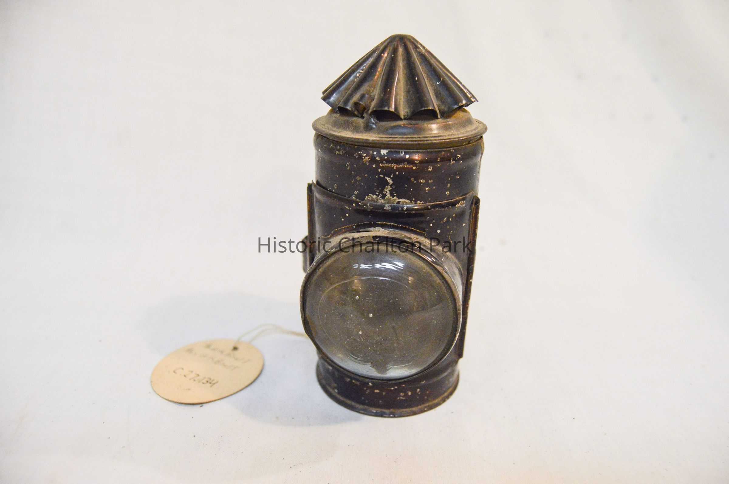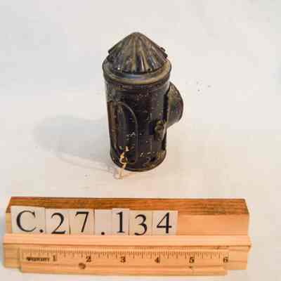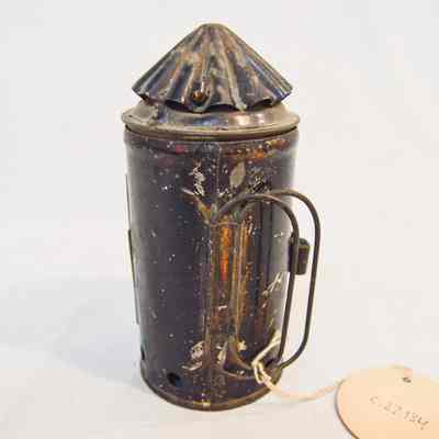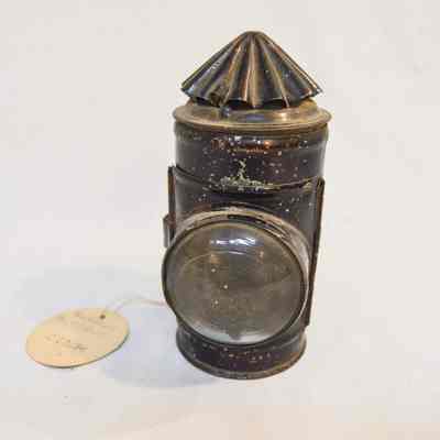 Small mining lantern made of metal and painted black. The lantern has a cylindrical body and a conical top. The front of the lantern has a door that opens via hinge and clasps shut, which also houses the glass screen. There is a double metal wire handle on the back with an ovular shape. The conical top has vertical ruffles. The inside of the lamp has two rectangular glass plates, one green and one red.Dimensions