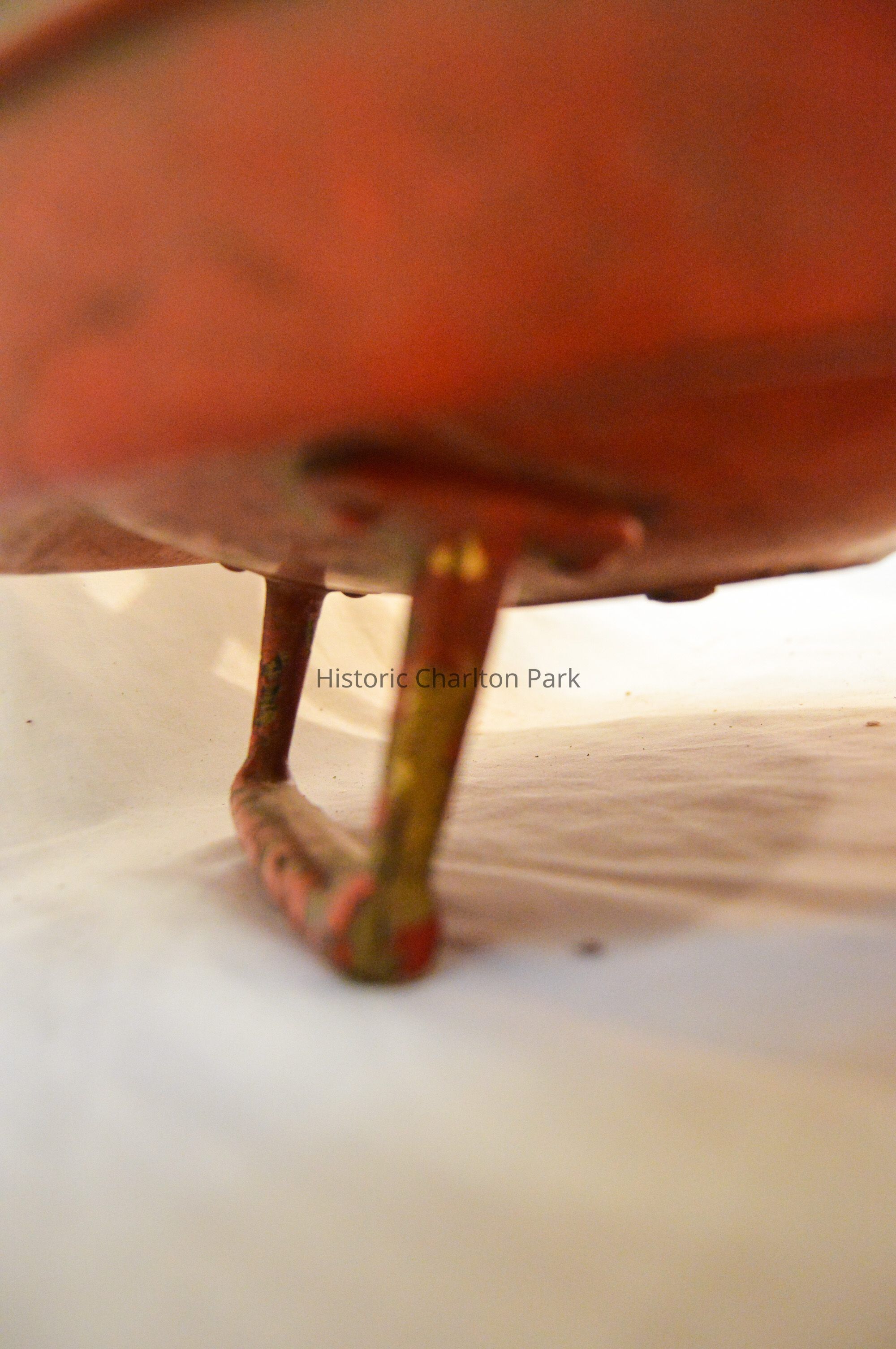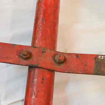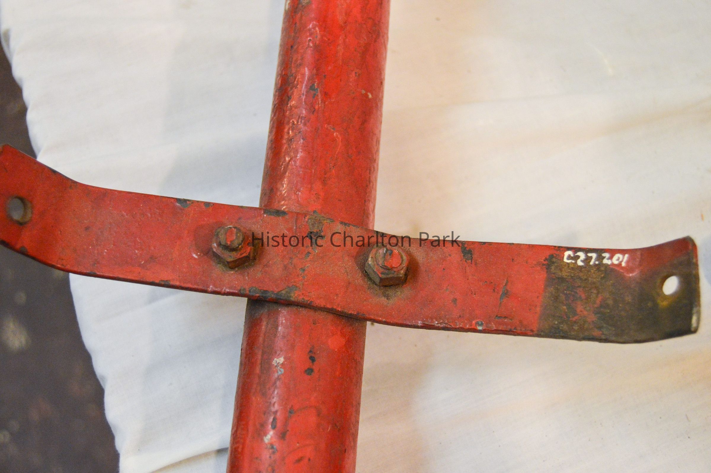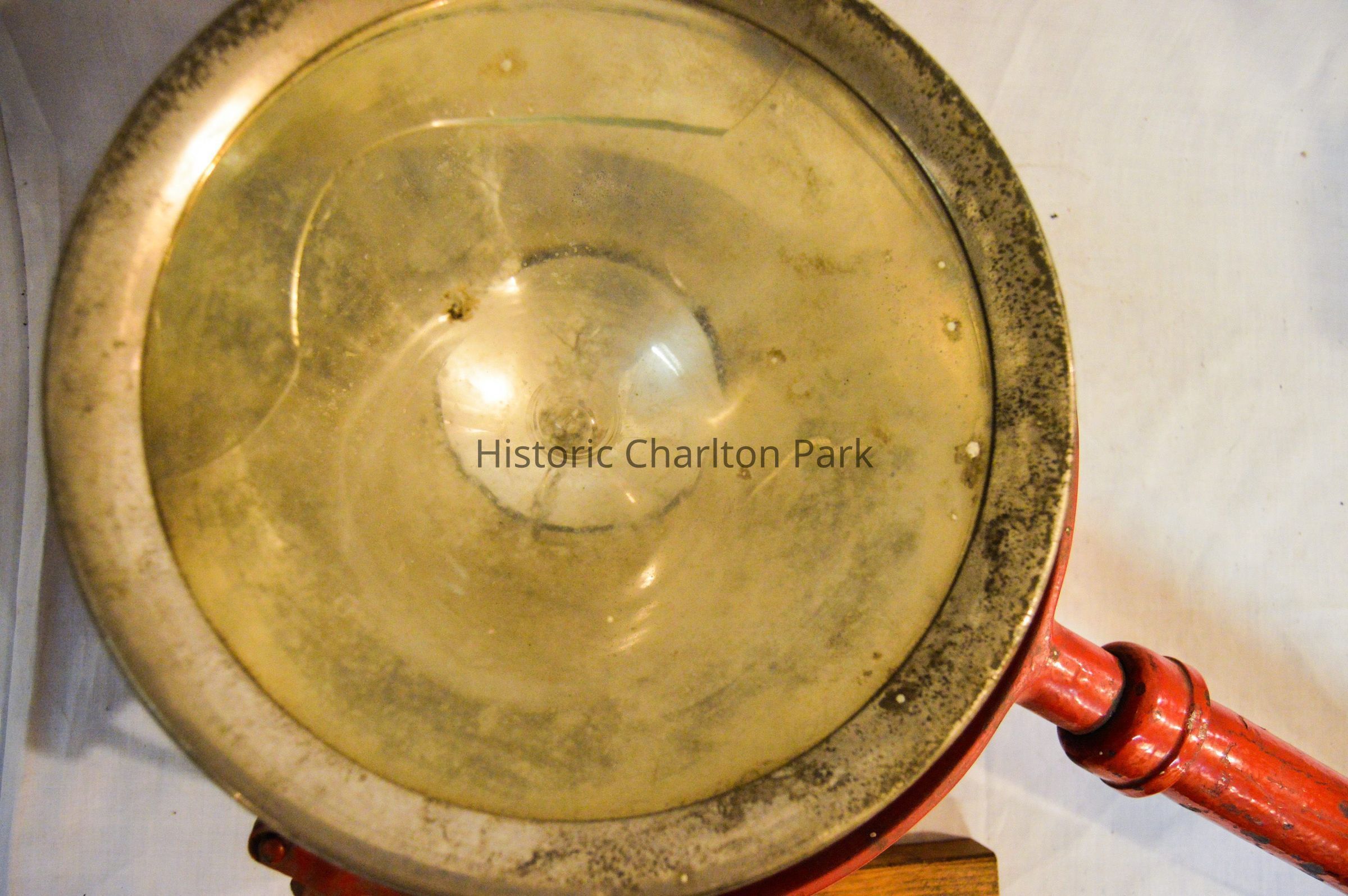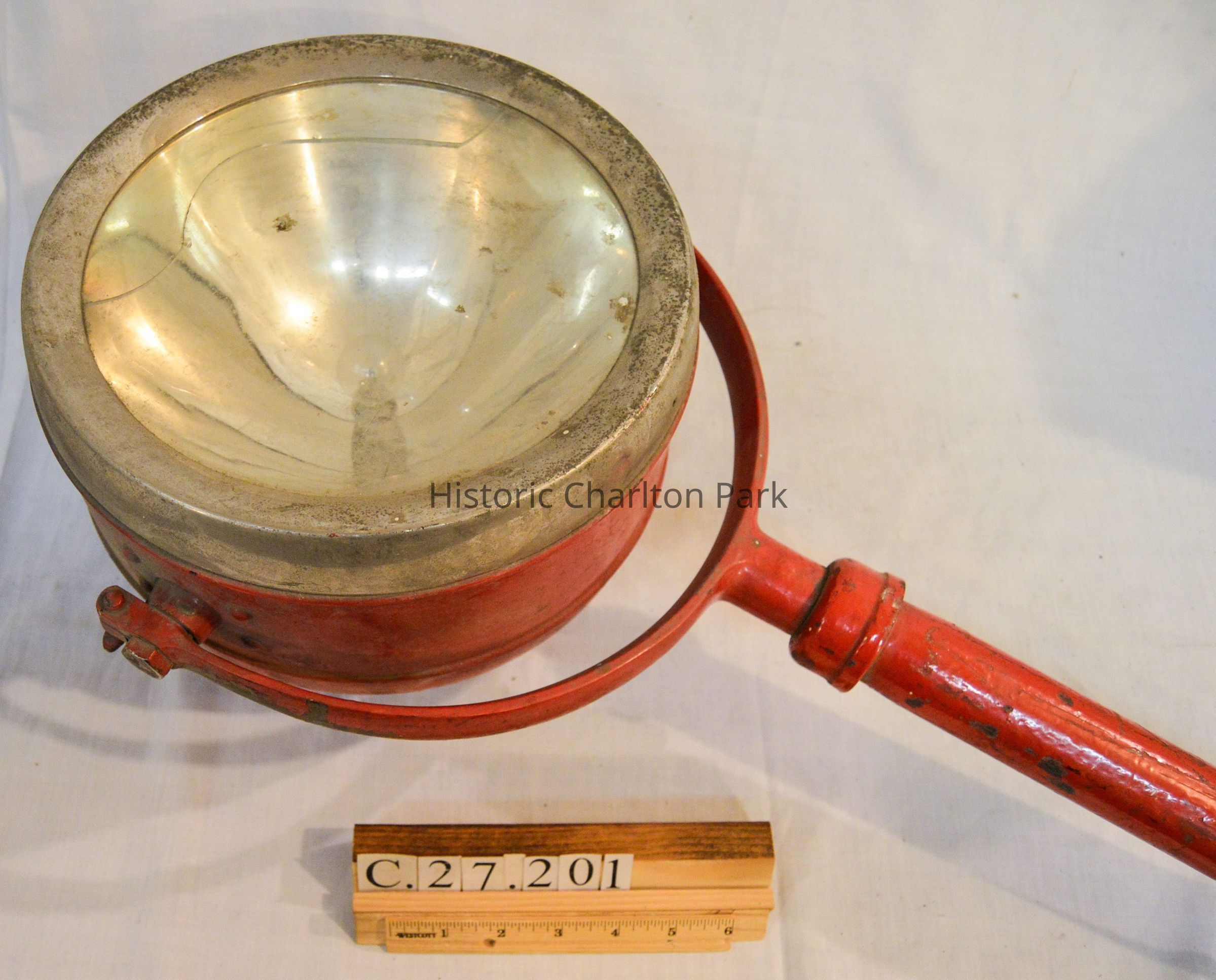 Very large spotlight lamp made of metal and painted red. The body of the spotlight is cylindrical and has a large, metal reflector on the front that amplifies the light of a lightbulb in the center. On the back, there is a rectangular handle and a port at the bottom for electrical wires. The large pole of the spotlight is attached to the body by a bracket, which secures to either side of the spotlight. The pole has another bracket halfway down, and a large bolt at the very bottom.Dimensions