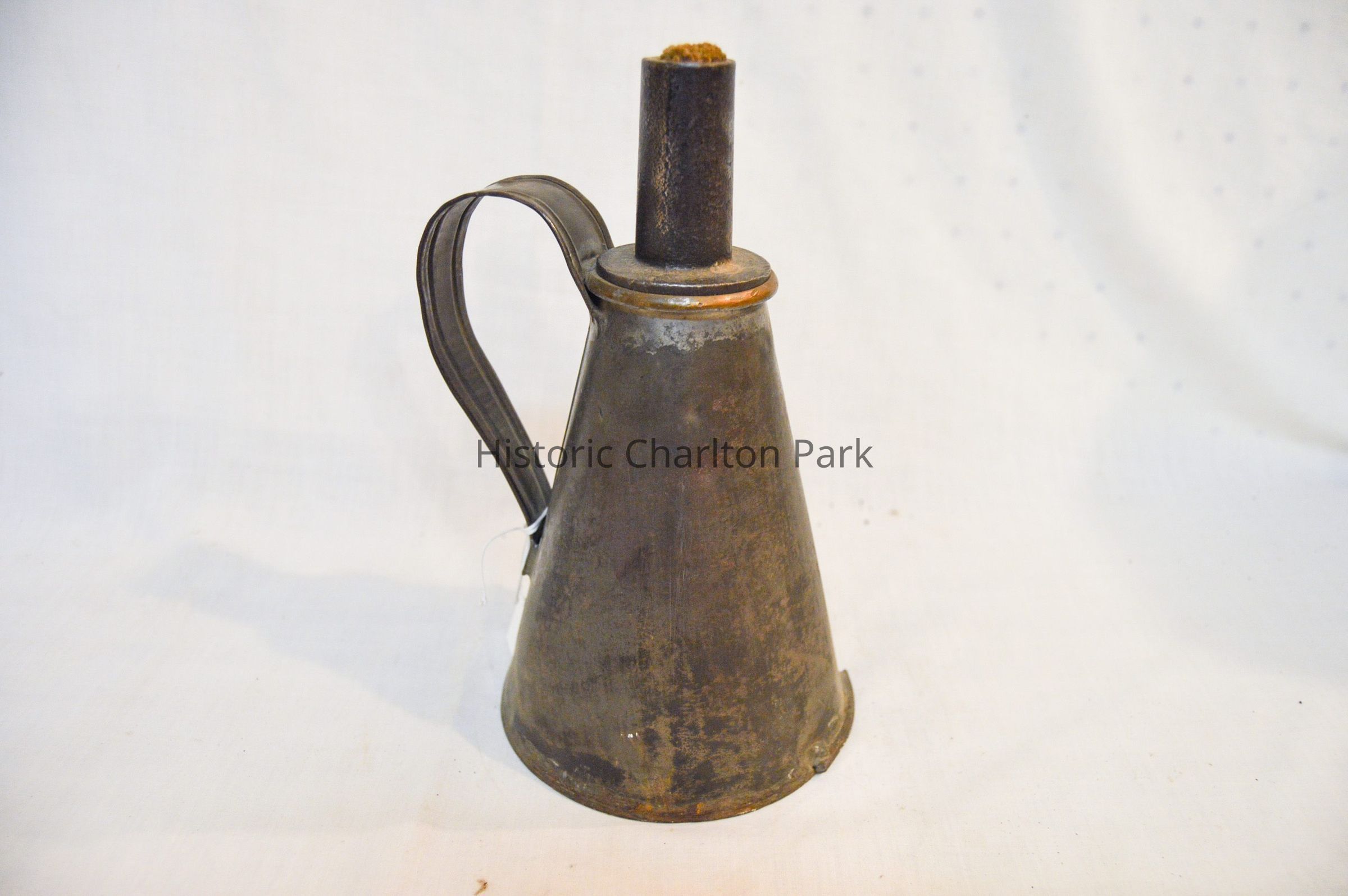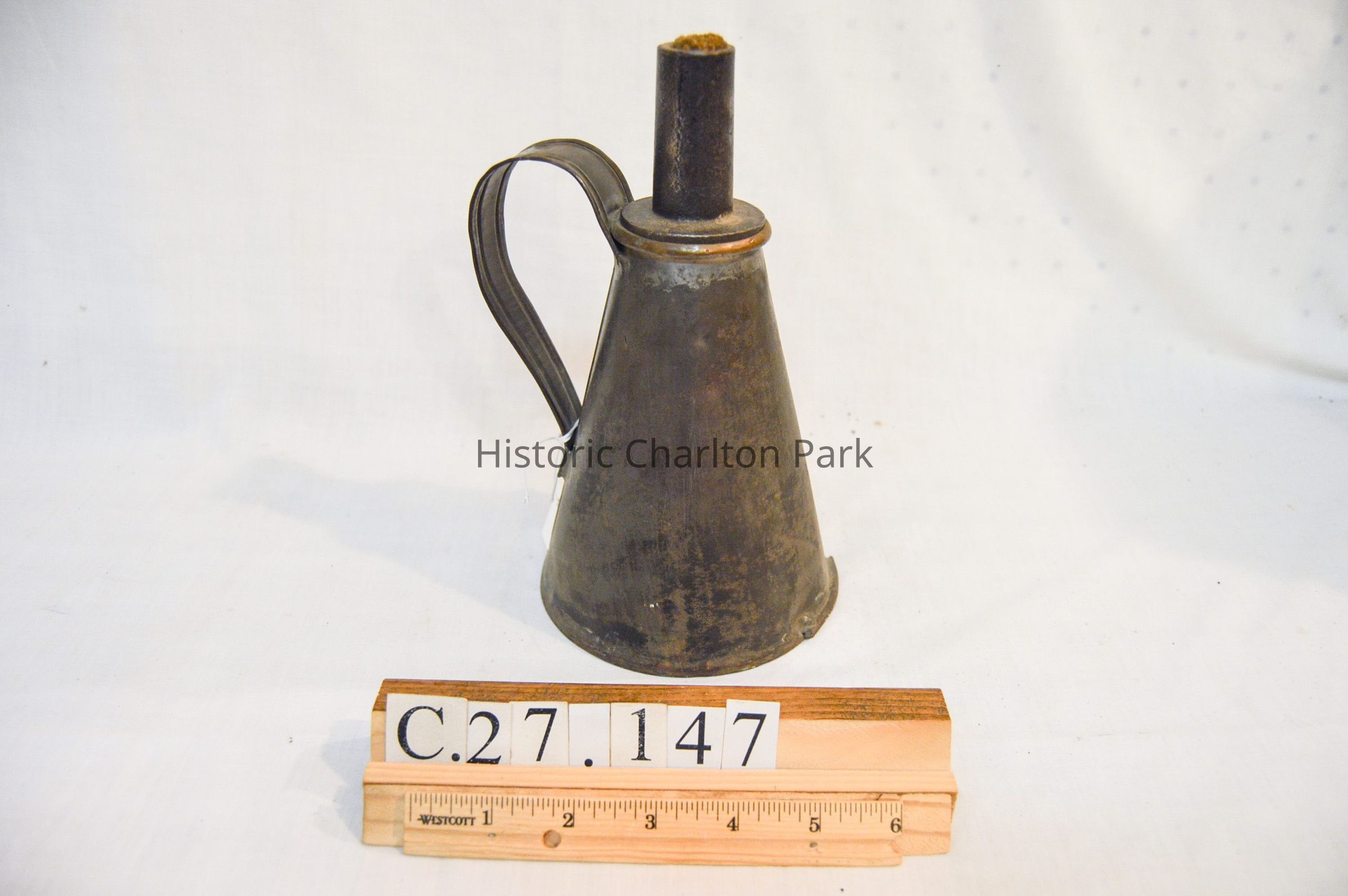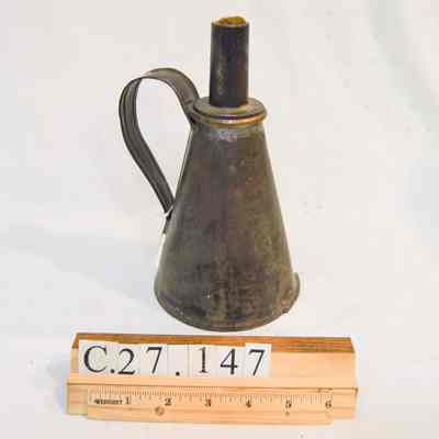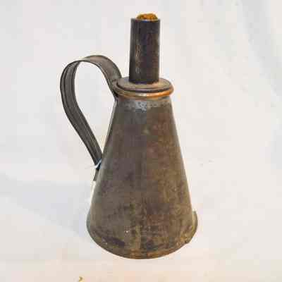 Metal kerosene torch lantern. The lantern has a conical shape that tapers inward towards the top. The back side of the lantern has a curved handle over a seam in the metal. The top of the lantern has a thin, cylindrical tube with a wick sticking out of the top. There are four circular bevels on the bottom.Dimensions