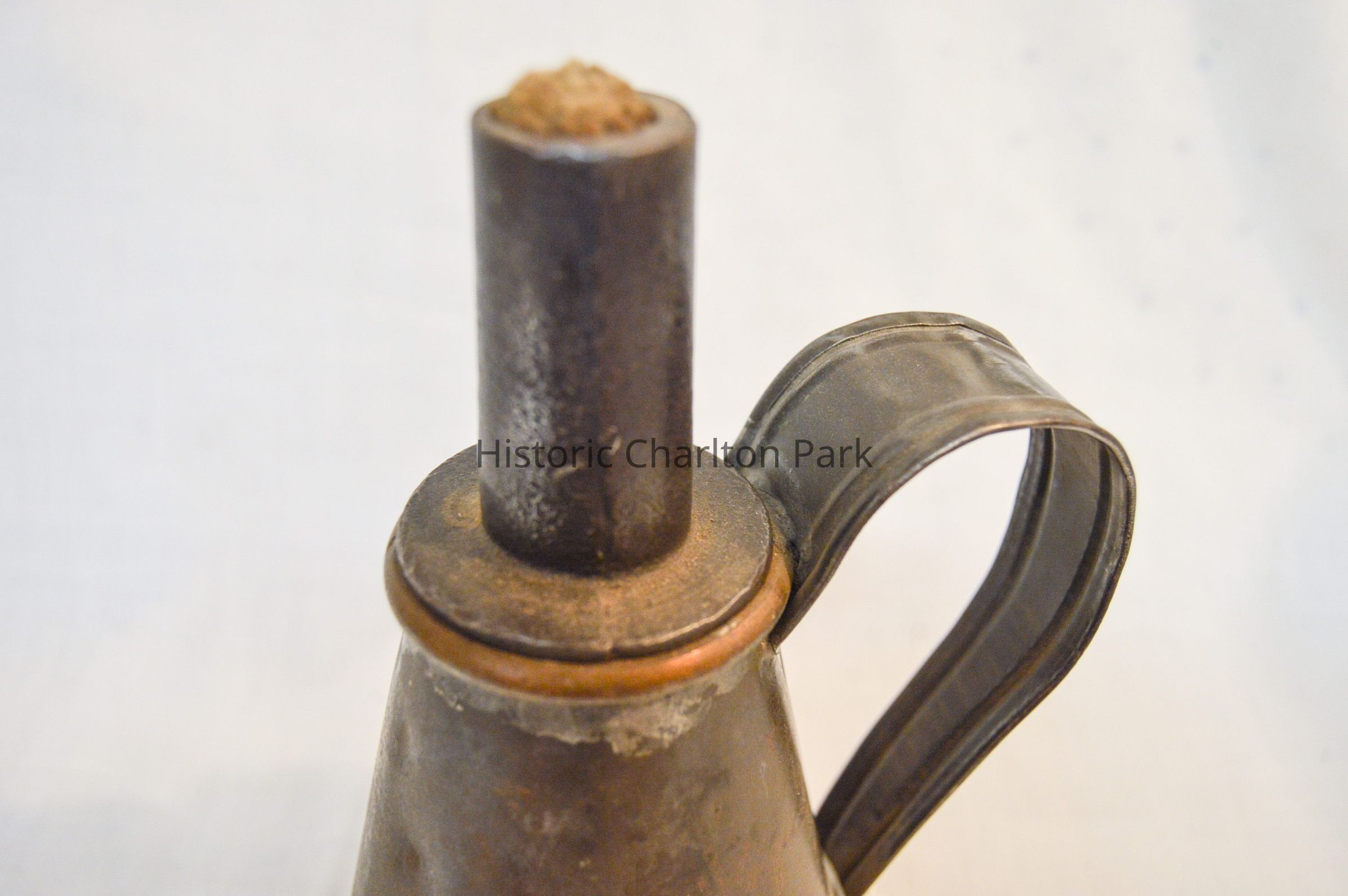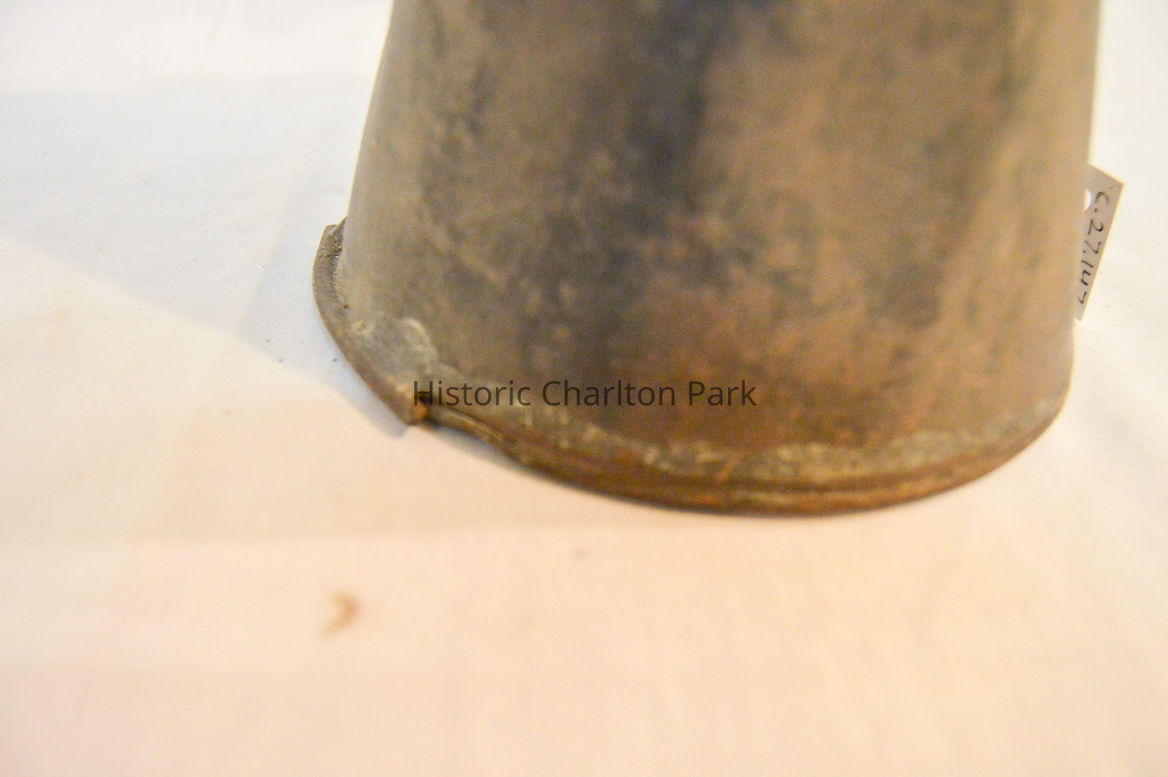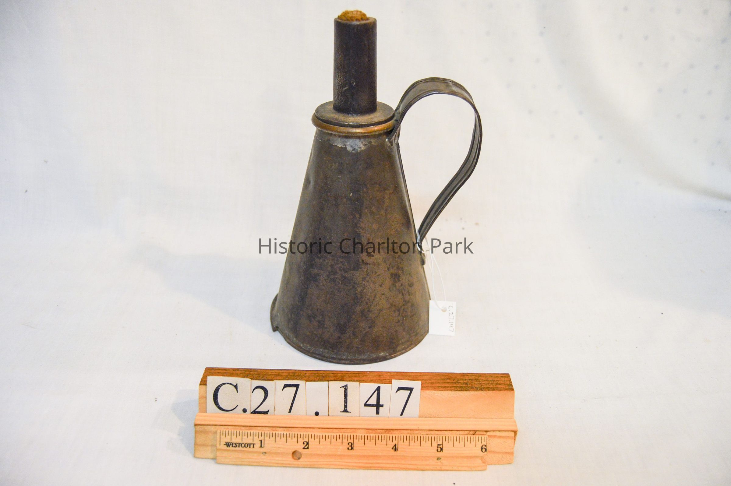 Metal kerosene torch lantern. The lantern has a conical shape that tapers inward towards the top. The back side of the lantern has a curved handle over a seam in the metal. The top of the lantern has a thin, cylindrical tube with a wick sticking out of the top. There are four circular bevels on the bottom.Dimensions
