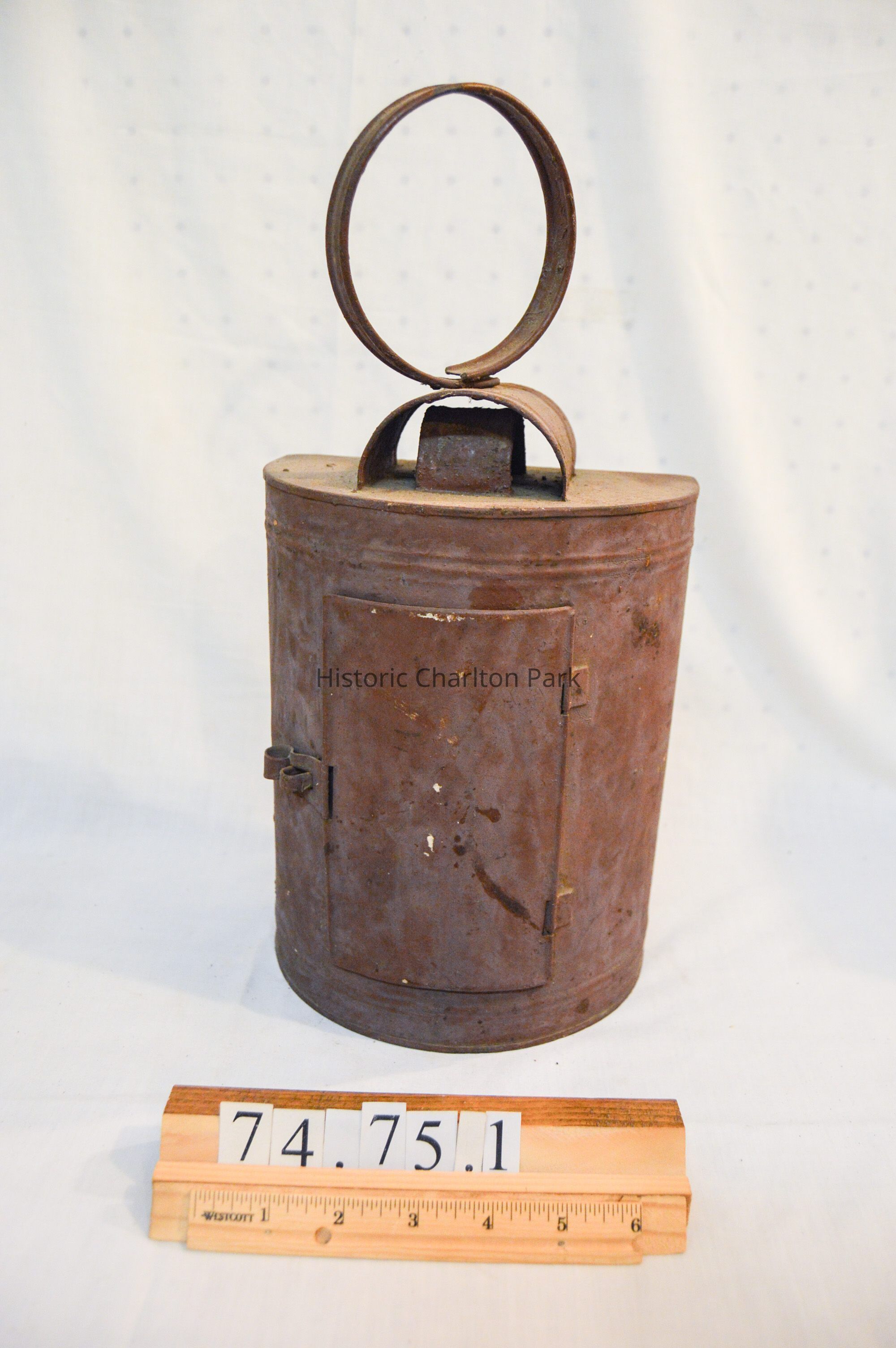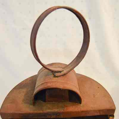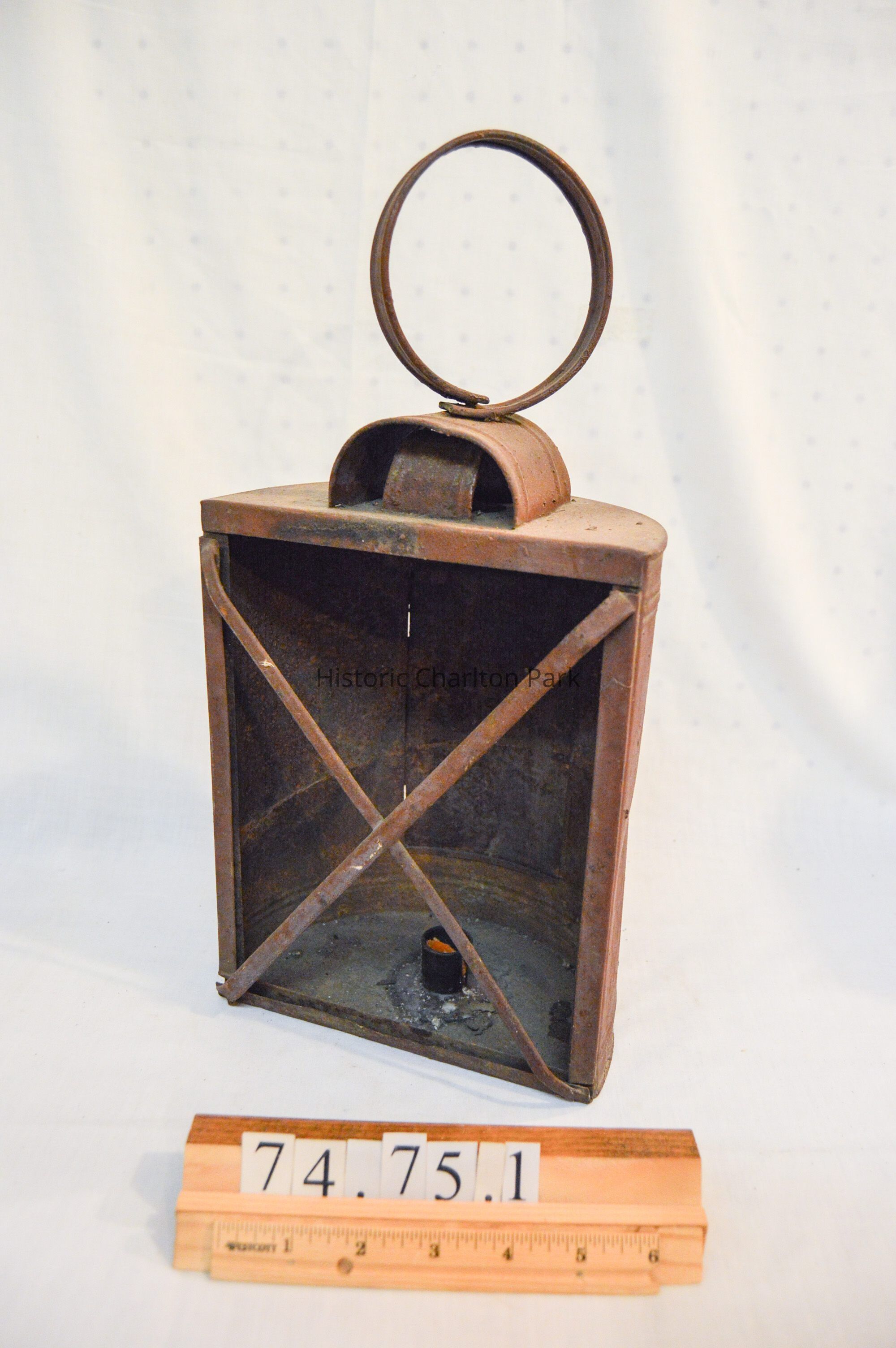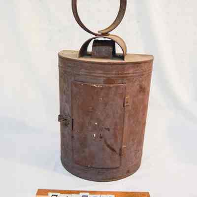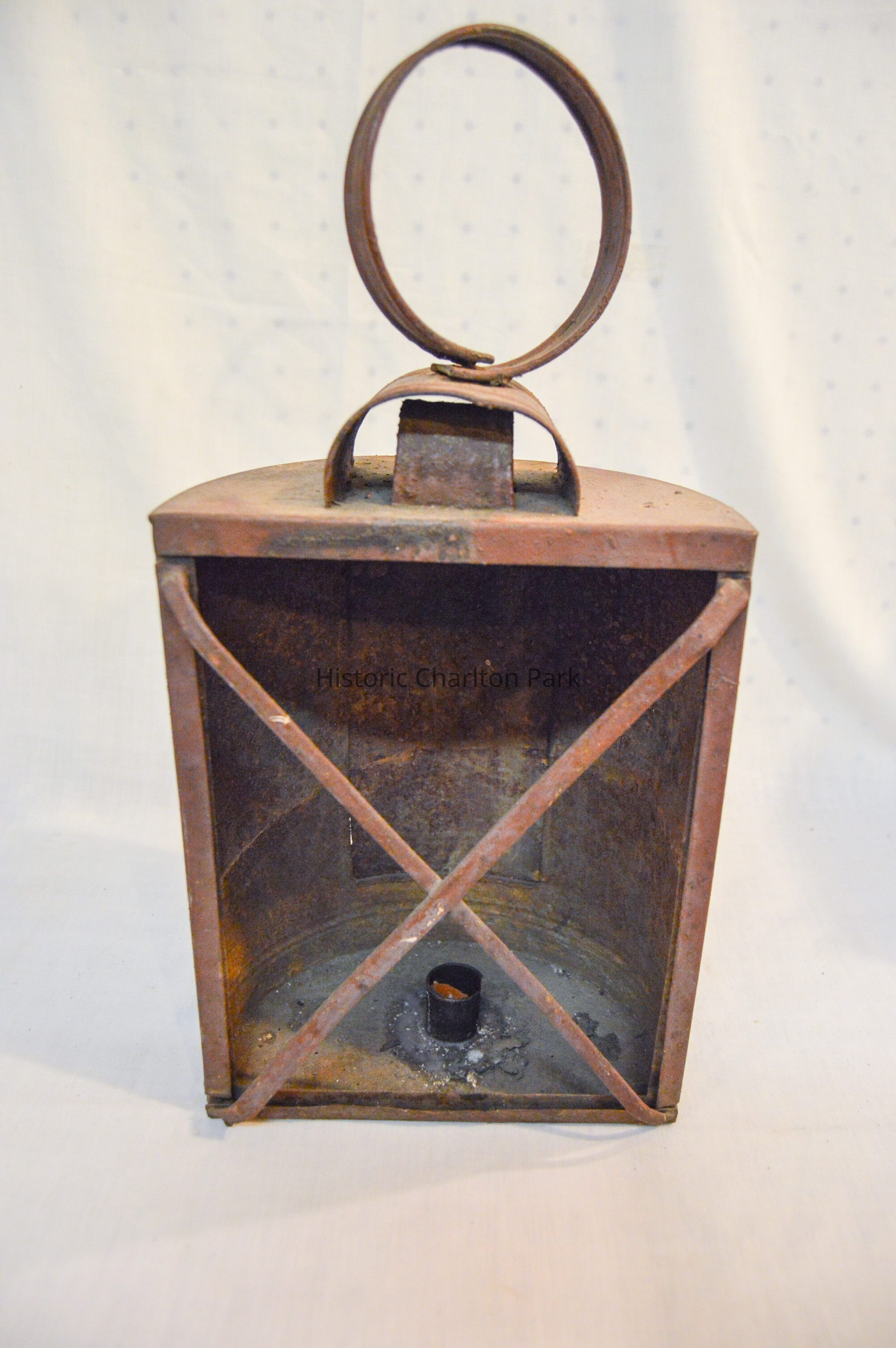 Large, half-cylinder candle lantern, made of metal and has a half-cylindrical body with an open, flat side. The flat side has two bars across it in an "X" pattern. There are slots on the bottom and sides for a glass screen to slide into, but there is no screen. The inside of the lantern has a small, hollow cylinder with orange wax inside. The curved side of the lantern has a rectangular panel that swings open on a hinge and clasps shut. There is a circular loop handle on the top of the lantern connected to two, horizontal half-cylinders stacked on top of each other.Dimensions
