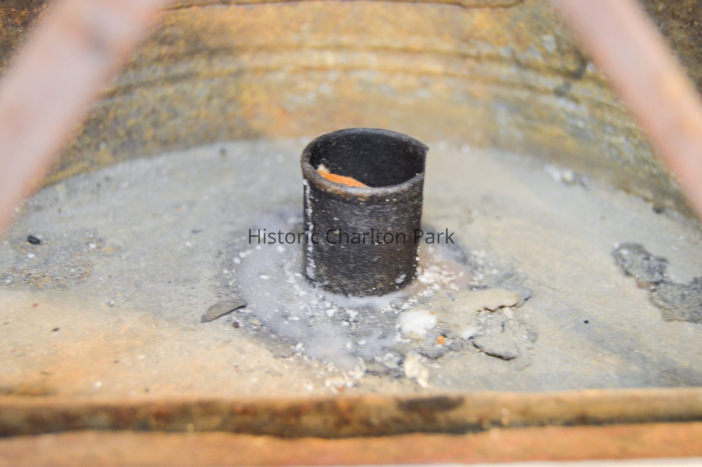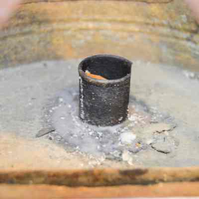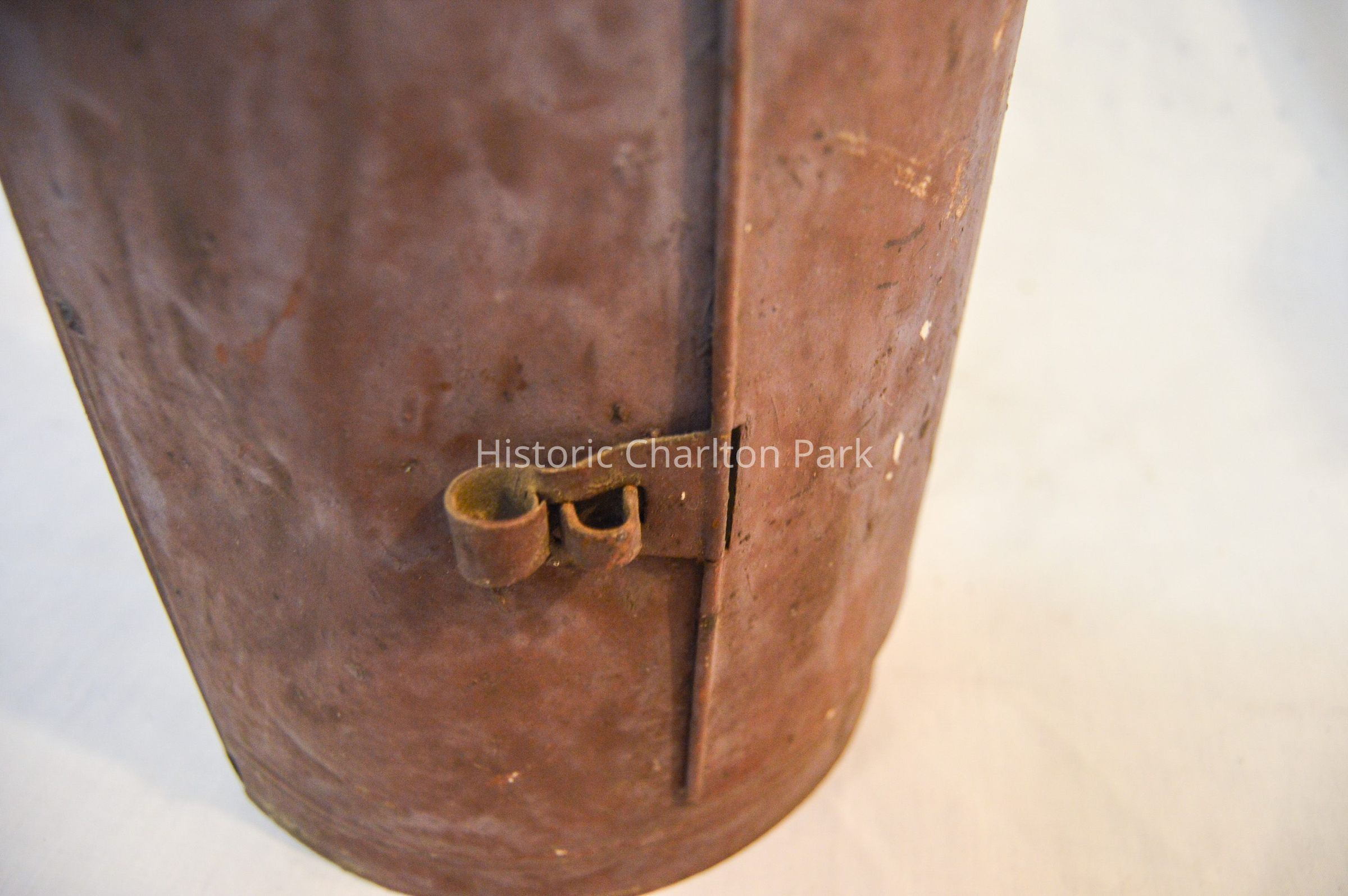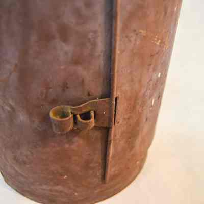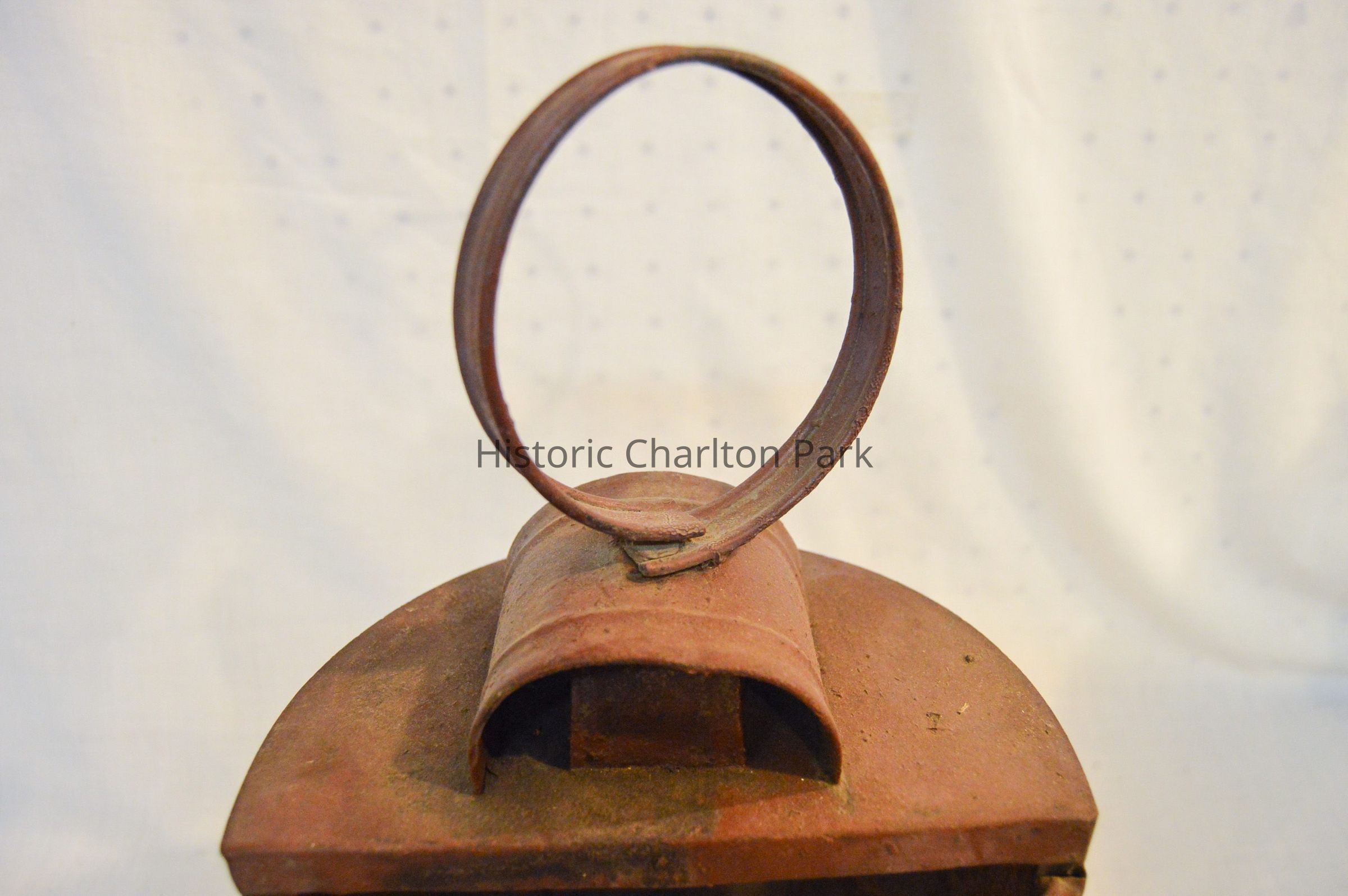 Large, half-cylinder candle lantern, made of metal and has a half-cylindrical body with an open, flat side. The flat side has two bars across it in an "X" pattern. There are slots on the bottom and sides for a glass screen to slide into, but there is no screen. The inside of the lantern has a small, hollow cylinder with orange wax inside. The curved side of the lantern has a rectangular panel that swings open on a hinge and clasps shut. There is a circular loop handle on the top of the lantern connected to two, horizontal half-cylinders stacked on top of each other.Dimensions