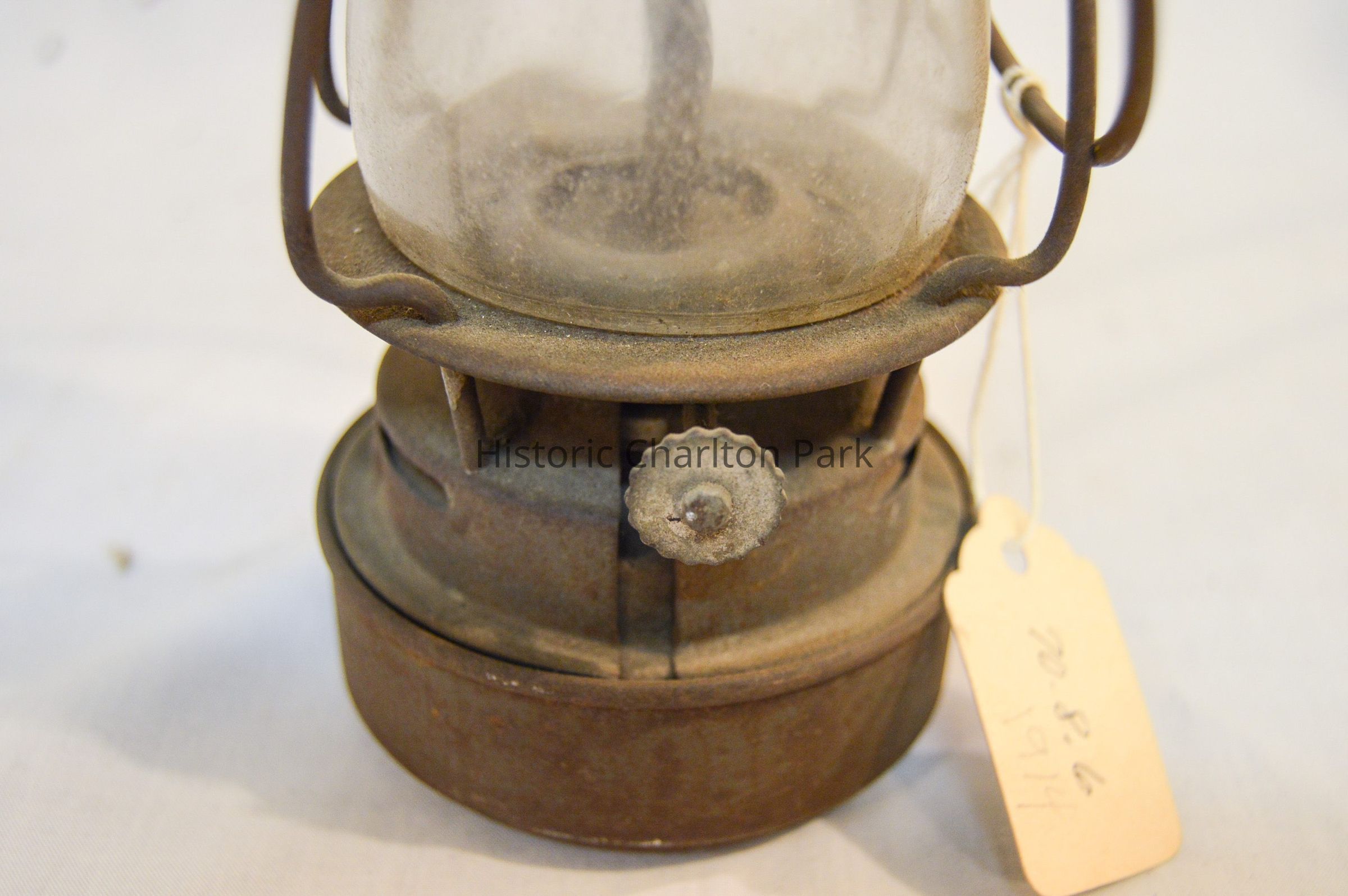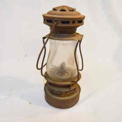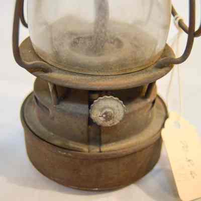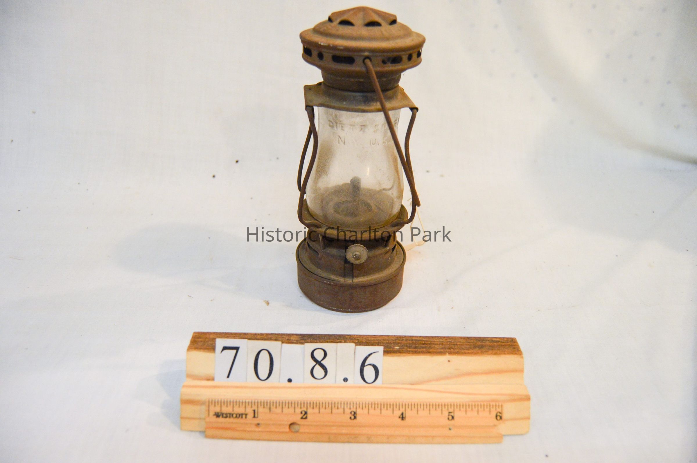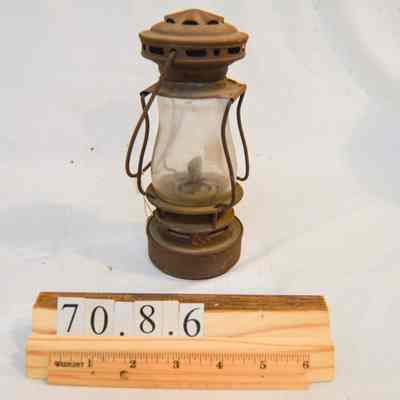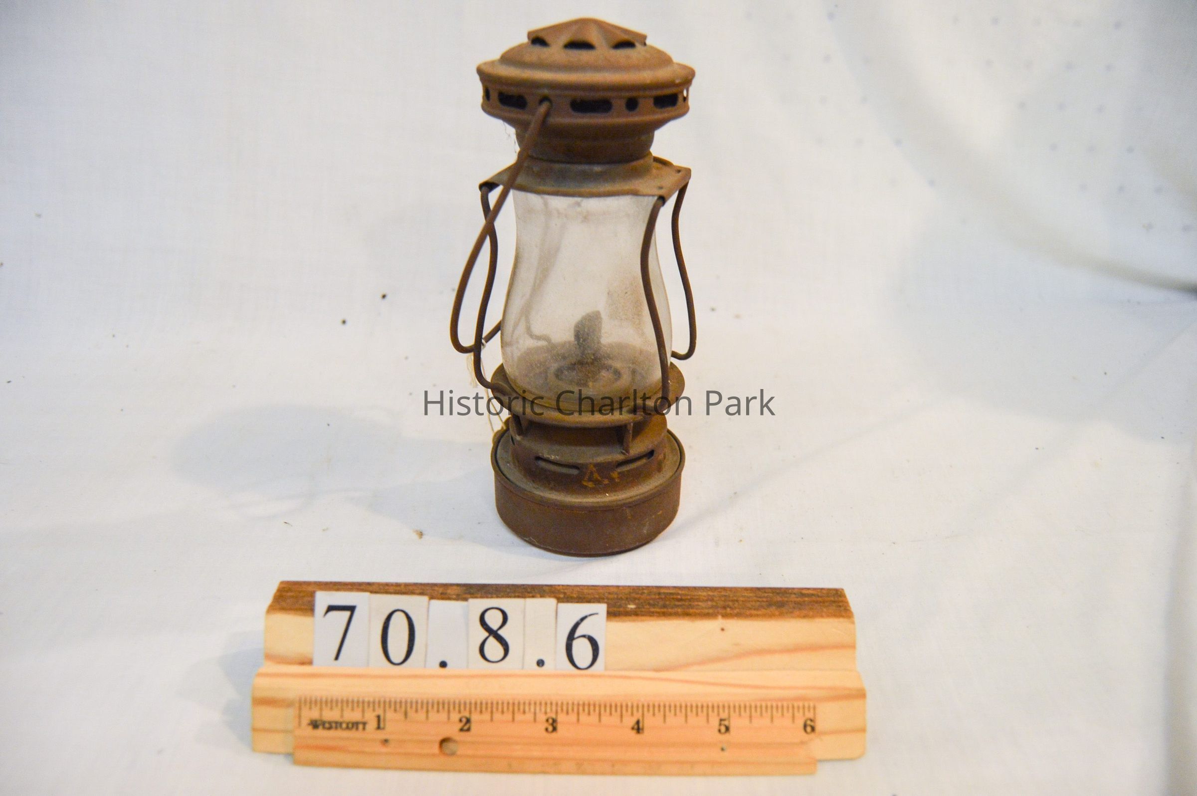 Small Dietz Sport oil lantern. The bottom of the lantern is circular and holds fuel for the lamp. There is a round knob on one side to adjust the burner. There is a glass covering over the burner with four metal wire prongs around it, which all hold up the circular cap. The cap has vents on the top and a looped metal handle.Acquisition