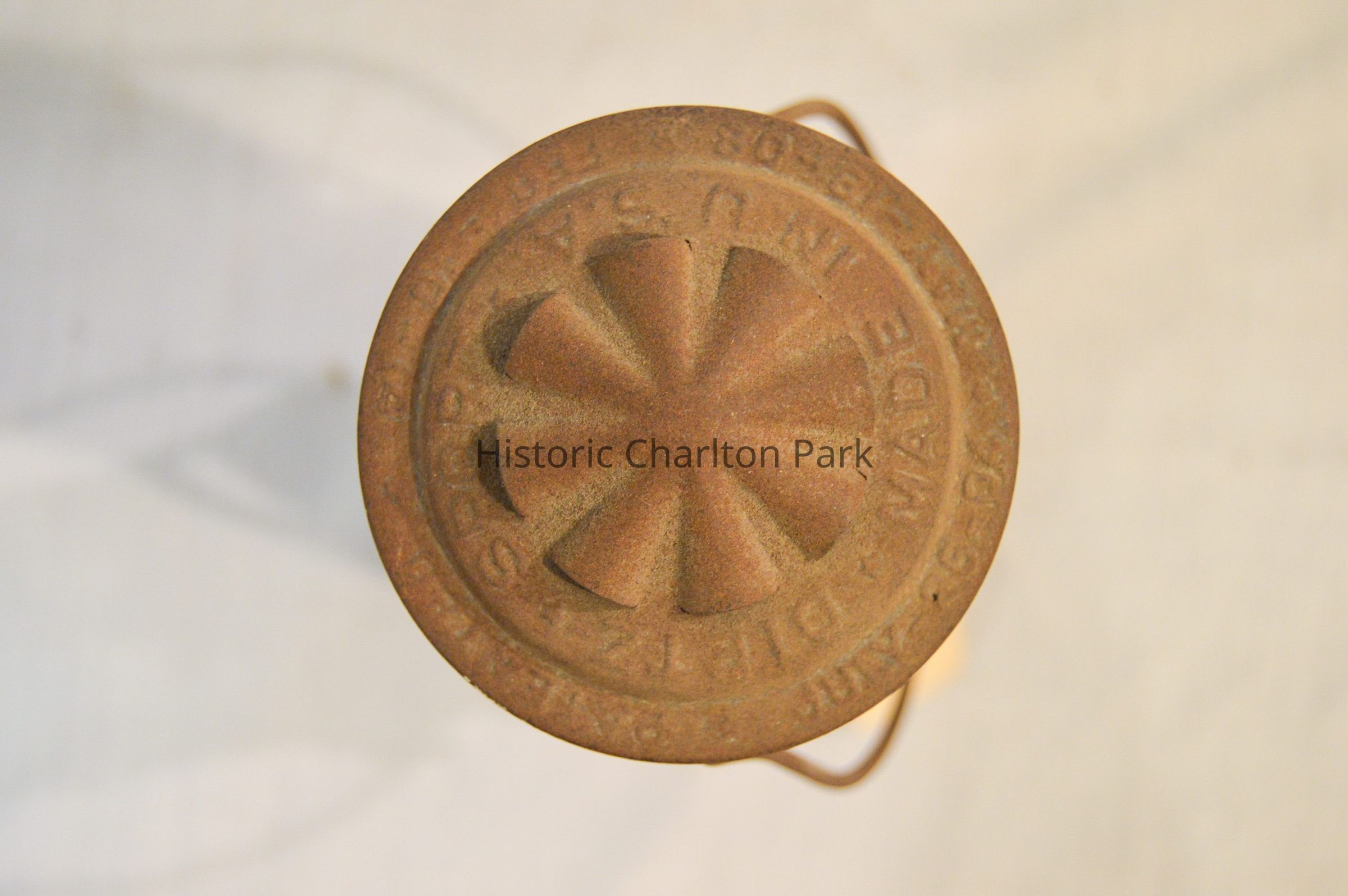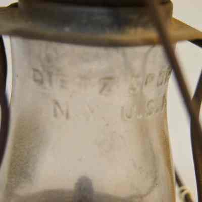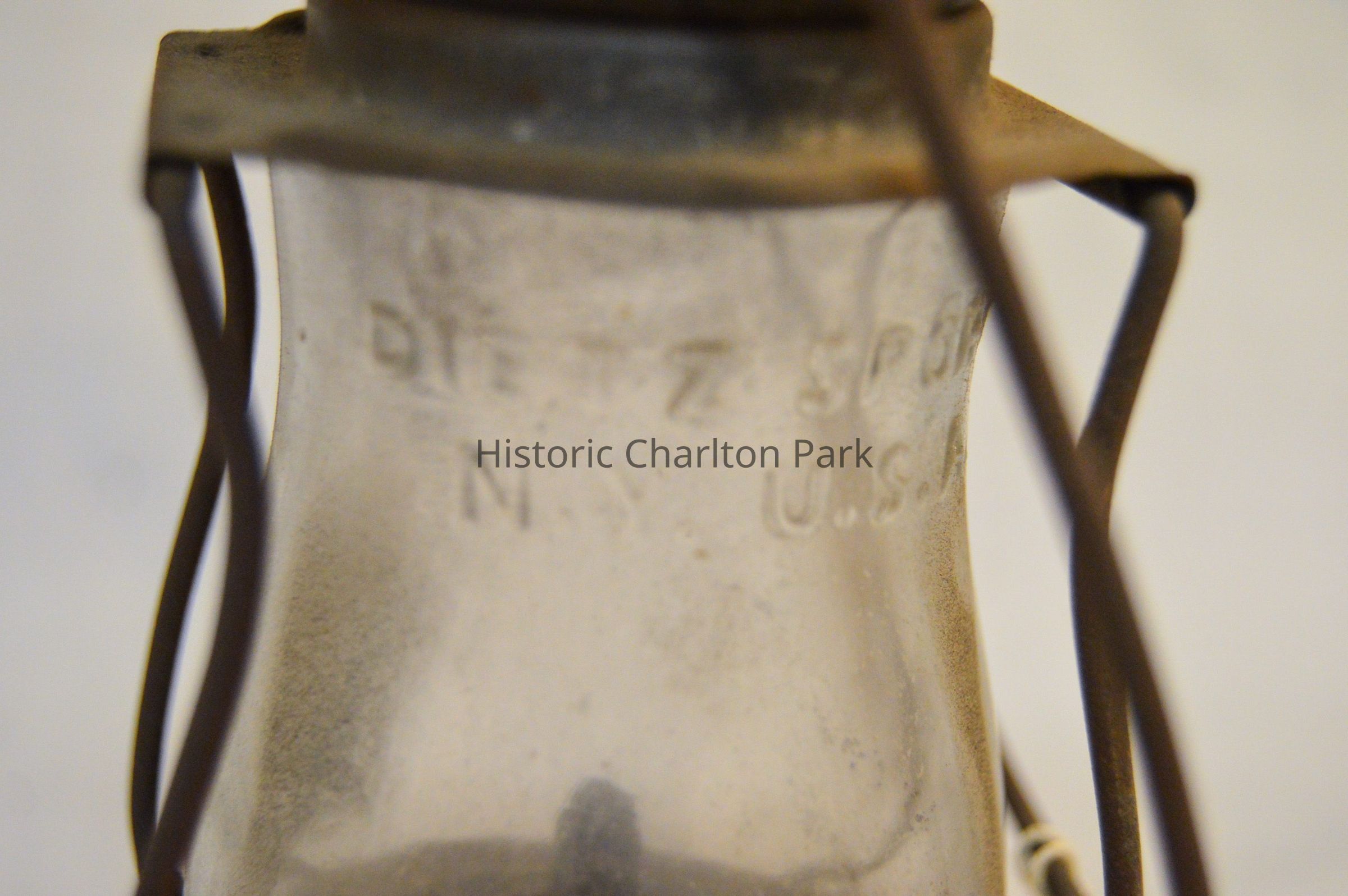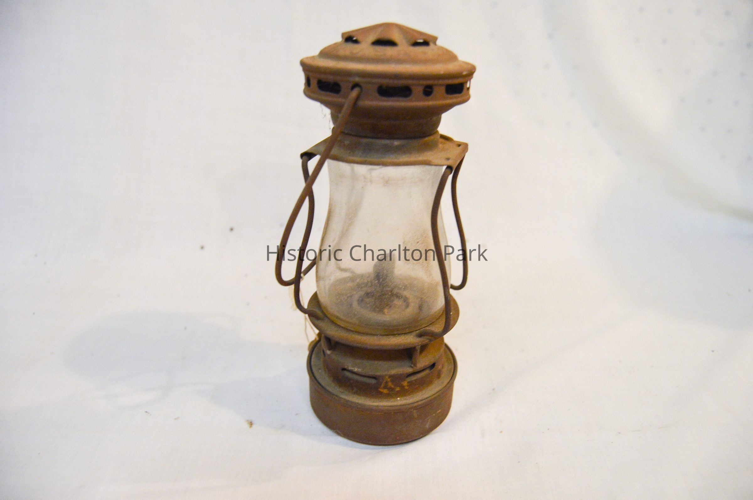 Small Dietz Sport oil lantern. The bottom of the lantern is circular and holds fuel for the lamp. There is a round knob on one side to adjust the burner. There is a glass covering over the burner with four metal wire prongs around it, which all hold up the circular cap. The cap has vents on the top and a looped metal handle.Acquisition