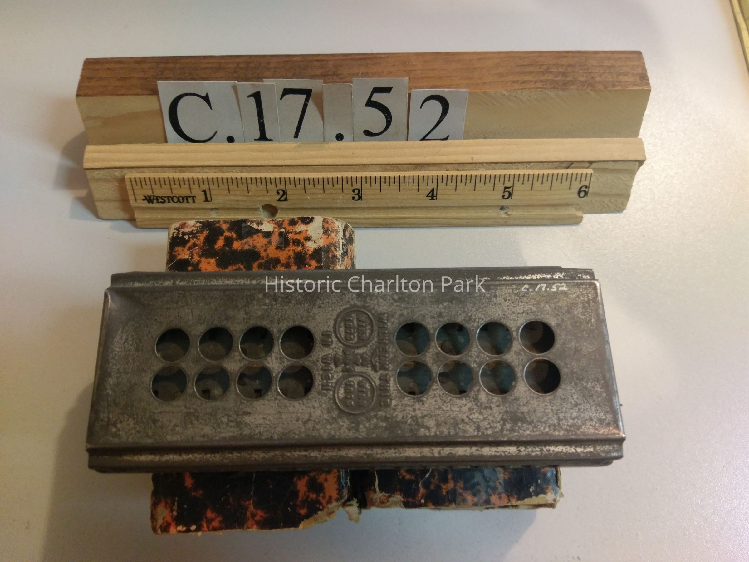 This Harmonica was made in Germany. "Wilhelm Thie, in Wien" and "Wien 1873" is written on it. It is in a black and orange speckled cardboard box. It is 2" wide x 5" in length.Acquisition