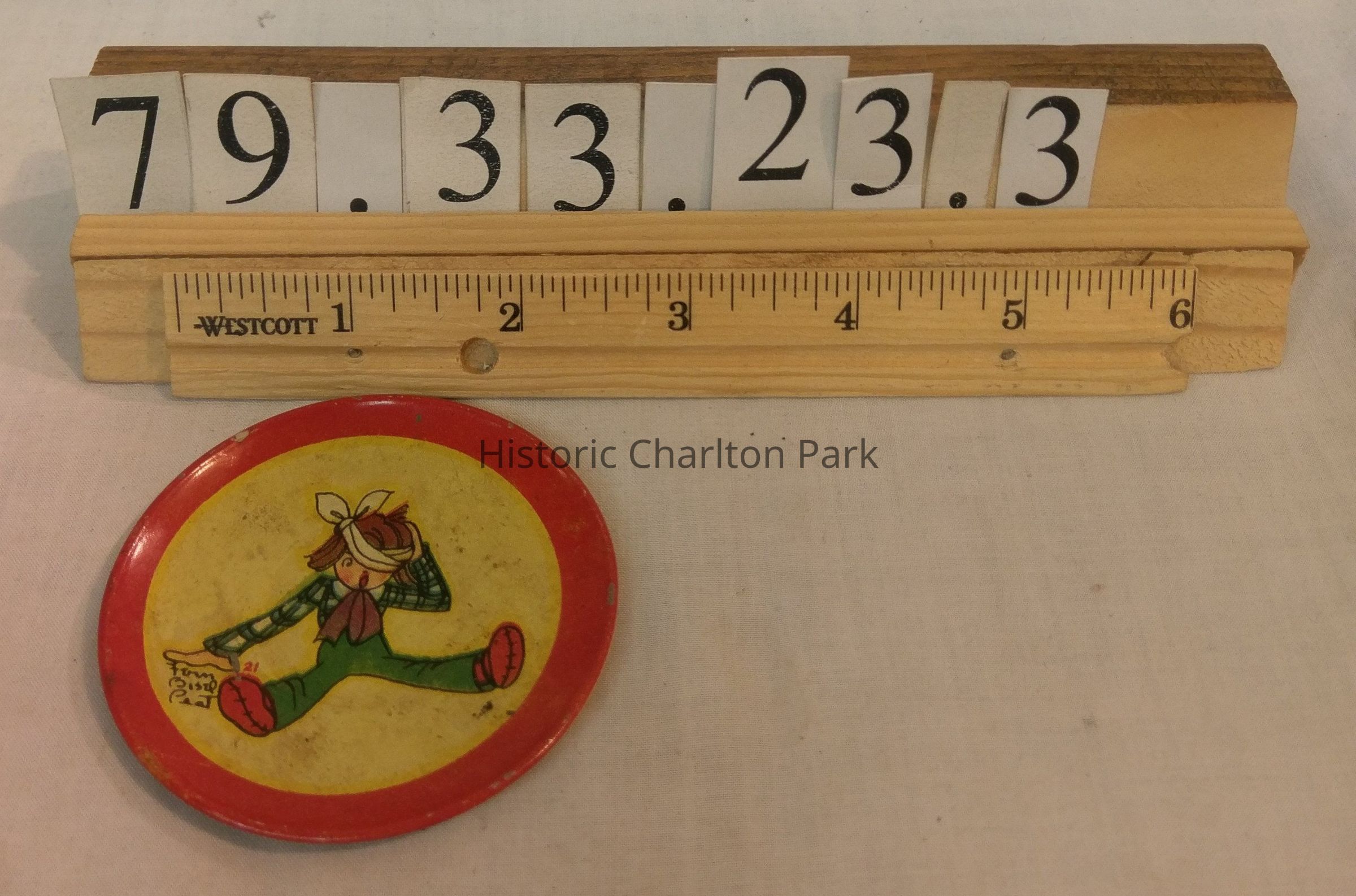 This is a toy saucer made by the Ohio Art Company in Bryan, OH. This design was created by Fern Bisel Peat, a well-known children's illustrator in the 1930s. The edge is red and the body is yellow. It is part of a matching tea set. There is an image of a boy sitting with a bandage on his face. He is wearing green pants and a plaid shirt with red shoes. "Fern Bisel Peat" appears under the boy's hand in black, with a red "21". The saucer is about 2.5" in diameter.Acquisition