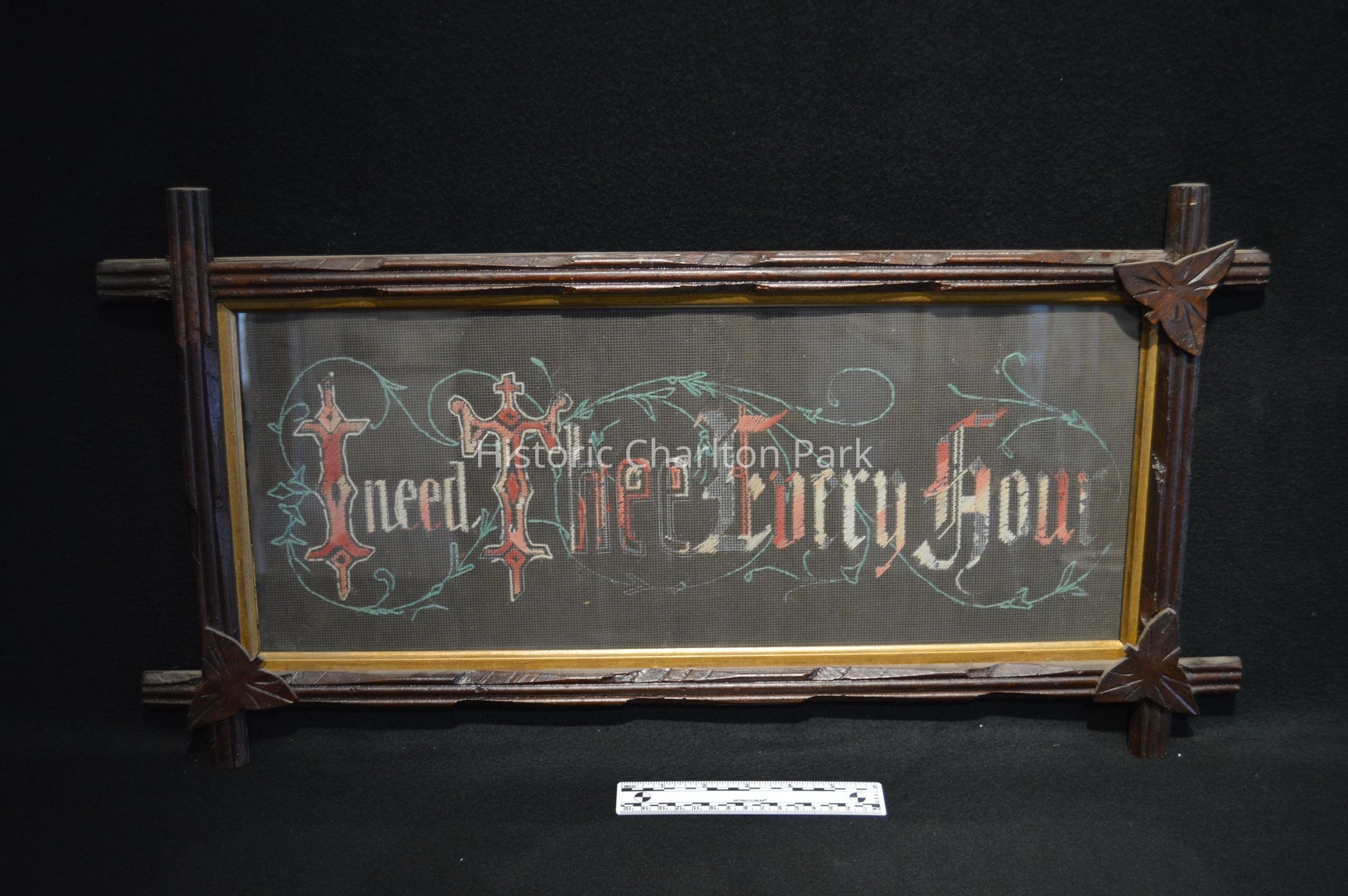 Victorian era motto sampler. The text "I need Thee Every Hour" is embroidered in white, red, and blue, with green vines behind it. The background material is a dark blue/black.