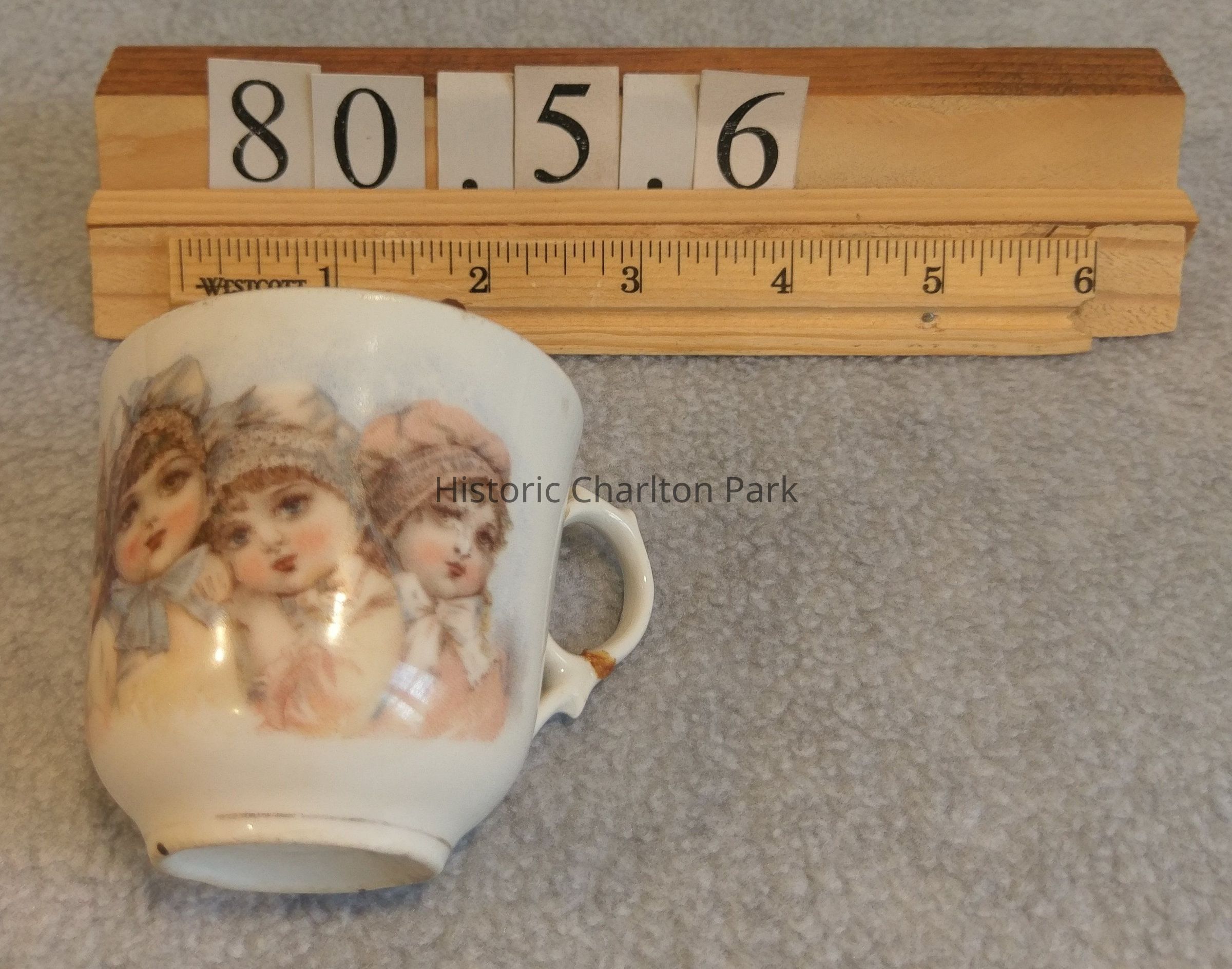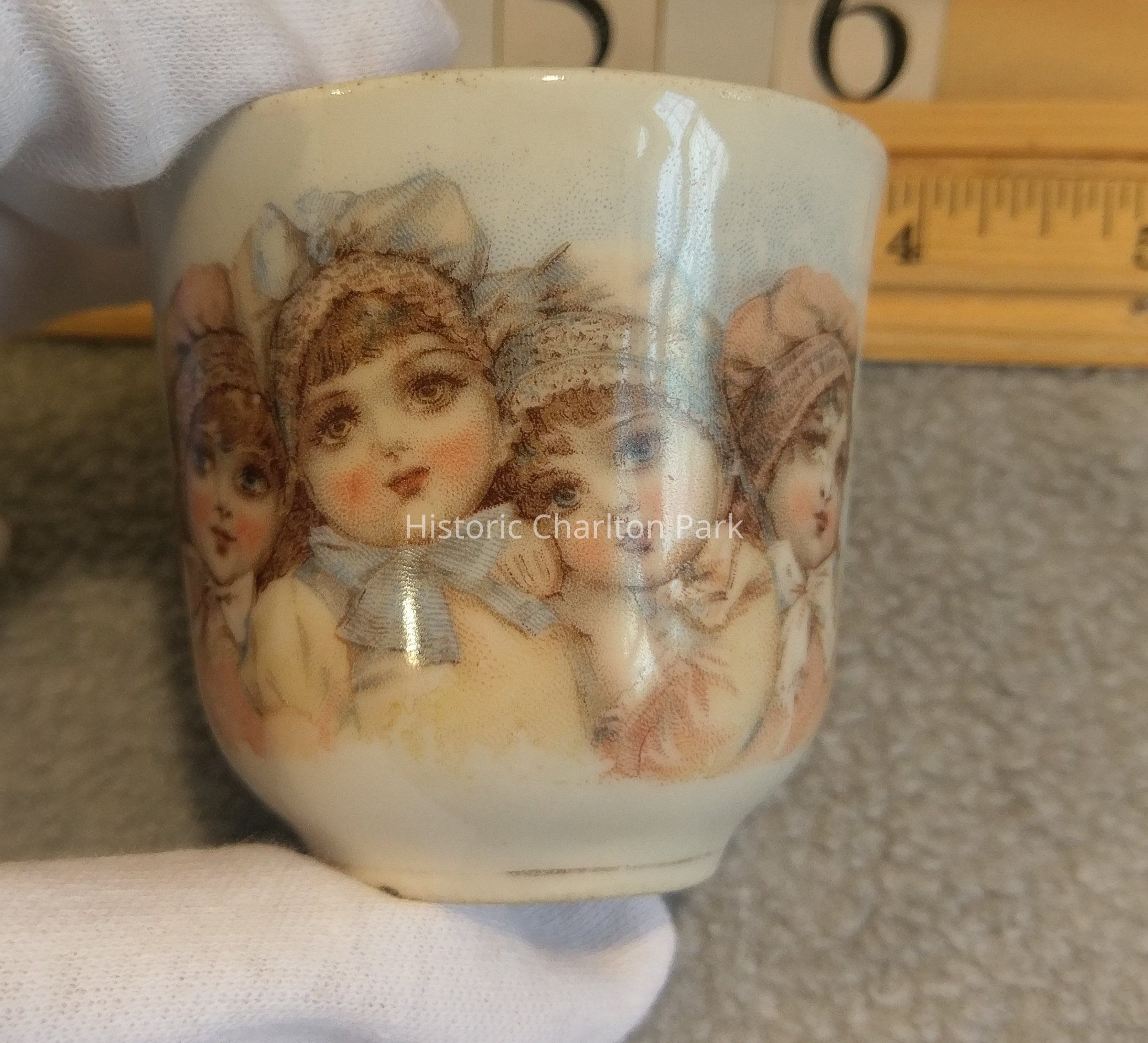 This is a toy teacup that depics four girls in bonnets and bows. They are in pastel colors. The cup is white. It is about 3" wide including the handle.Acquisition