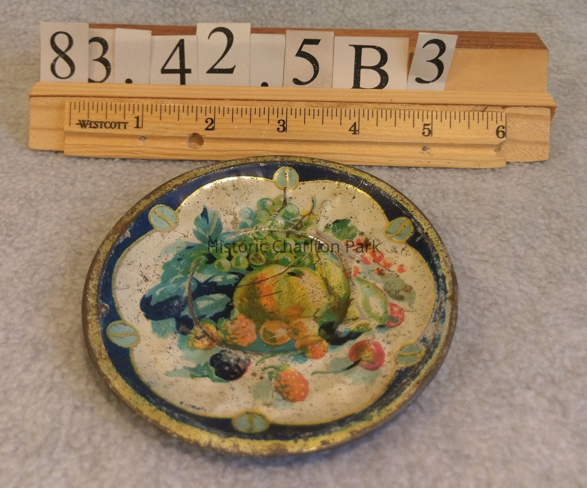 This is a tin saucer that belongs to a larger set of cups and saucers, in the "toleware" style. The saucers are painted in a variety of colors showing different fruit like apples, berries and grapes. The saucer is about 4" in diameter. "Germany" is written in black near the edge.Acquisition