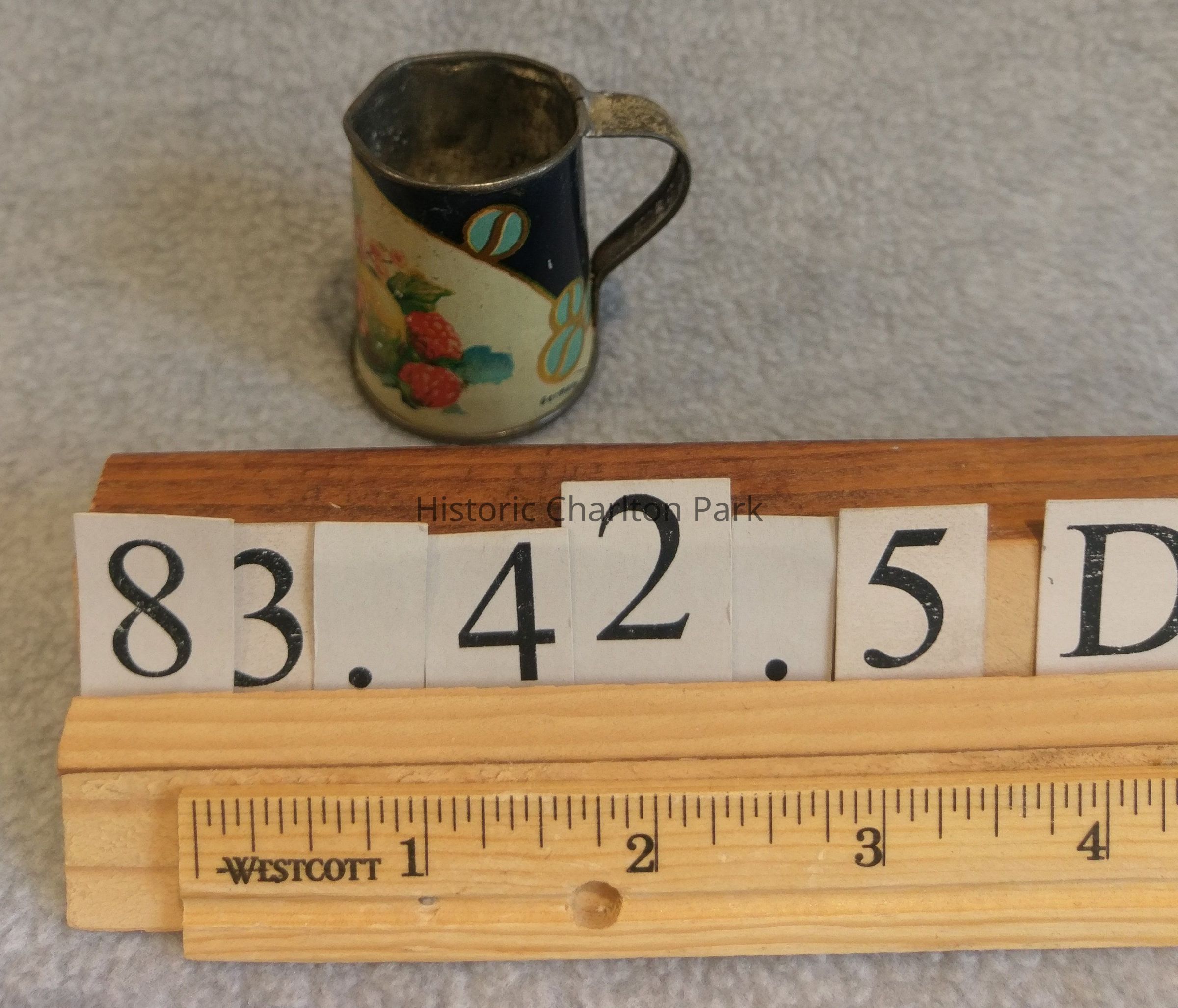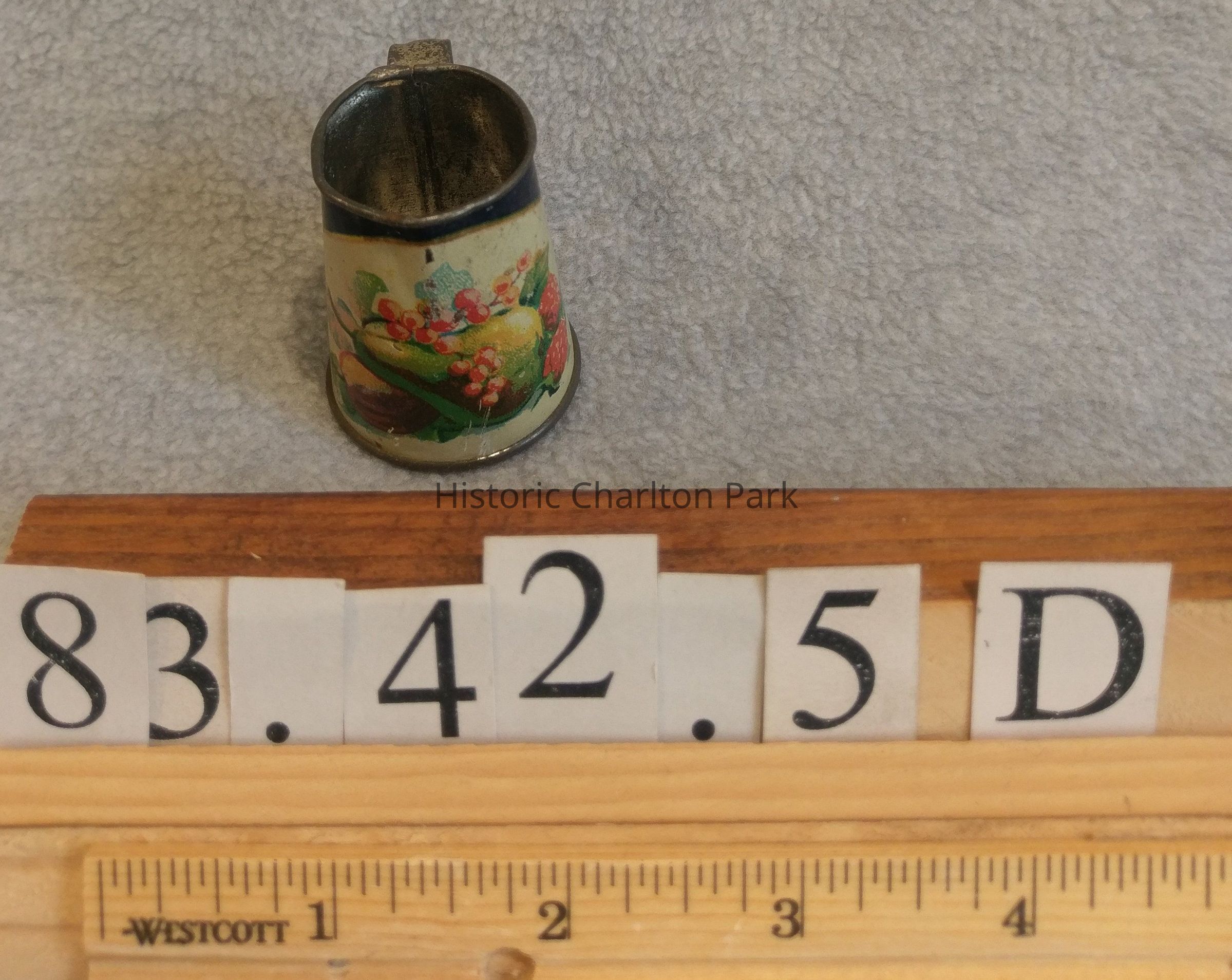 This is a tin creamer that belongs to a larger set of cups and saucers, in the "toleware" style. This one is probably a creamer since it has a pour spout. The base of the dish is blue with gold details. The image on the dish is of different fruit like grapes, an apple and a pear. The background of the image is off-white. "Germany" is written in black near the bottom.Acquisition
