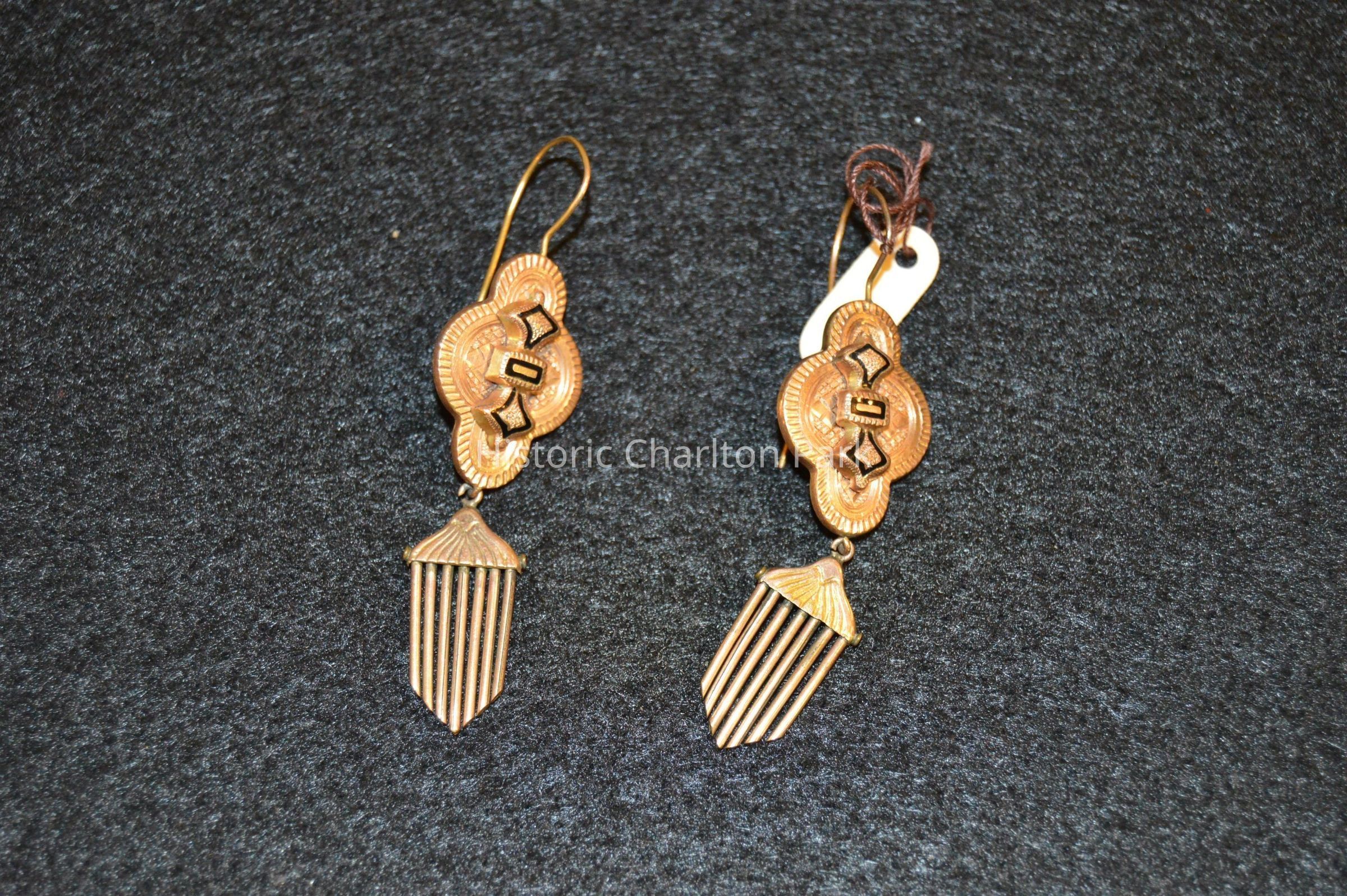 Gold drop earrings with black accents and hanging gold tassels on wire.