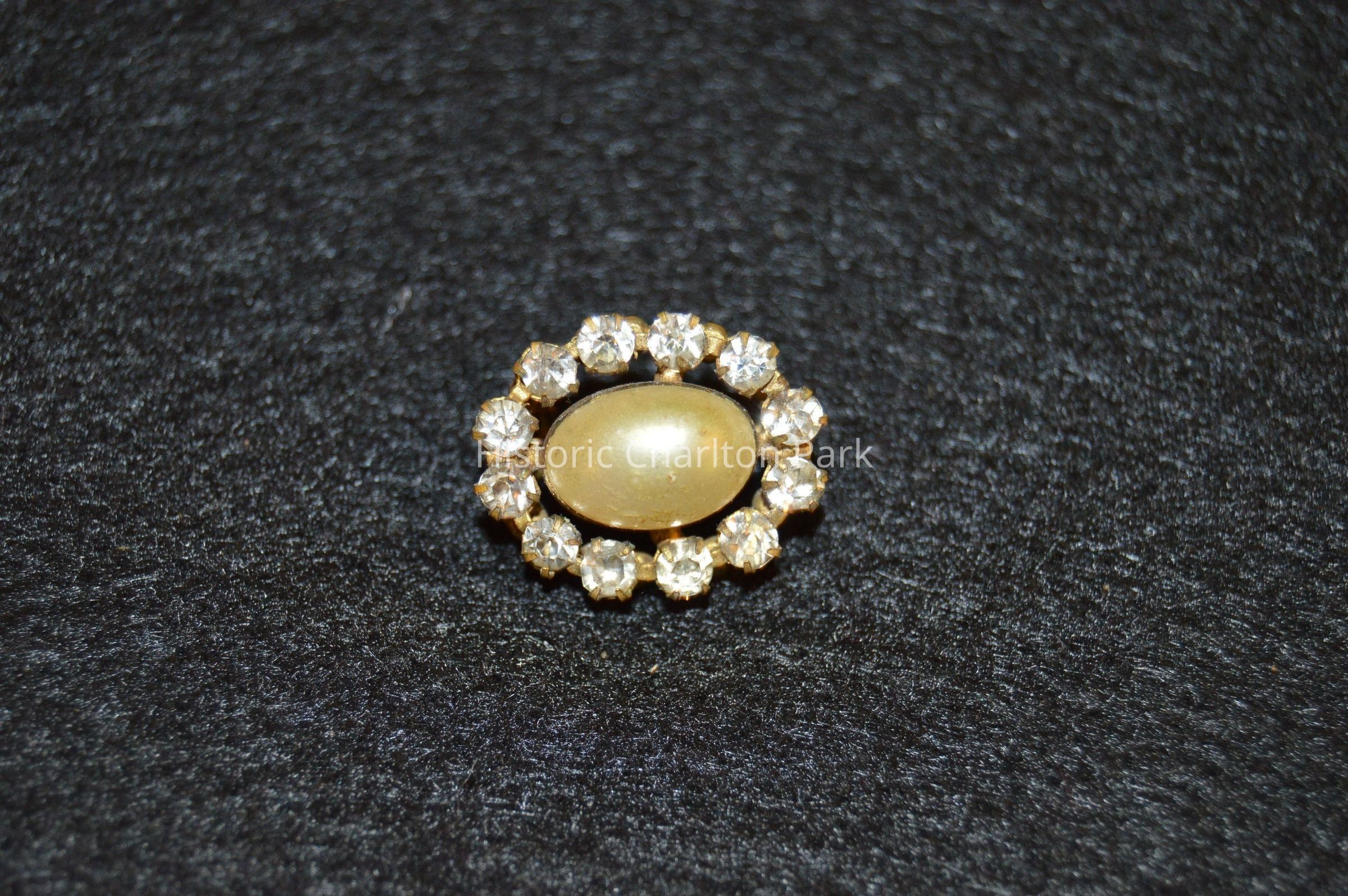 Small pin/brooch with clear stones surrounding a pearl like stone at the center.