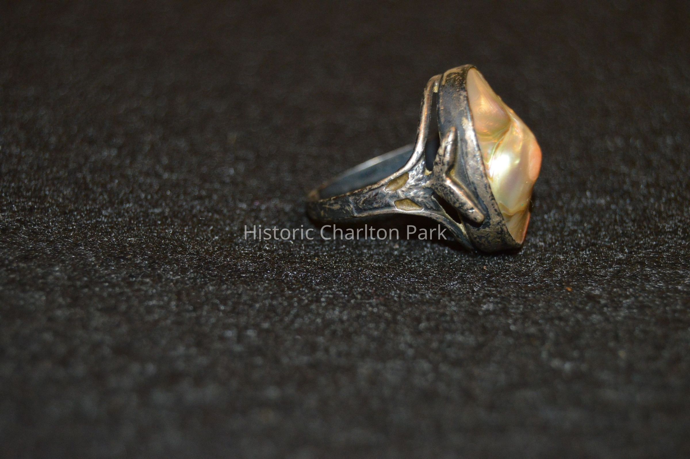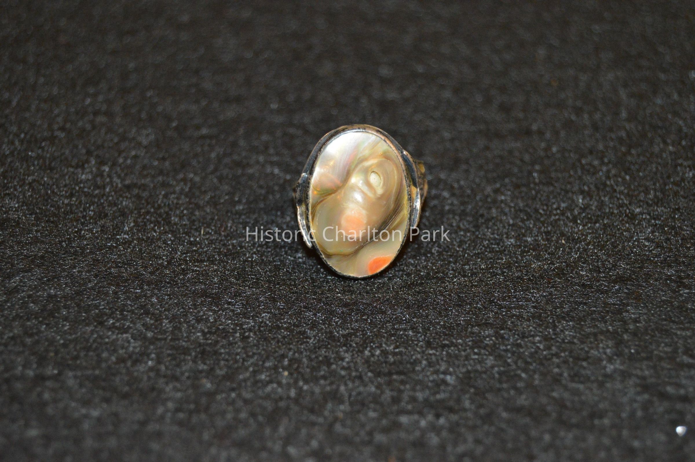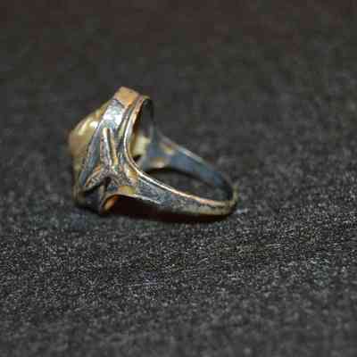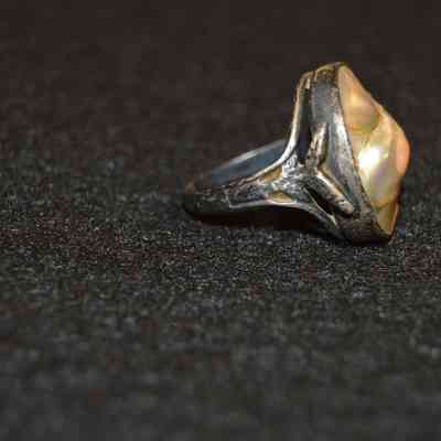 Silver ring with abalone or mother of pearl center, and leaf-like accents on the shoulders.
