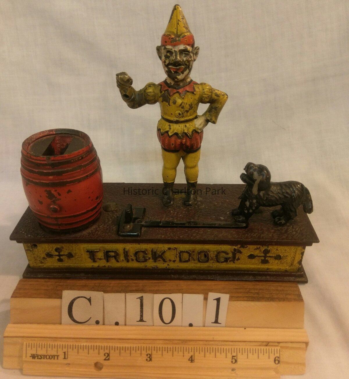 This is a mechanical savings bank made from cast iron. It is known as the "Trick Dog" bank and depicts a circus clown and his dog. A coin is first inserted into the dog's mouth, then the lever is triggered and the dog jumps up and into the hoop (missing) and tosses the coin into the barrel. The main colors are red, yellow and black, but those do not appear to be the original colors, likely repainted.