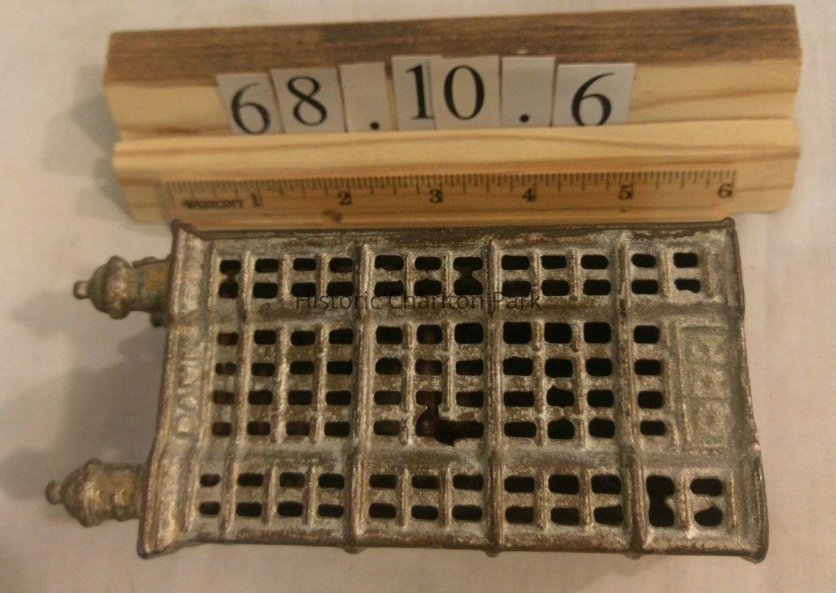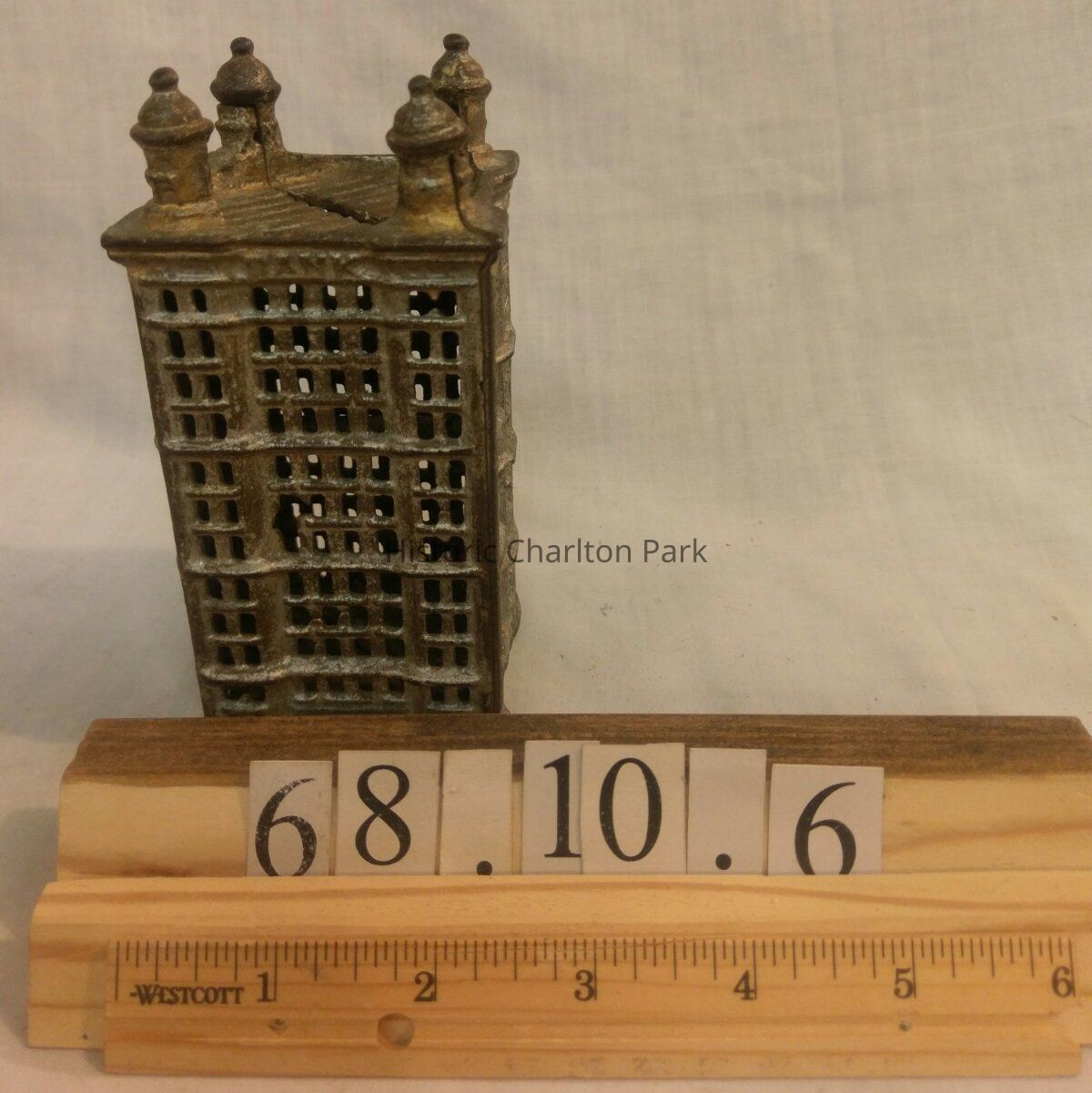 This is a small savings bank made from cast iron. There is evidence of white and gold paint. The building was originally painted silver and the roof was gold. It is shaped like a skyscraper and has locking mechanism on the side where a key was inserted to open the bank.