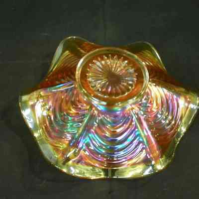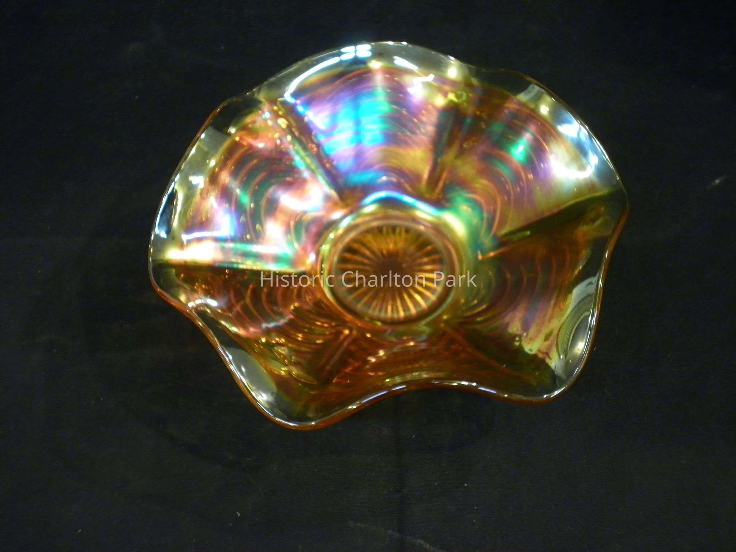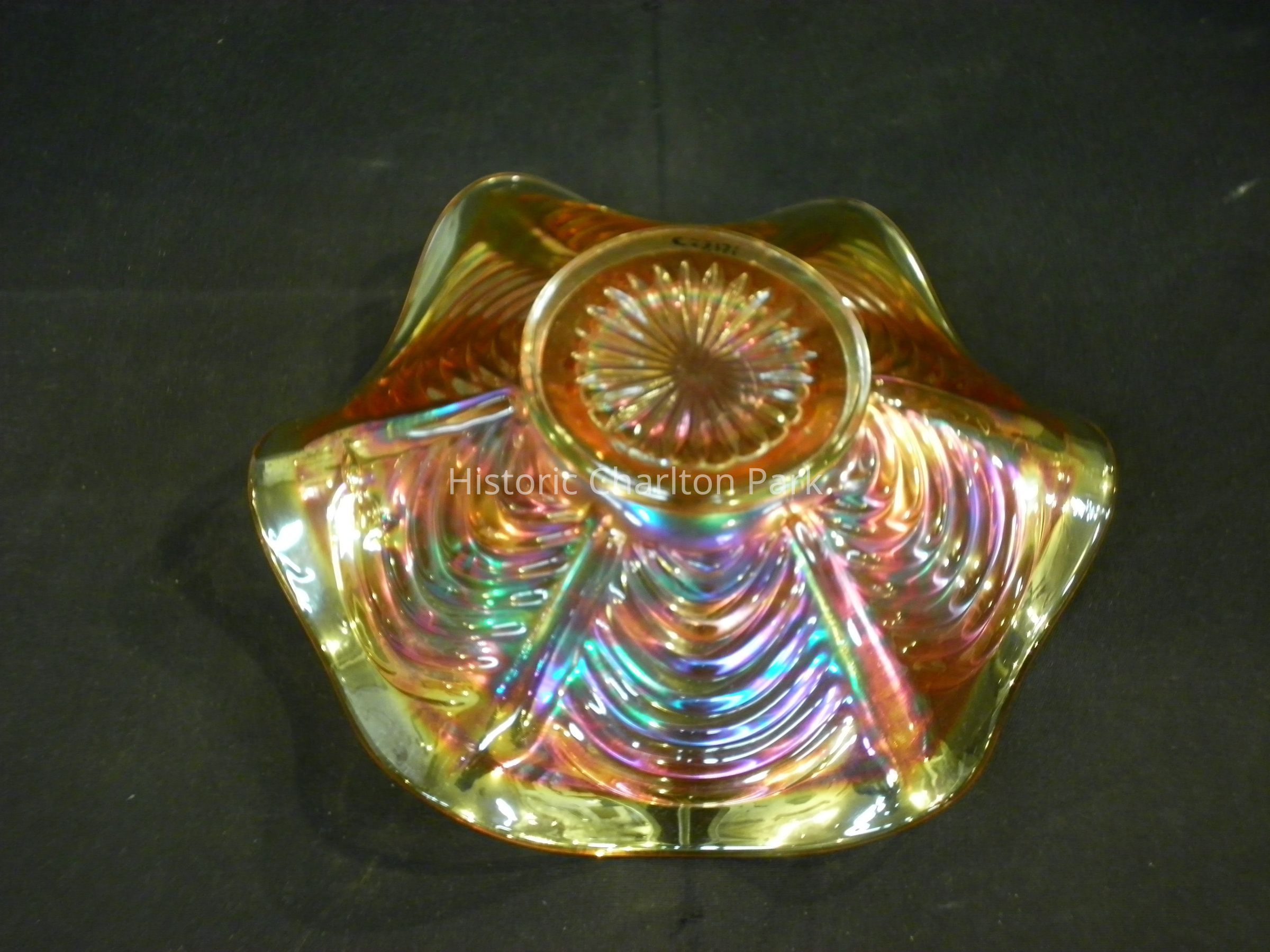 Carnival glass candy dish, marigold color. Similar to "Nippon" or "Drapery" or "Cut Arcs" pattern, but not a clear correlation.Acquisition