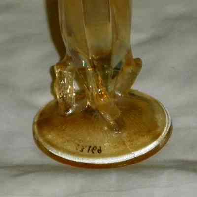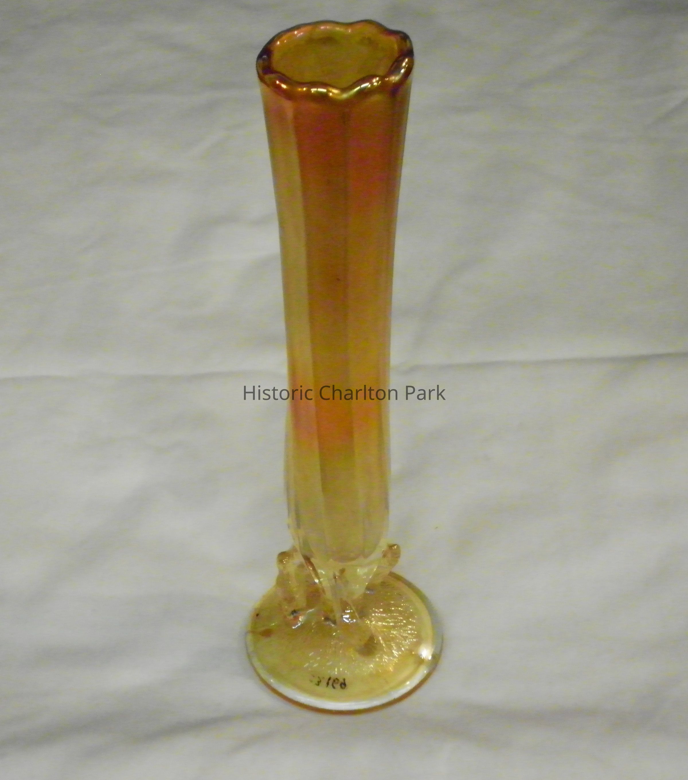 Carnival glass bud vase, unusual pattern on feet and up vase body. Tree branches support the body of the vase. More than likely "Twigs/Beauty Bud" pattern, made by Dugan Glass Company from around 1910-1931.Acquisition