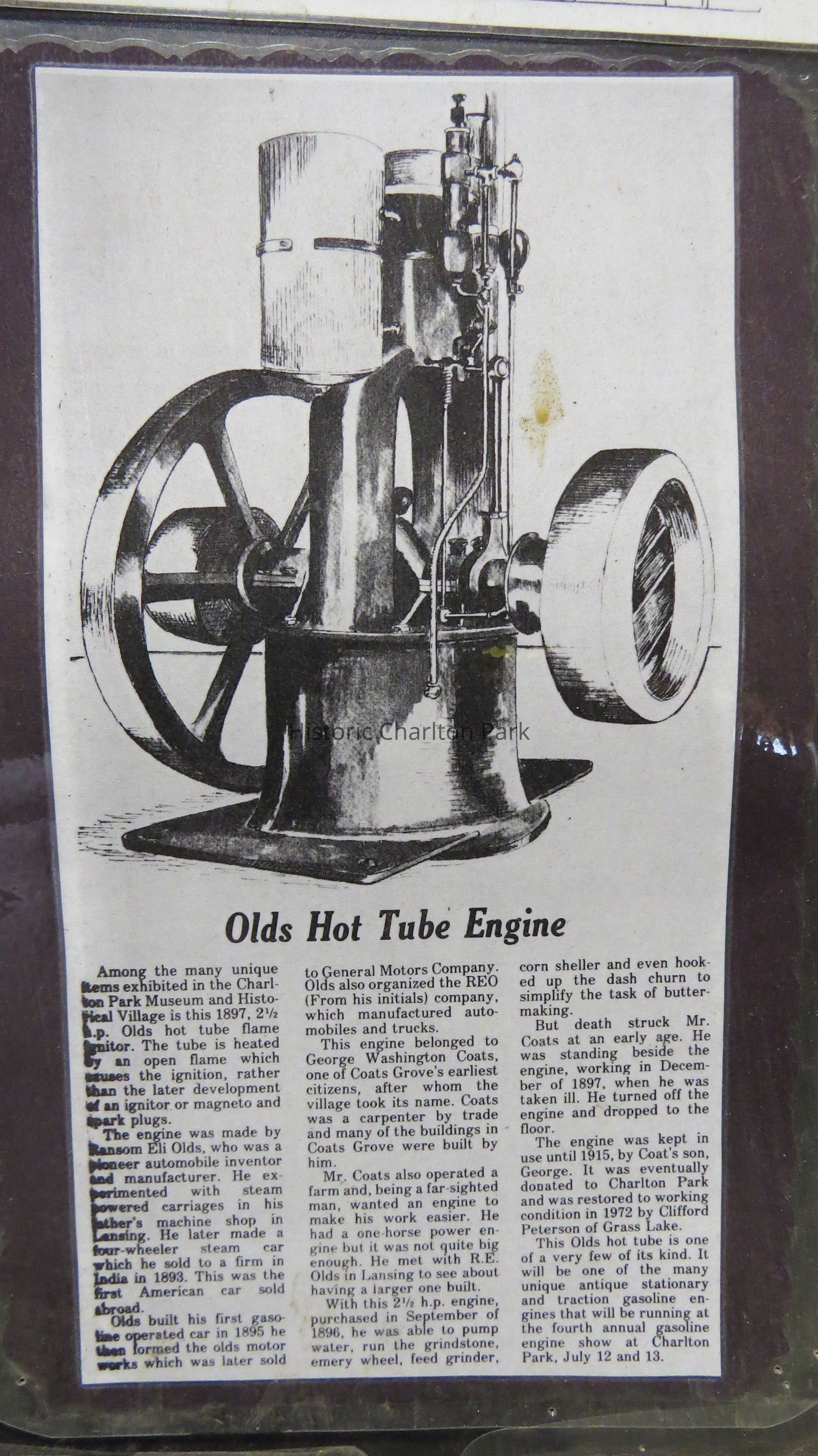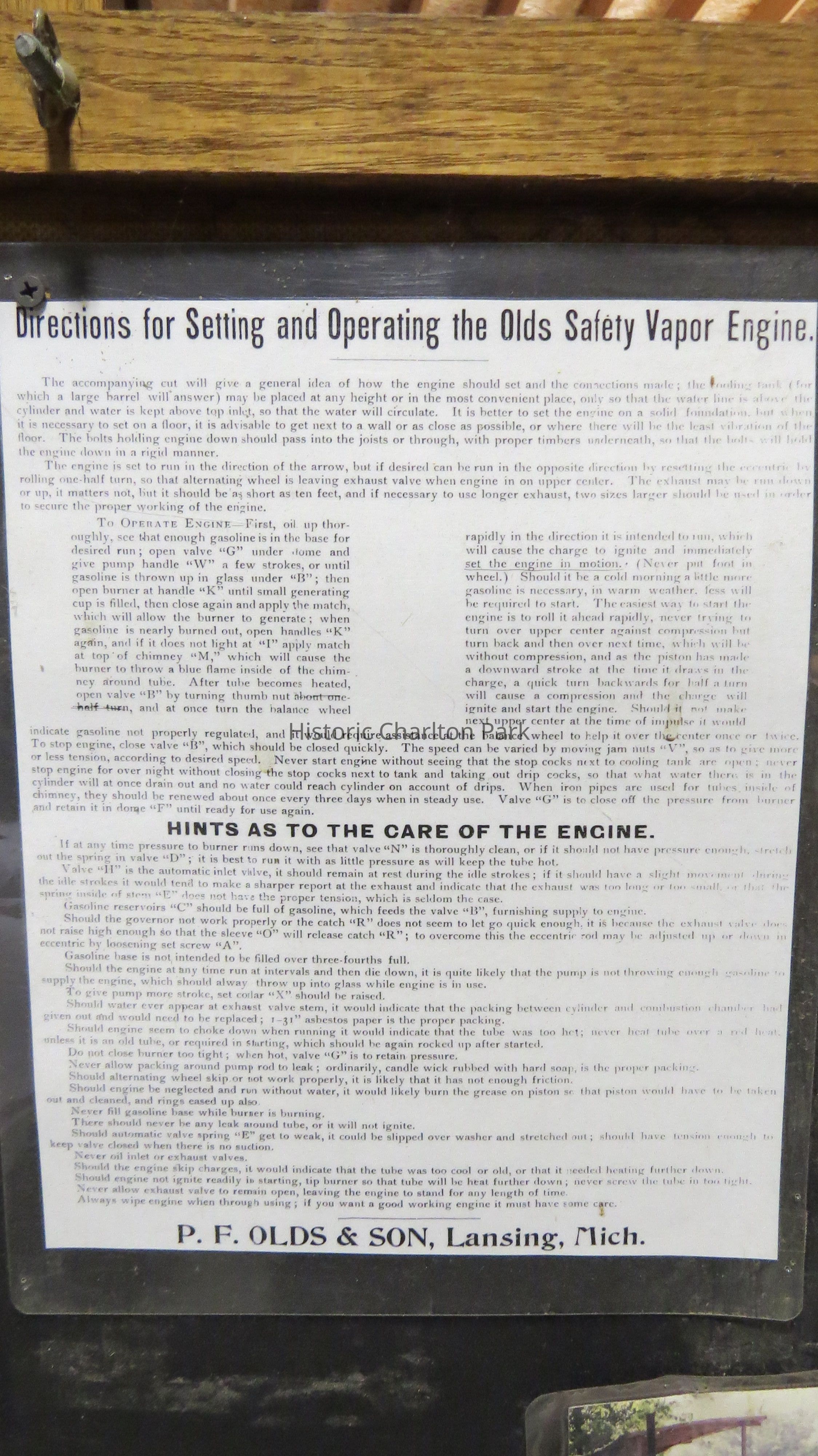 Gas engine made by the R.E. Olds in Lansing, MI. This engine is 2.5 hp and was purchased by George Washington Coats in 1896. He used it to pump water, run grindstone, corn sheller and butter churn.