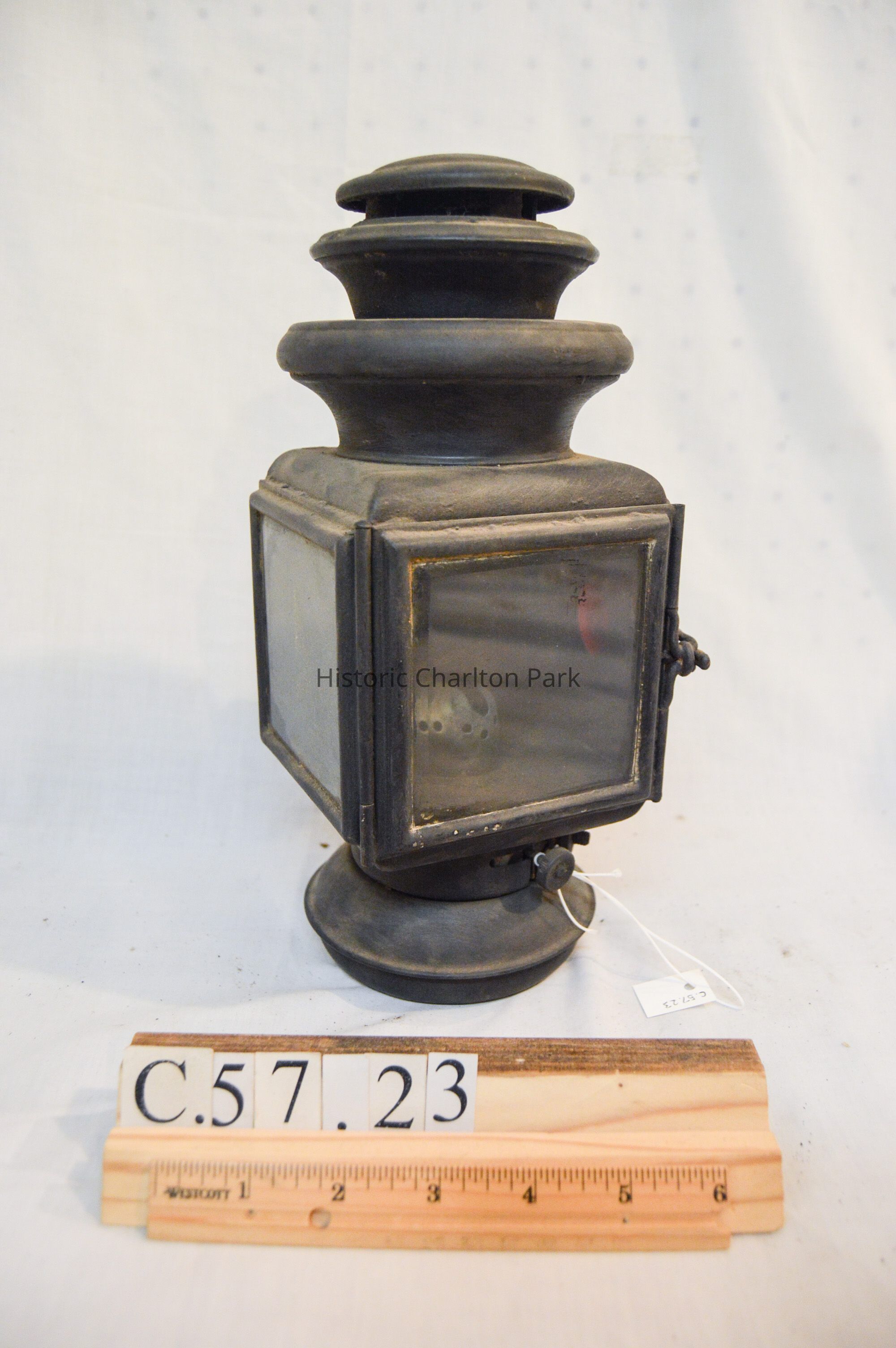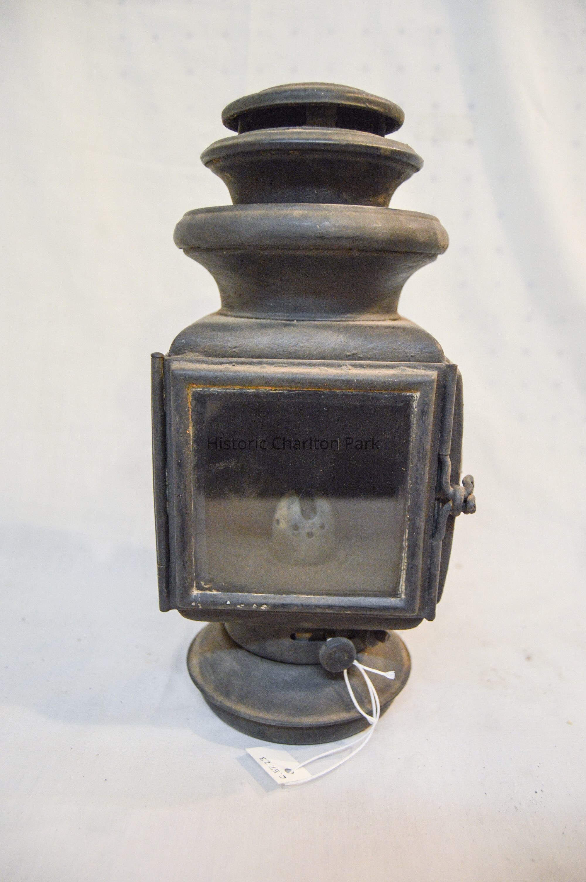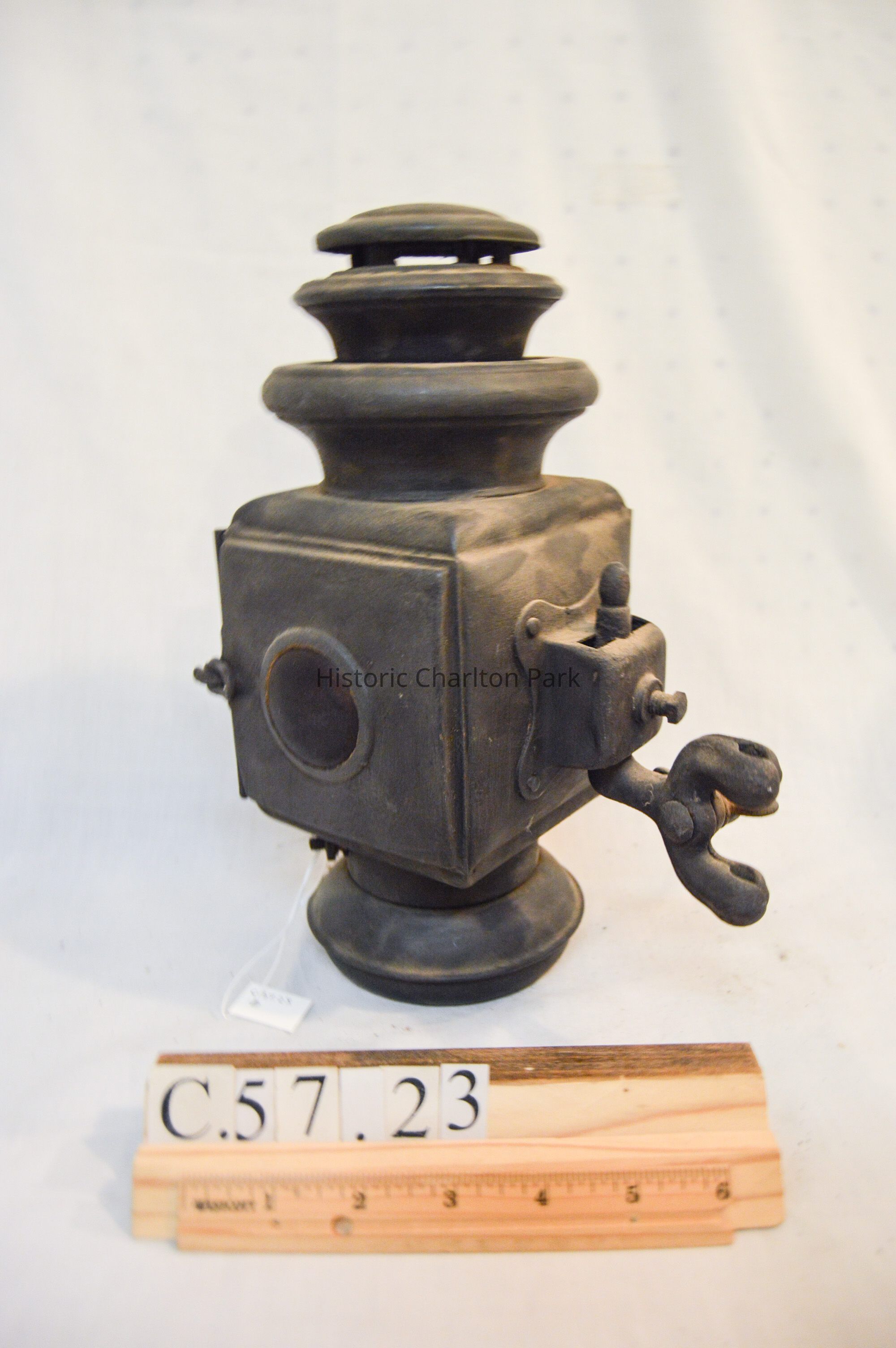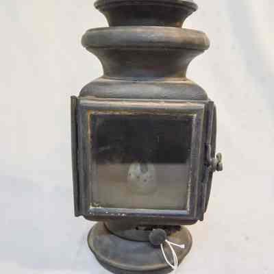 Kerosene driving lantern made of metal and black in color. The base is circular and supports the cube-shaped body. Two of the sides of the body are glass squares, and two are made of metal. One of the metal sides has a circular, red glass reflector in the center. The other metal side has a bracket with an attached bracket arm. The arm has dual clamps on the end and is tightened by a wingnut. There is a dome-shaped emitter inside the lamp with a wick inside, and a burner knob on the base. The top of the lamp is circular and has three stacked discs. The bottom and middle discs have circular vents around them and the top is slightly convex.
