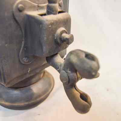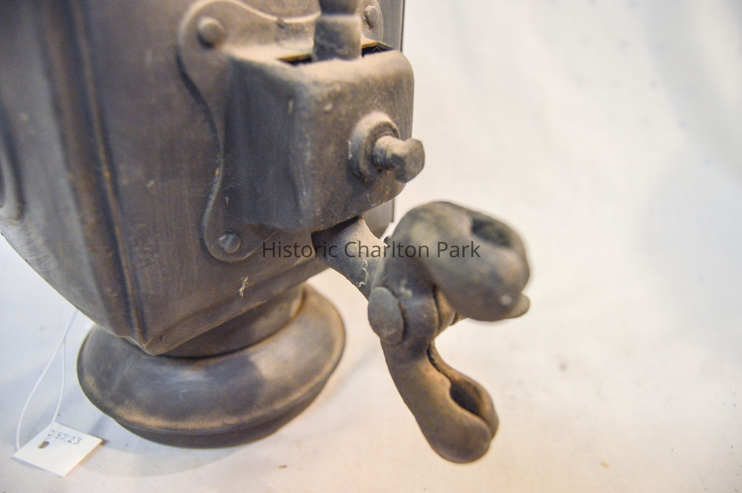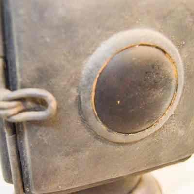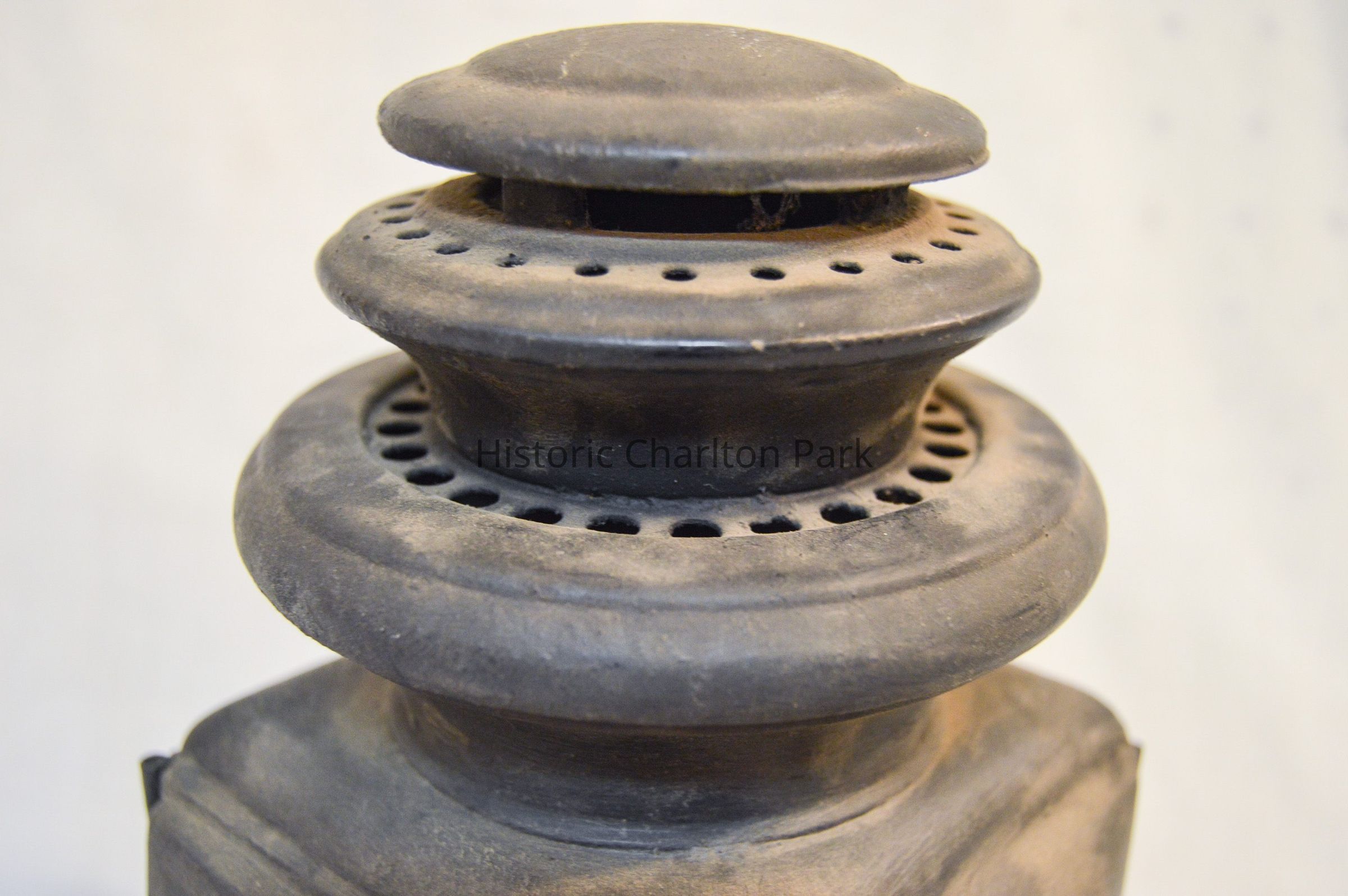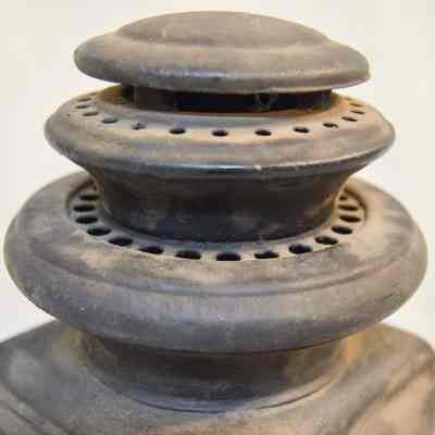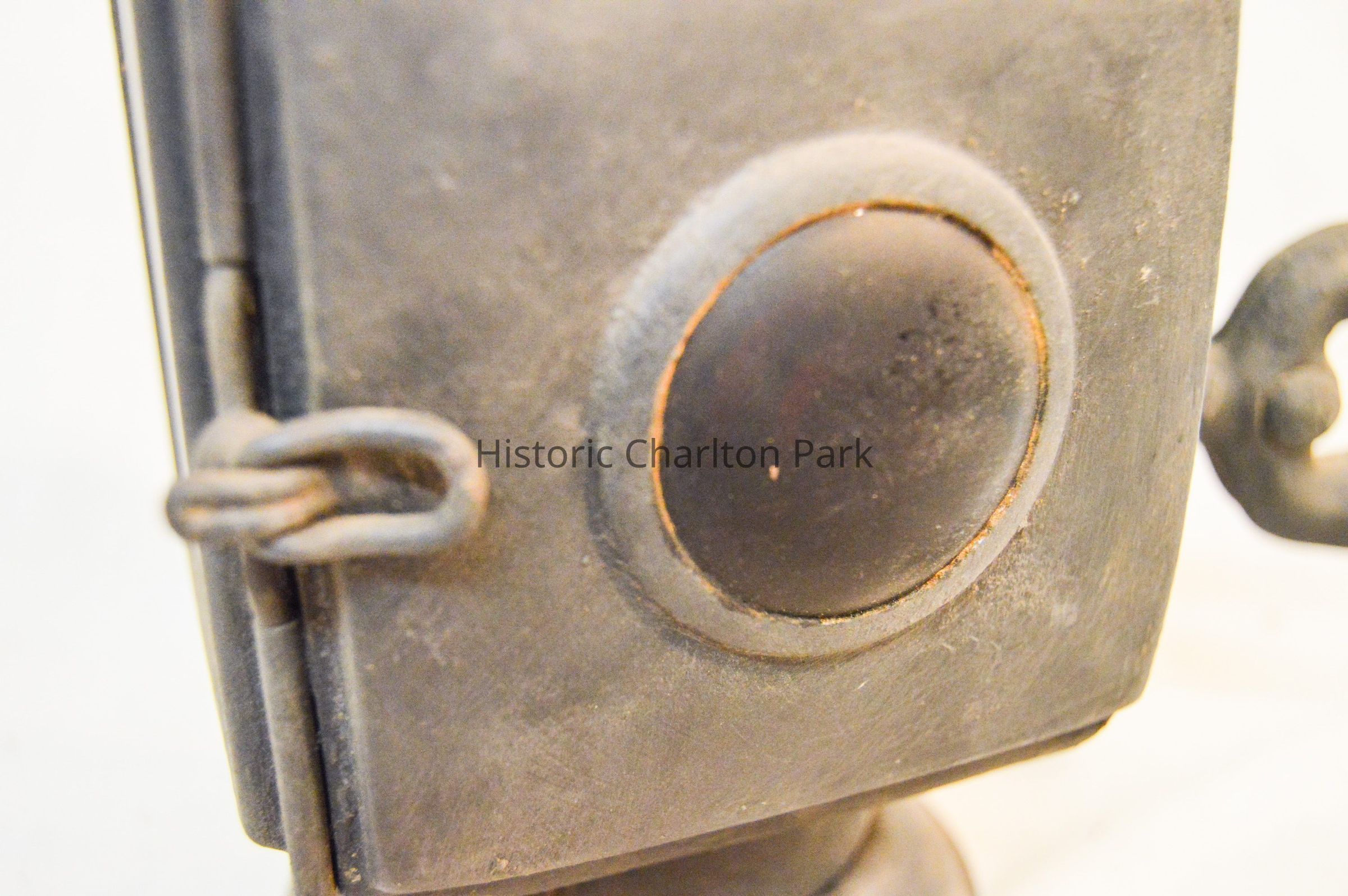 Kerosene driving lantern made of metal and black in color. The base is circular and supports the cube-shaped body. Two of the sides of the body are glass squares, and two are made of metal. One of the metal sides has a circular, red glass reflector in the center. The other metal side has a bracket with an attached bracket arm. The arm has dual clamps on the end and is tightened by a wingnut. There is a dome-shaped emitter inside the lamp with a wick inside, and a burner knob on the base. The top of the lamp is circular and has three stacked discs. The bottom and middle discs have circular vents around them and the top is slightly convex.