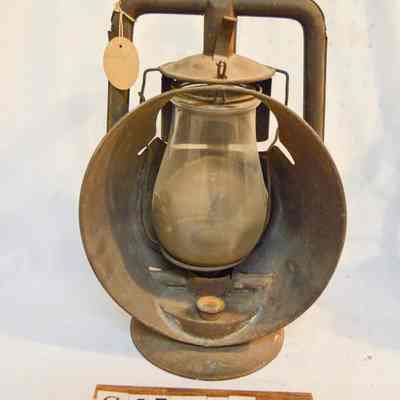 A: The lantern has a cylindrical base and a large, rectangular frame. The burner and glass chimney are positioned in the center of the base and surrounded by a very large, conical reflector. The reflector is flat on the back and has an inscription. The chimney is capped by a a flat, circular piece of metal hanging down from the frame by a tube. A large handle is connected to the top of the frame and has a circular loop that connects to the back of the reflector. There is a fuel cap at the front of the base.
