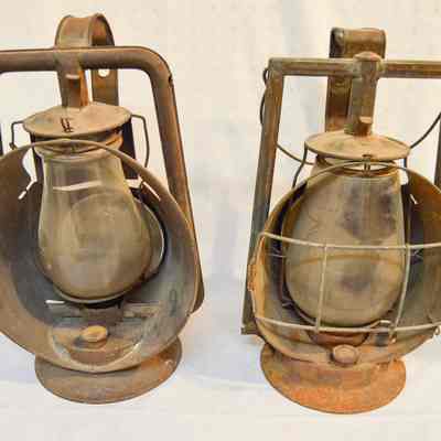 B: Similar lantern to object A. The lantern has a cylindrical base and large, rectangular metal frame. The oil burner and glass chimney are positioned in the center of the base, and there is a small, circular knob extending off the right side of the burner. A circular fuel cap is also on the front of the base. The chimney is surrounded by a large, conical reflector with a metal grate on the front that swings open on a hinge and clasps shut. The chimney is capped by flat, circular piece of metal that hangs down from the frame by a tube. The frame has two handles attached, one a looped wire handle and the other a rectangular one attached at the top of the frame and the back of the reflector.Inscription/Signature/Marks