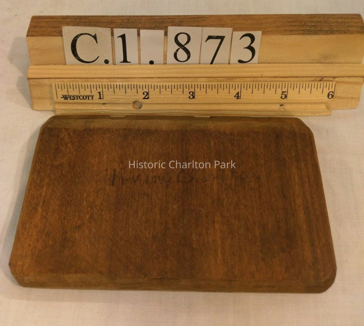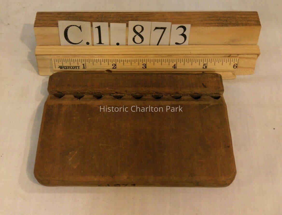 This is a homemade "harmonica" or mouth organ. It is 5.5"X3.5"X.5" board with 3/8" holes drilled to graduated depths. Pegs with top side removed for air passage and beveled downward in front. The top side has a notch sloped from back to front for air escape.Acquisition