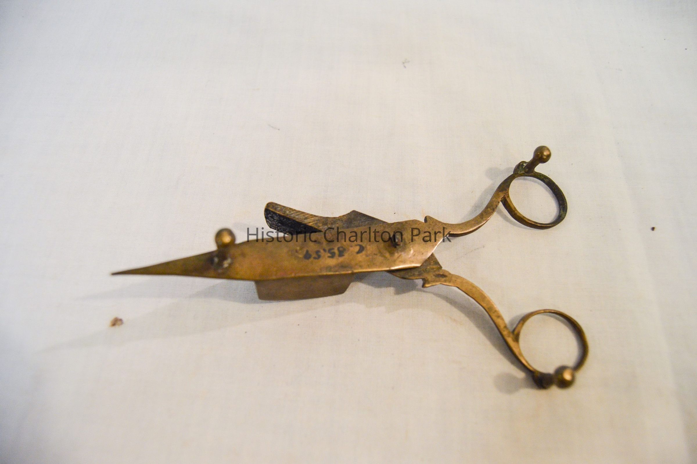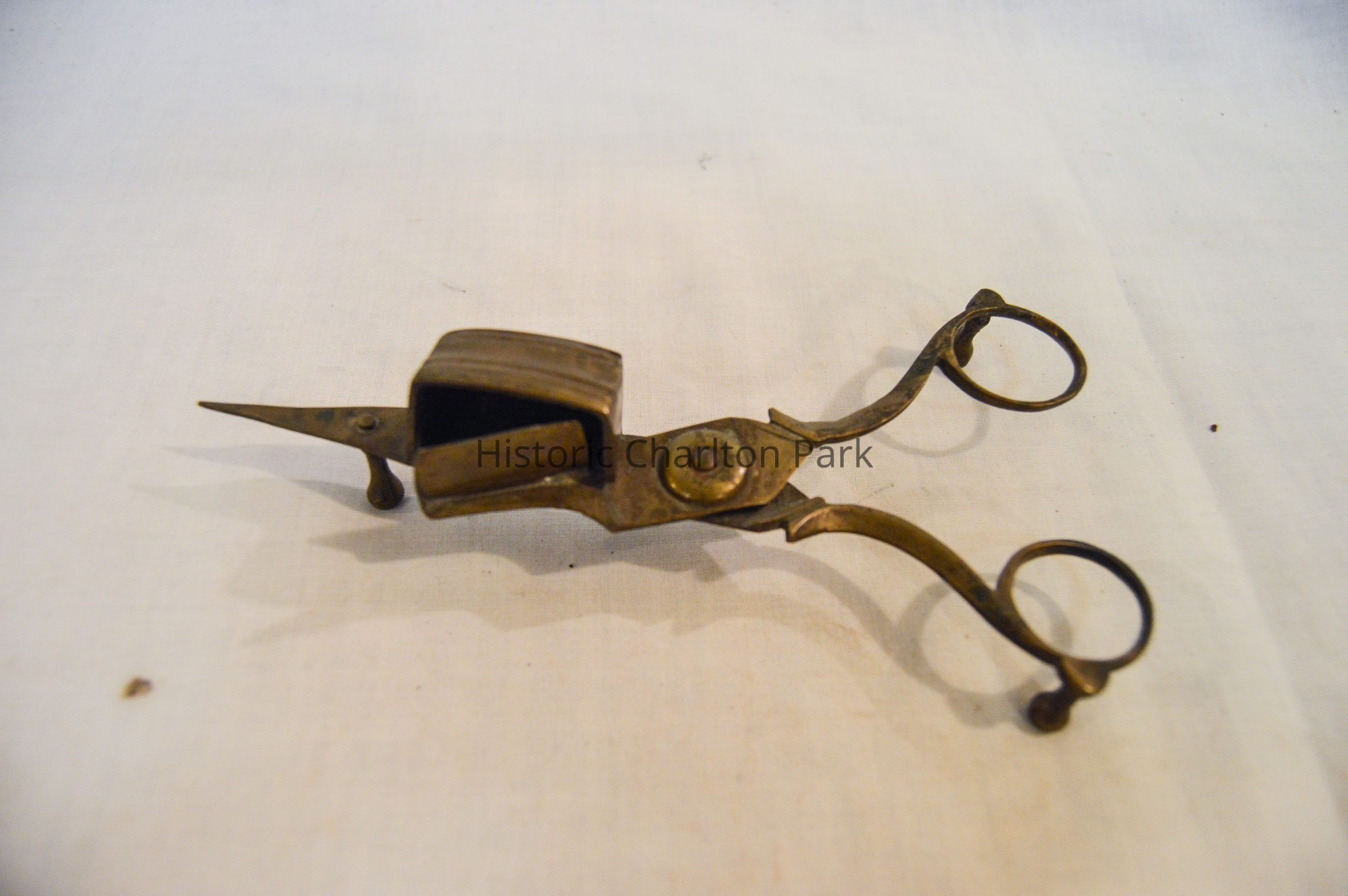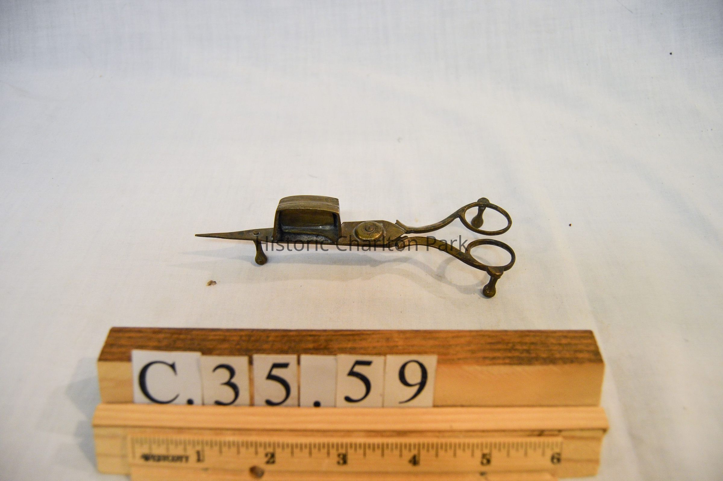 Metal candlesnuffer consisting of two round grips and a box that are attached to a pair of shears. The grips are circular and each have a small metal leg on the outer edge. The arms of the shears begin at the grips and curve inwards, meeting in the center with a circular bevel and small pin attachment through the center. The box rests on top of the shears and consists of two parts, each attached to a separate shear arm. There are two indented lines across the top of the box. One side is hollow and the other is flat. Just before the pointed end of the shears, there is a small metal leg extending out the bottom.Dimensions