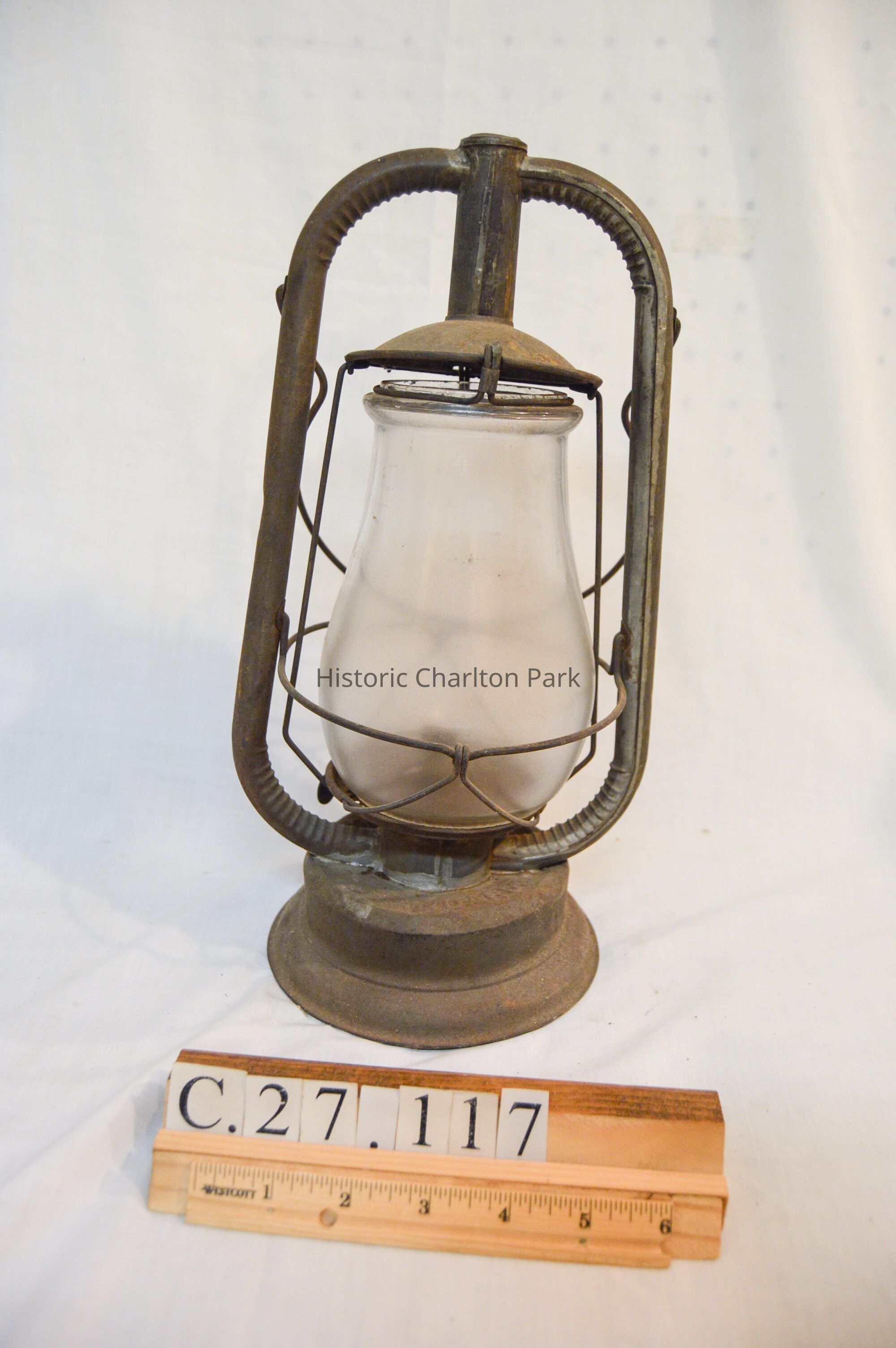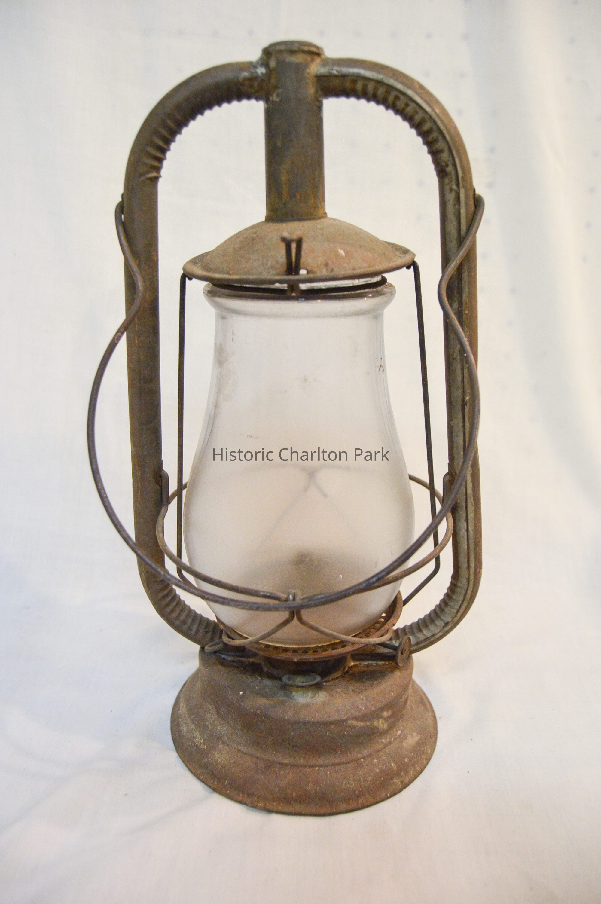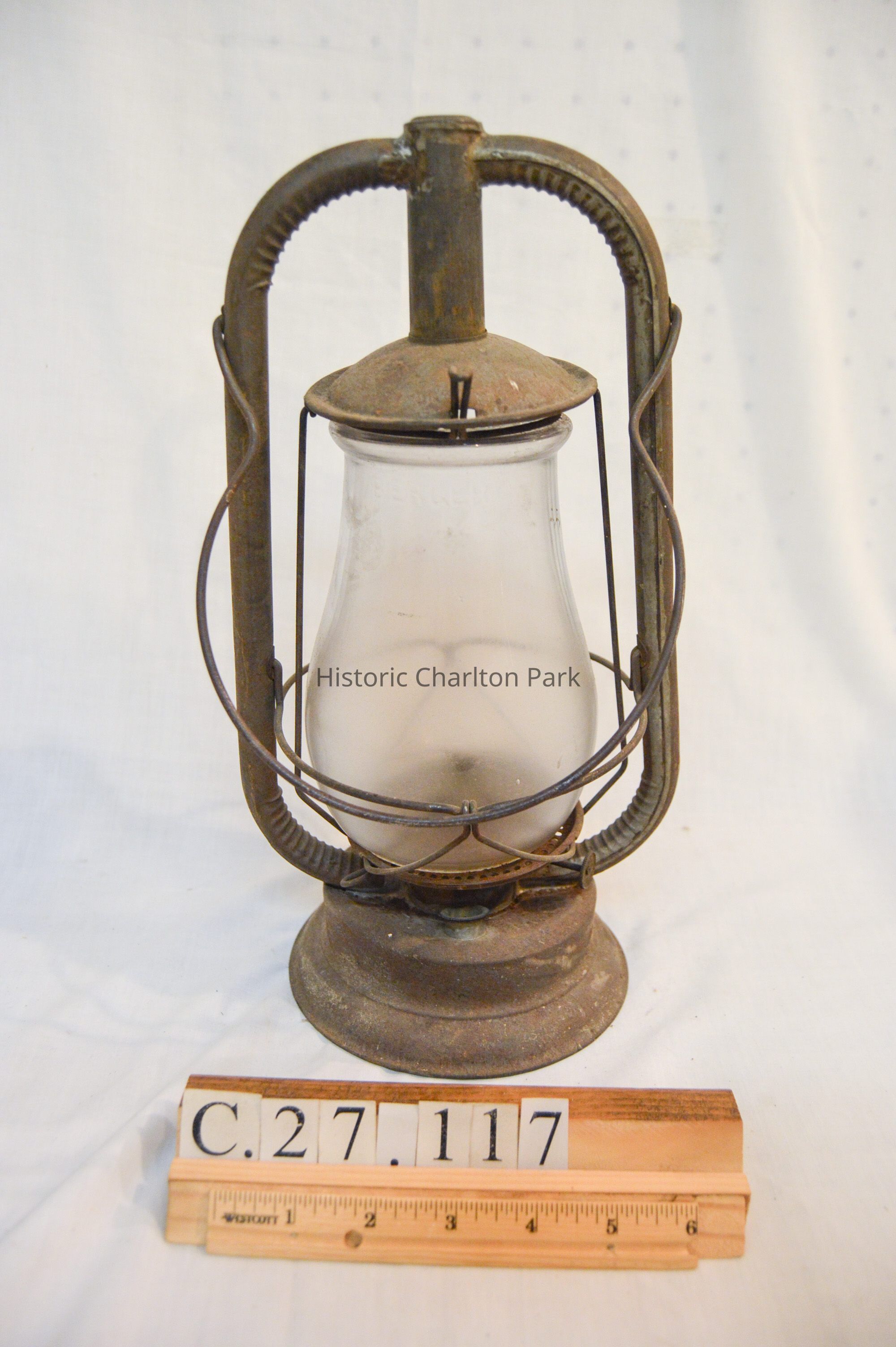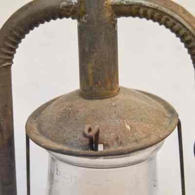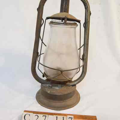 Kerosene lantern made of metal and glass. The base of the lantern is circular and has a round fuel cap on the front. The burner is attached to the center of the base and consists of a round knob at the bottom, a ring with circular vents, and an emitter with a wick inside. A pear-shaped glass chimney encloses the burner. A metal wire frame surrounds the chimney, with two bars on the sides, a ring around the middle, and two larger frame arms that support the chimney cap. The cap is dome-shaped and covers the top of the chimney. There is a looped metal handle attached to the larger part of the frame.Inscription/Signature/Marks