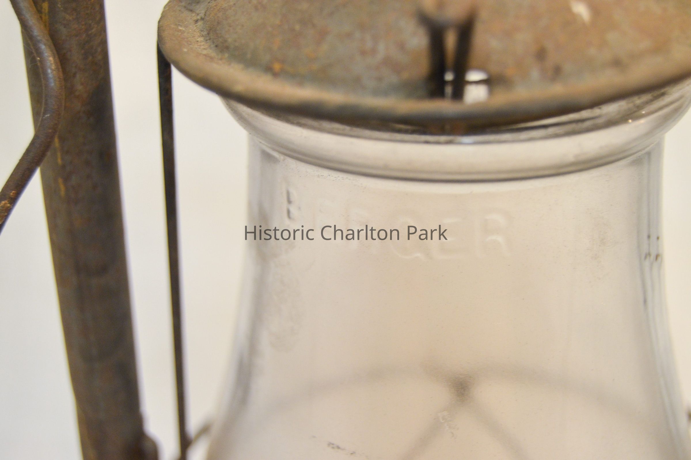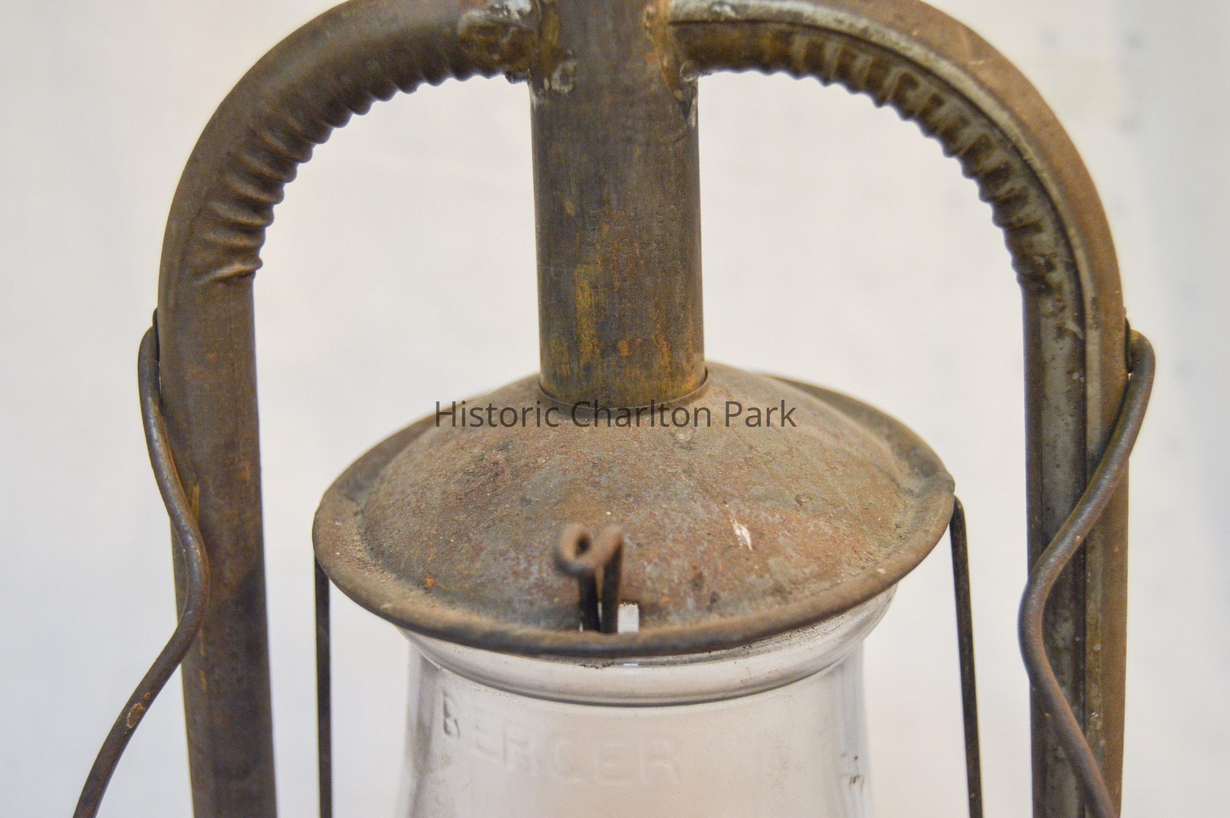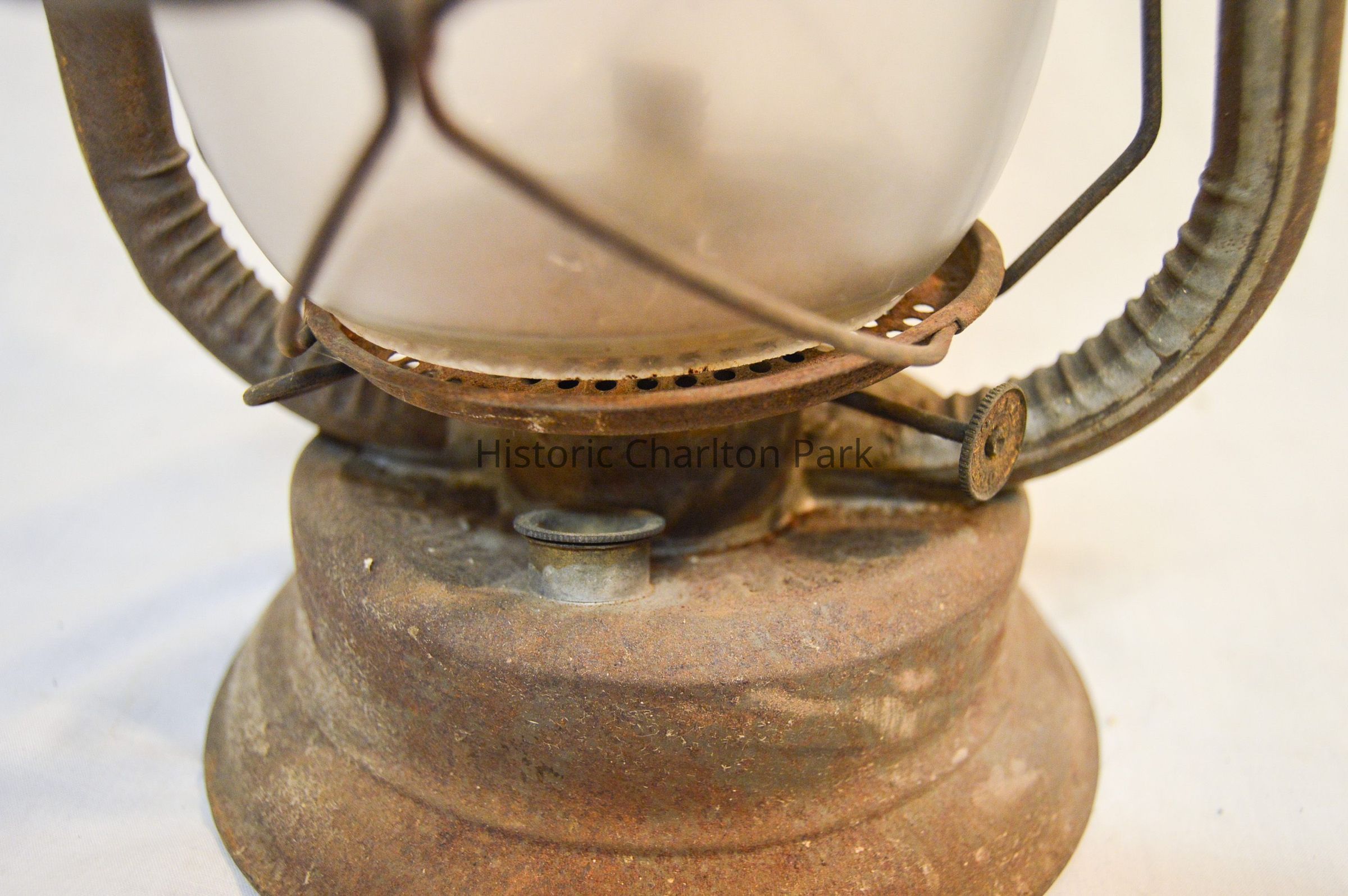 Kerosene lantern made of metal and glass. The base of the lantern is circular and has a round fuel cap on the front. The burner is attached to the center of the base and consists of a round knob at the bottom, a ring with circular vents, and an emitter with a wick inside. A pear-shaped glass chimney encloses the burner. A metal wire frame surrounds the chimney, with two bars on the sides, a ring around the middle, and two larger frame arms that support the chimney cap. The cap is dome-shaped and covers the top of the chimney. There is a looped metal handle attached to the larger part of the frame.Inscription/Signature/Marks