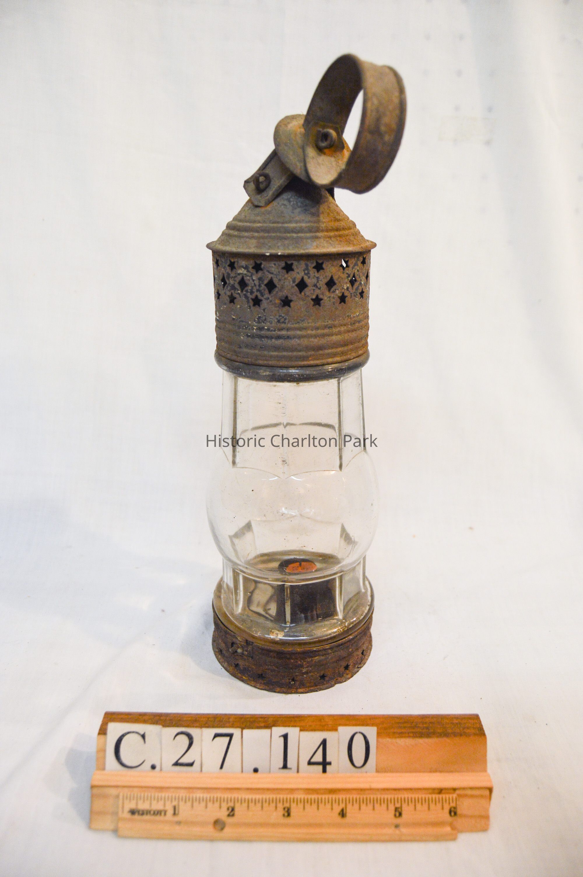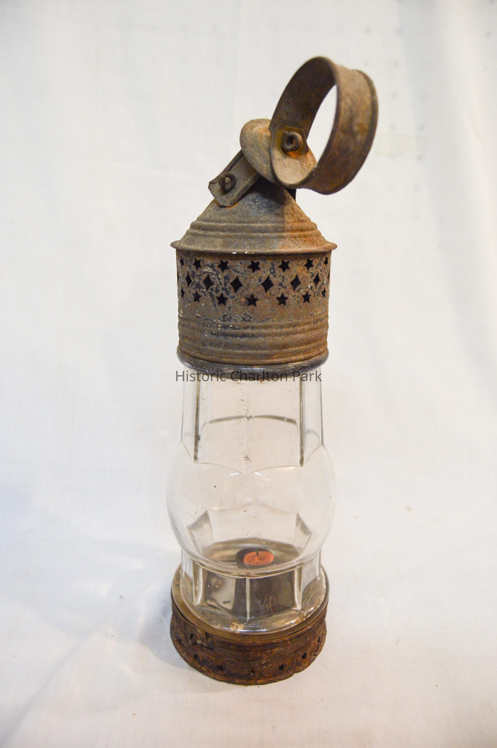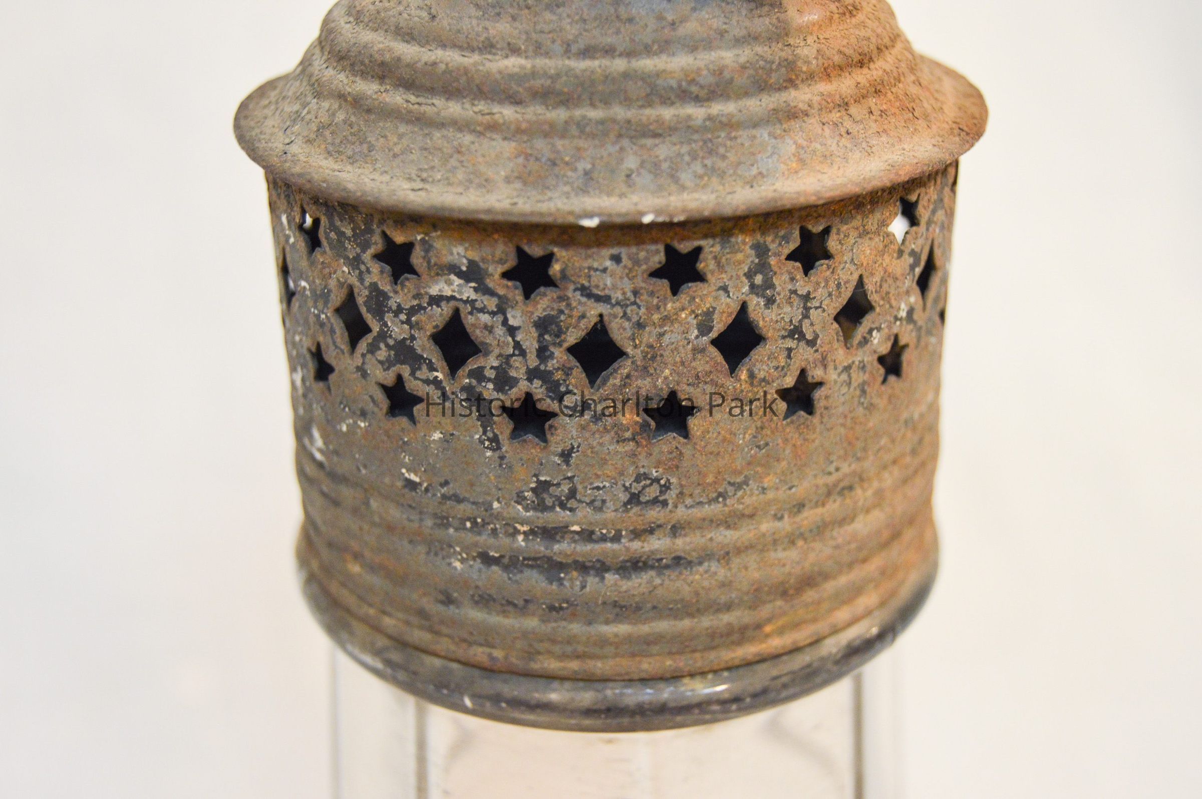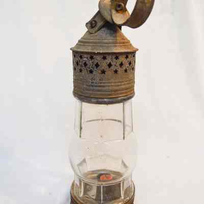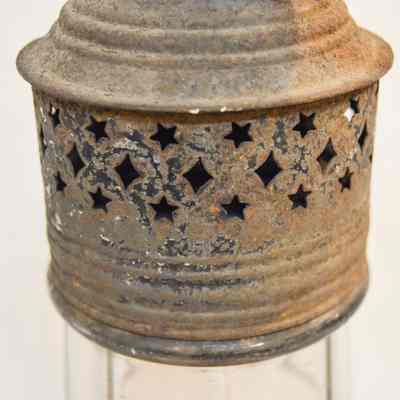 Metal and glass candle lantern. The base of the lantern is very short and cylindrical, with star-shaped vents around the side and a cylinder in the center with an orange candle. The lamp chimney sits on top of the base and is octagonal, with a spherical section in the middle. The top of the lantern has a cylindrical portion with a cone-shaped portion on top. There are more star-shaped vents and a circular handle attached to the tip.Dimensions
