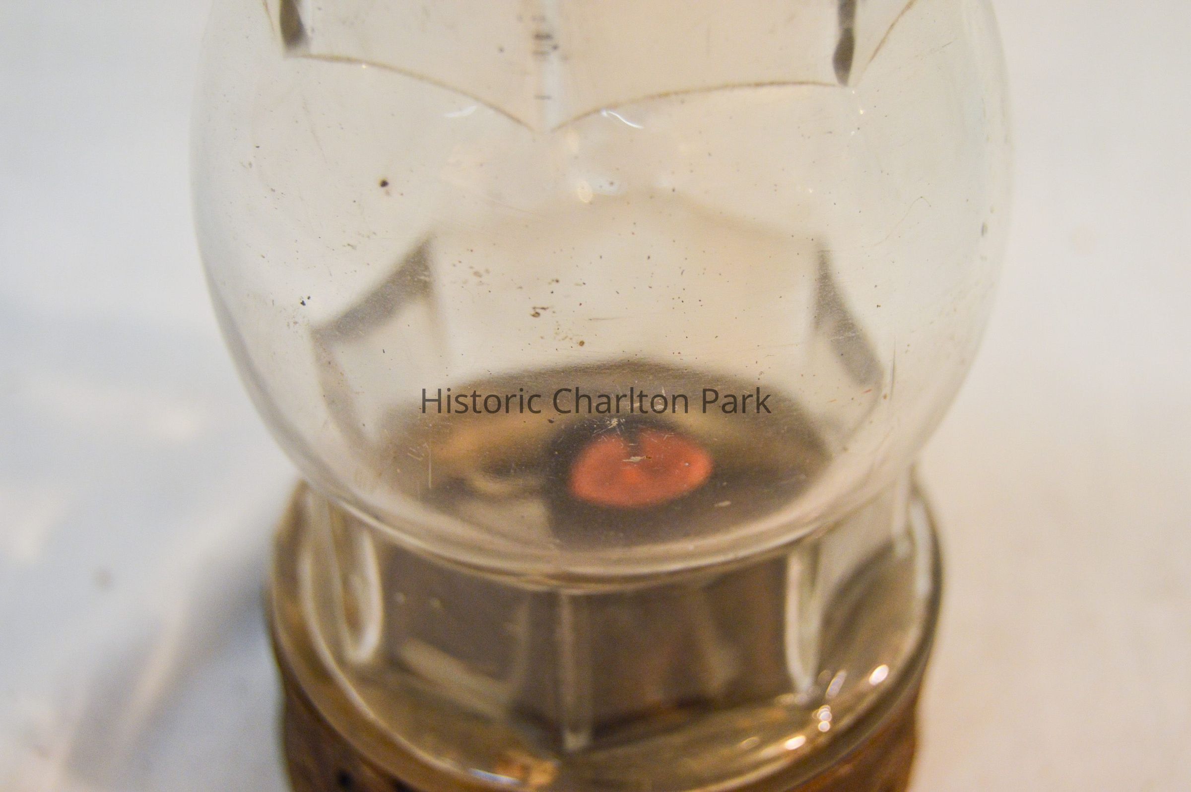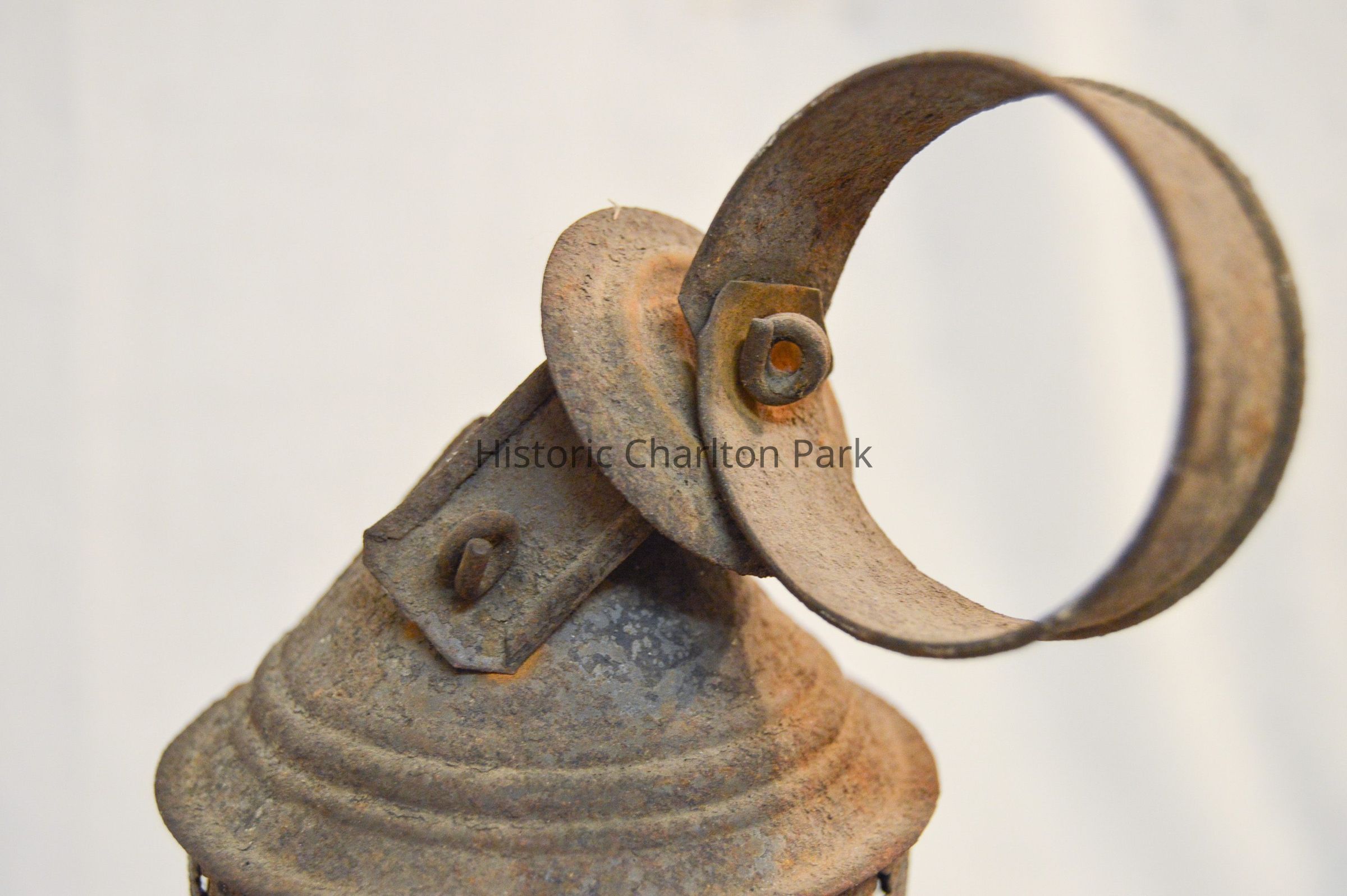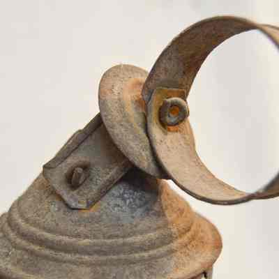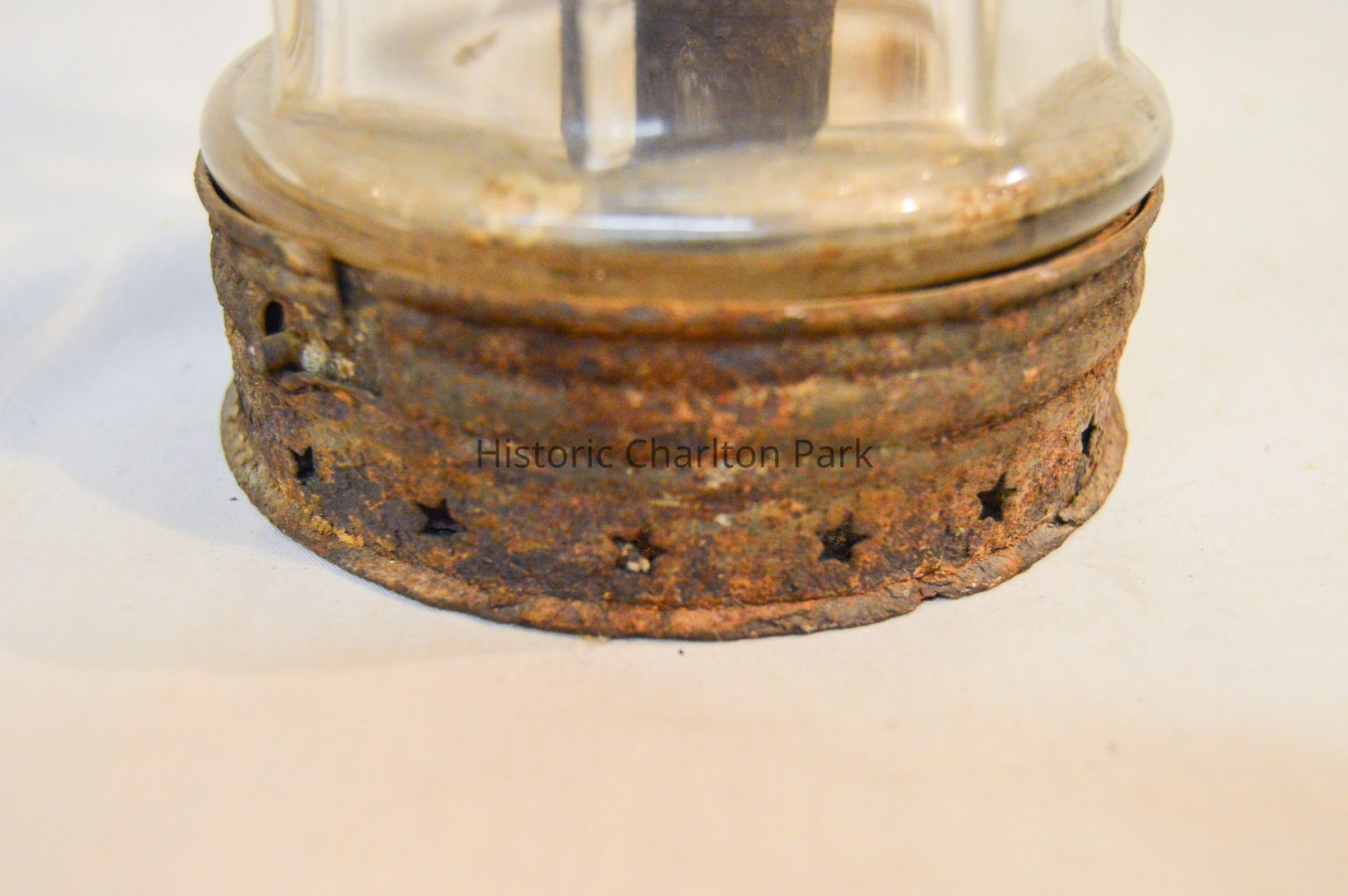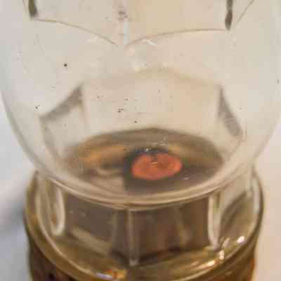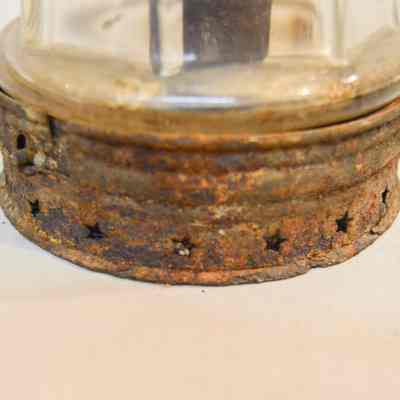 Metal and glass candle lantern. The base of the lantern is very short and cylindrical, with star-shaped vents around the side and a cylinder in the center with an orange candle. The lamp chimney sits on top of the base and is octagonal, with a spherical section in the middle. The top of the lantern has a cylindrical portion with a cone-shaped portion on top. There are more star-shaped vents and a circular handle attached to the tip.Dimensions