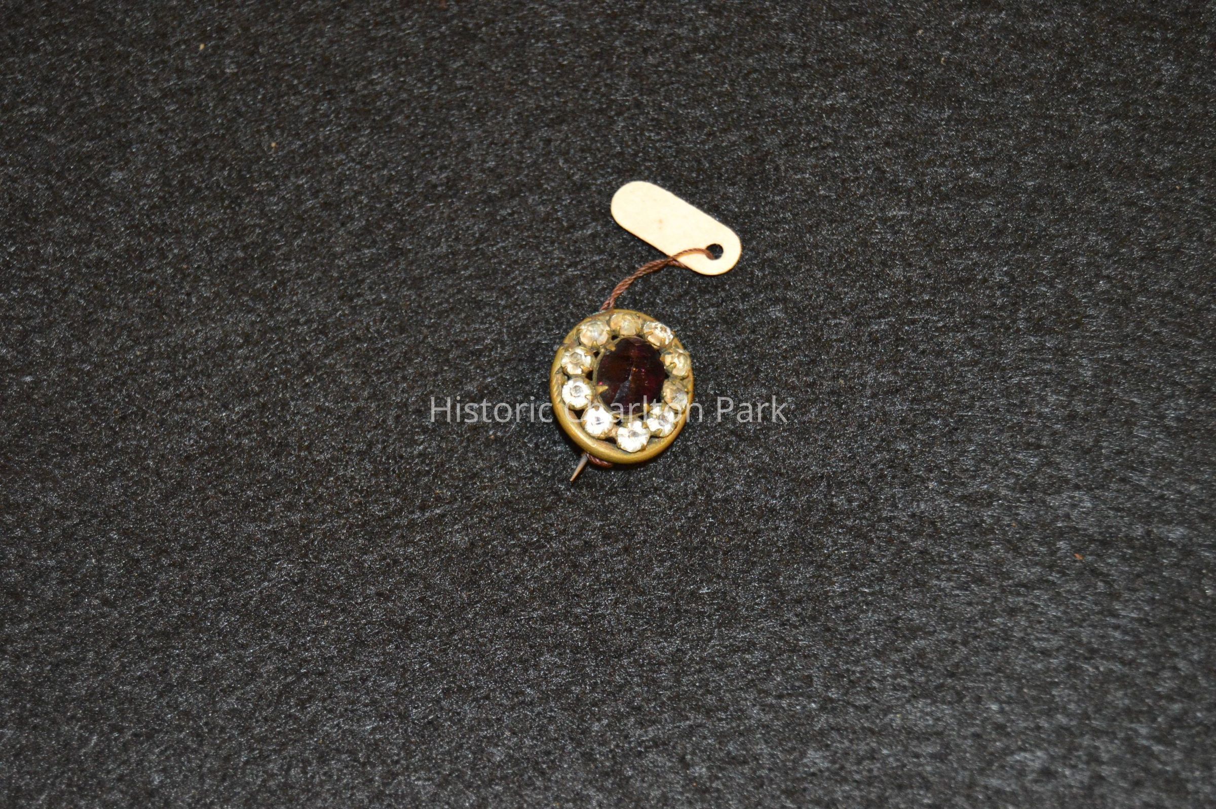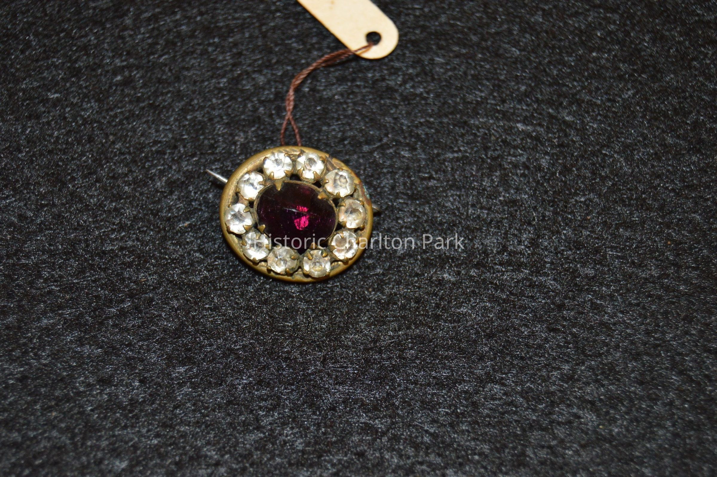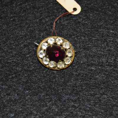 Small brooch/pin with clear stones around the outside, and a purple stone in the center.