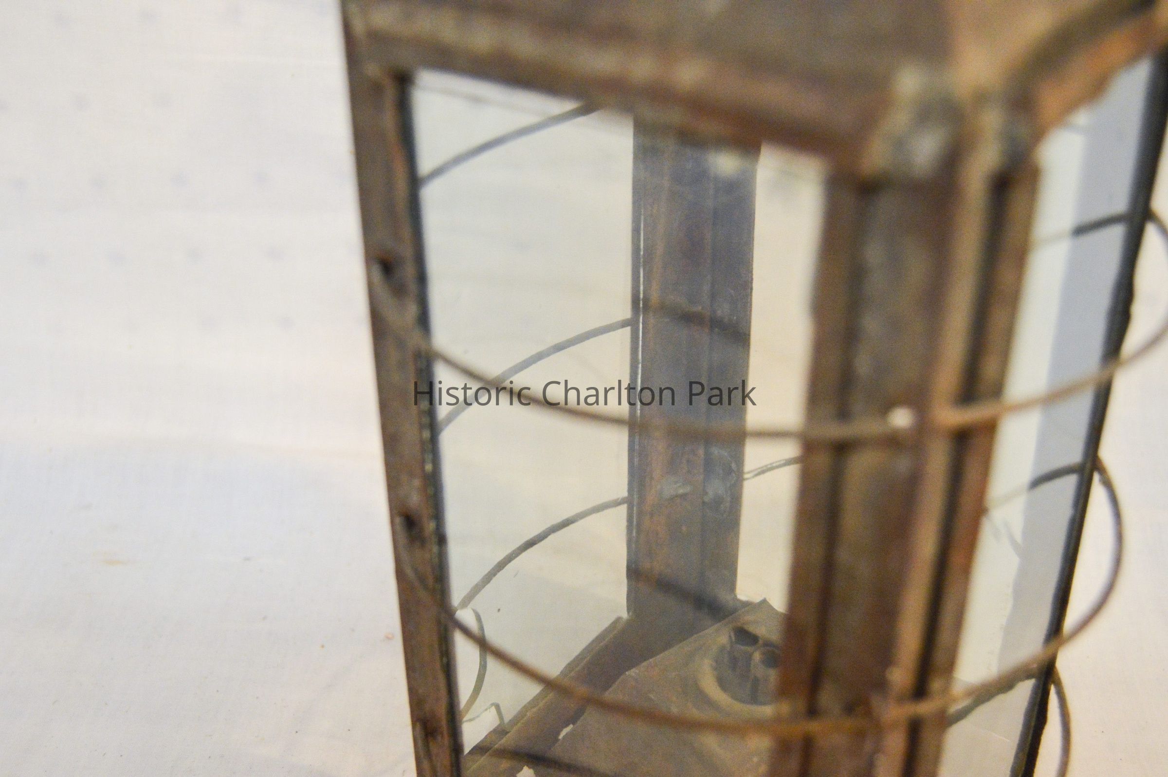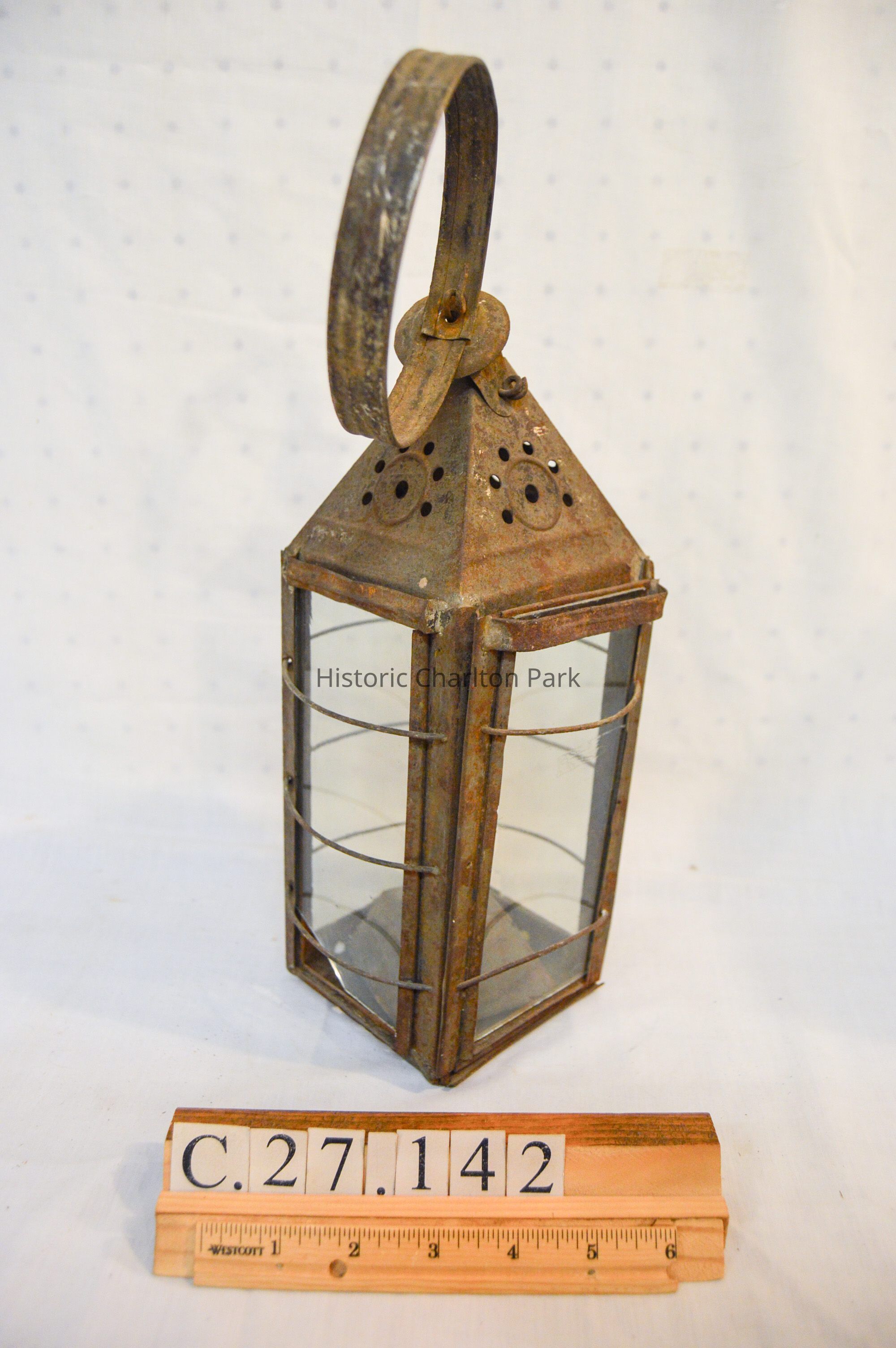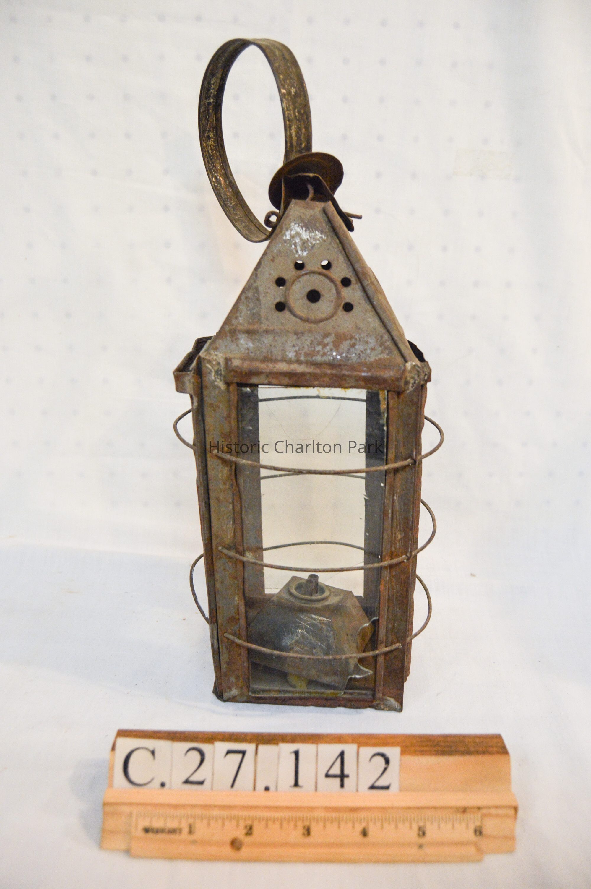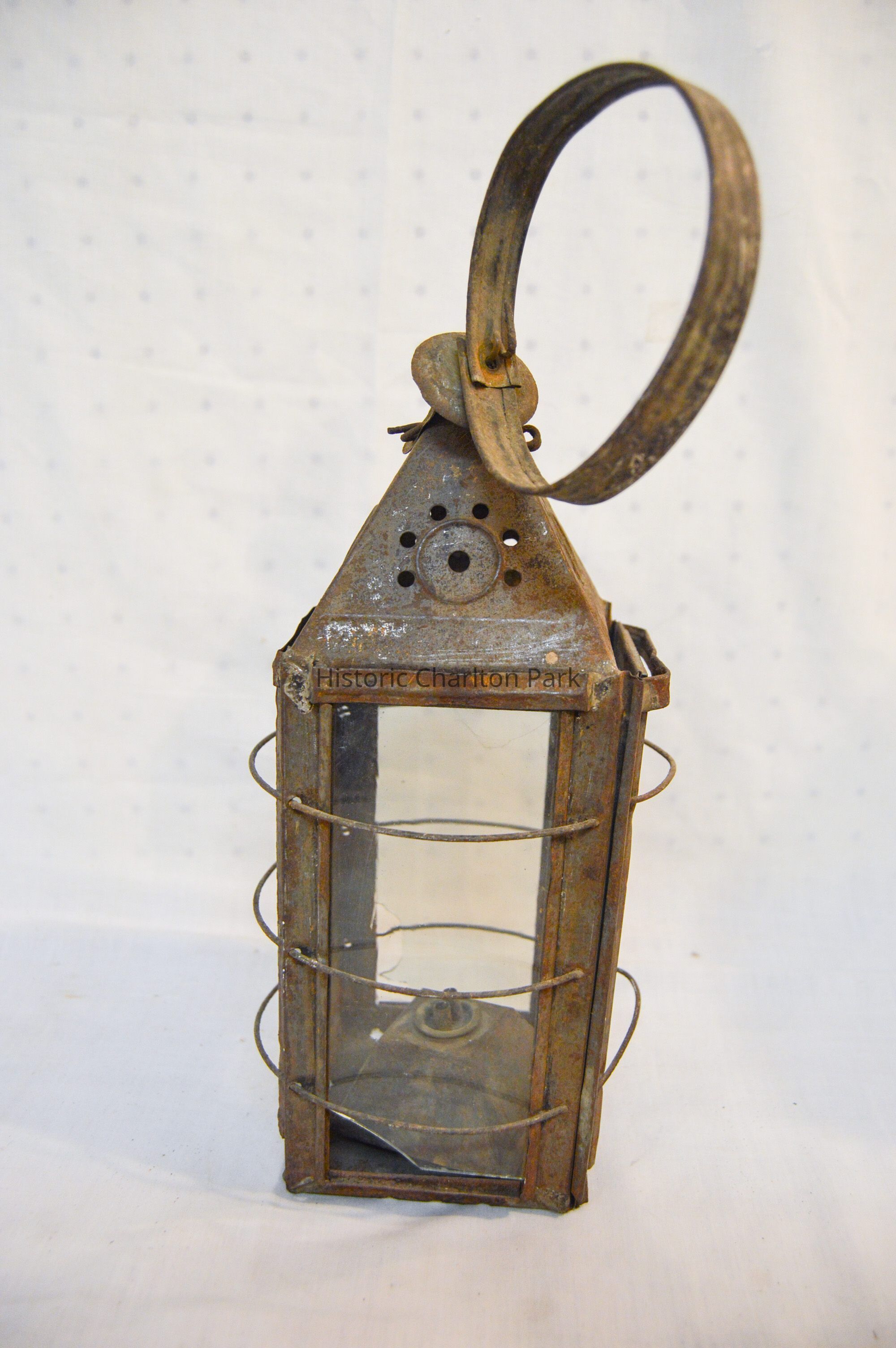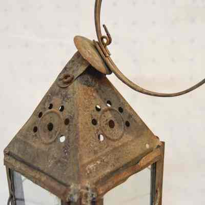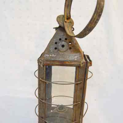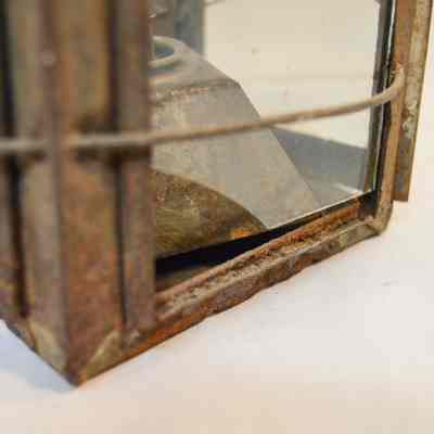 Metal lantern. The lantern has a square base and rectangular sides. Each of the sides have a glass panel in the center that slides up and out of a slot. Three metal rings surround the frame of the lantern. At the top, there is a pyramid-shaped cap with circular vents on each side, and a circular handle attached to the top. On the inside of the lantern, a small burner sits in the center with dual tubes sticking out of the top.Dimensions