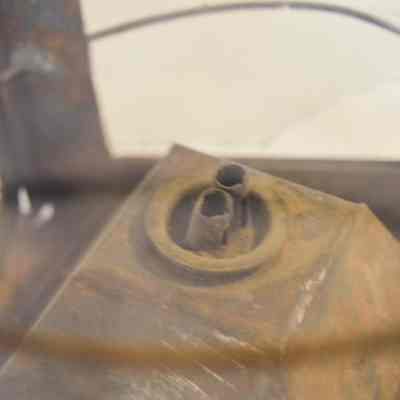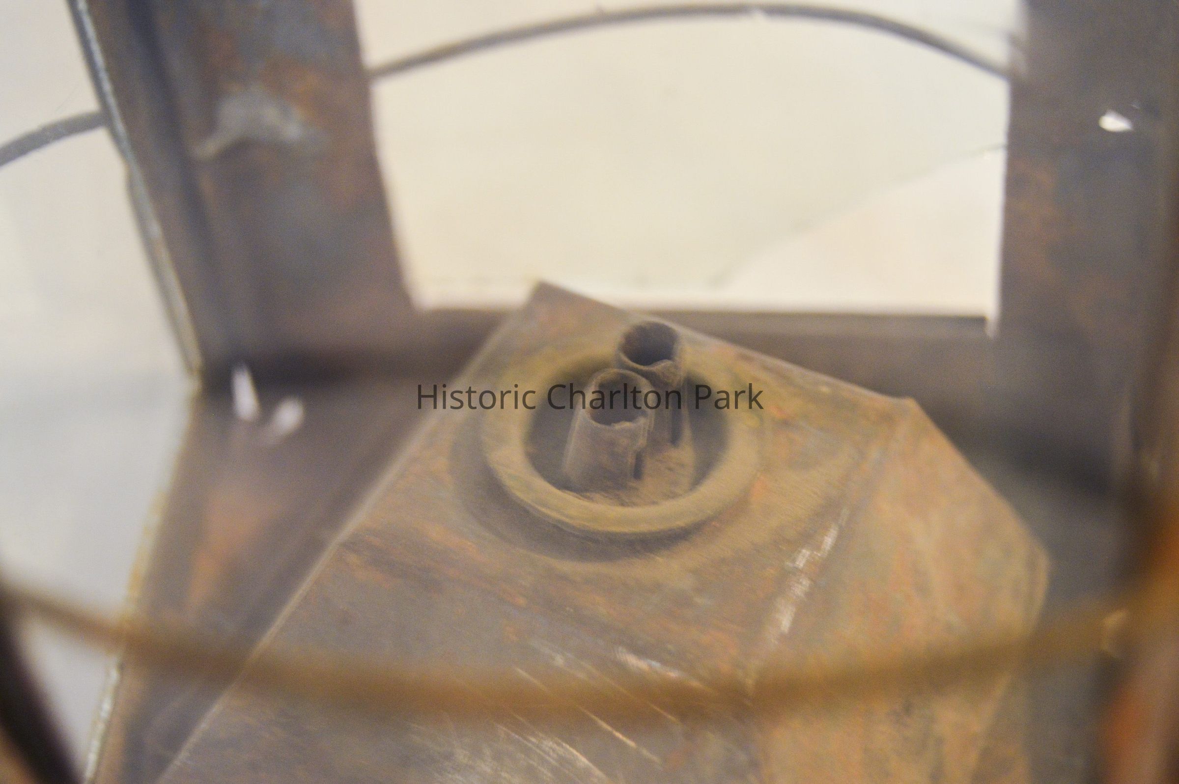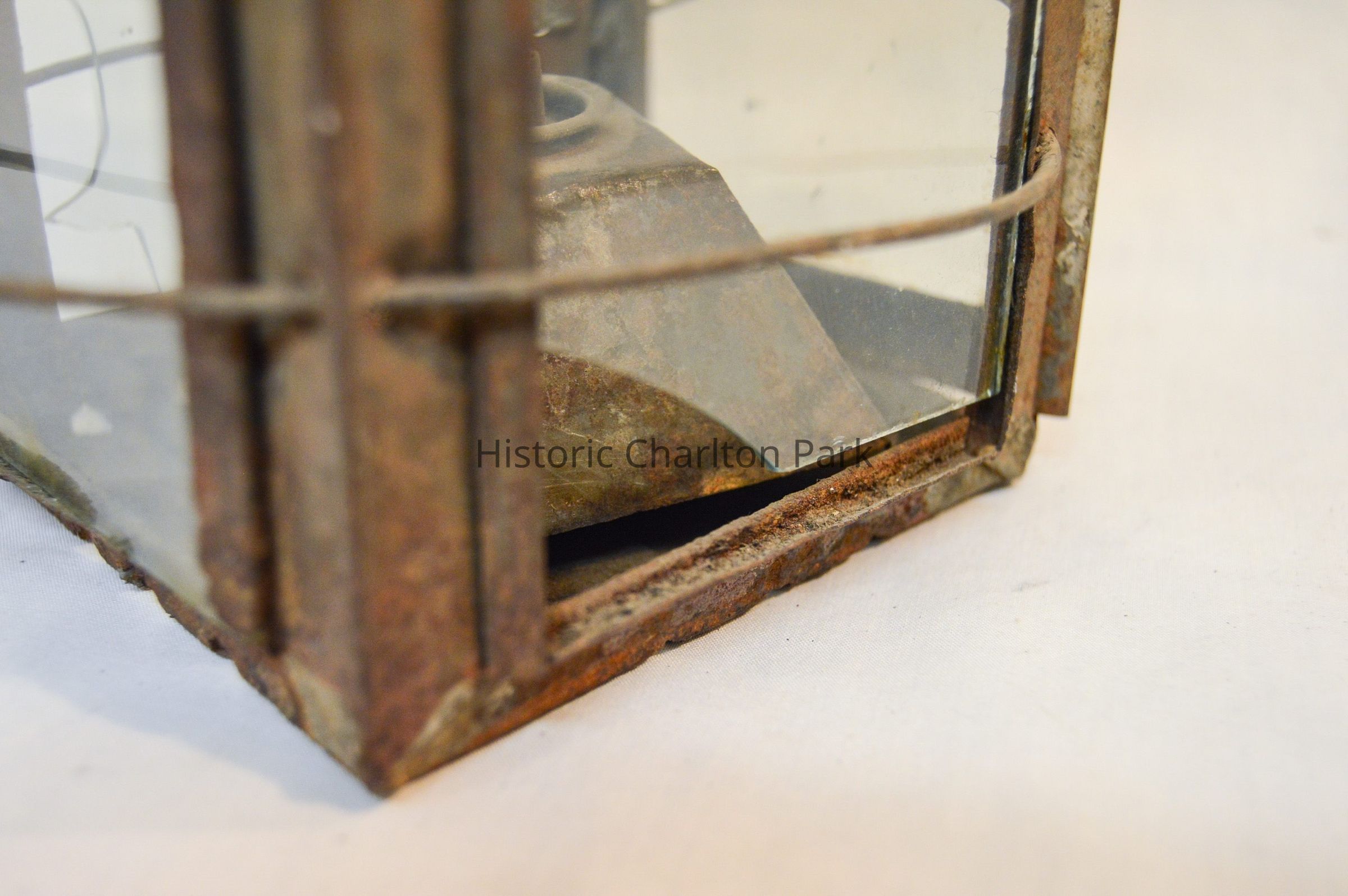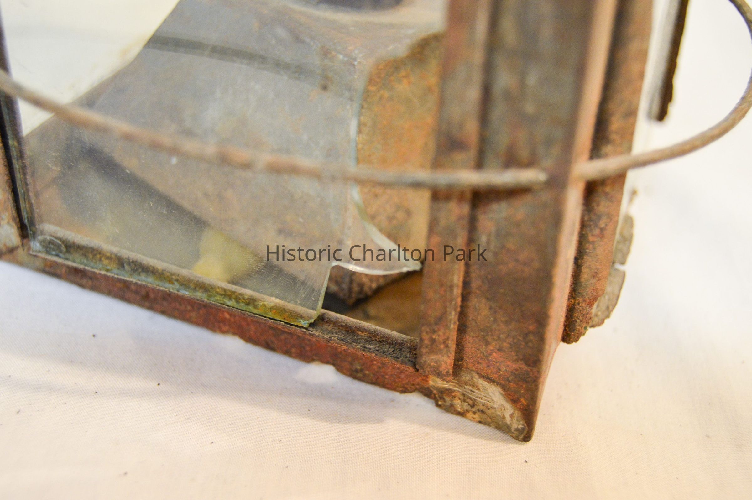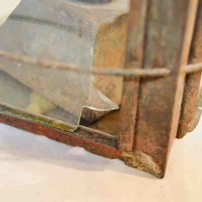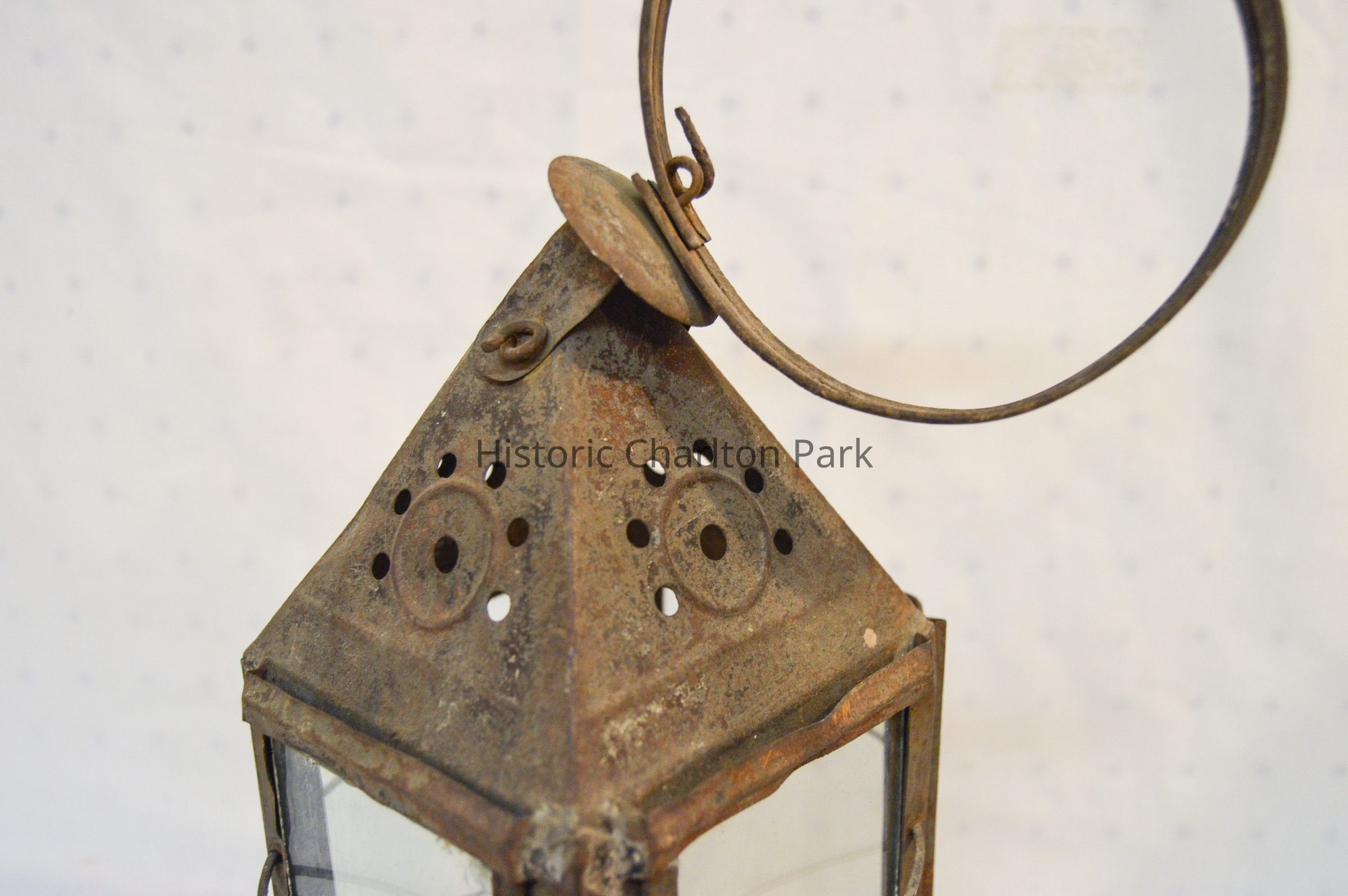 Metal lantern. The lantern has a square base and rectangular sides. Each of the sides have a glass panel in the center that slides up and out of a slot. Three metal rings surround the frame of the lantern. At the top, there is a pyramid-shaped cap with circular vents on each side, and a circular handle attached to the top. On the inside of the lantern, a small burner sits in the center with dual tubes sticking out of the top.Dimensions