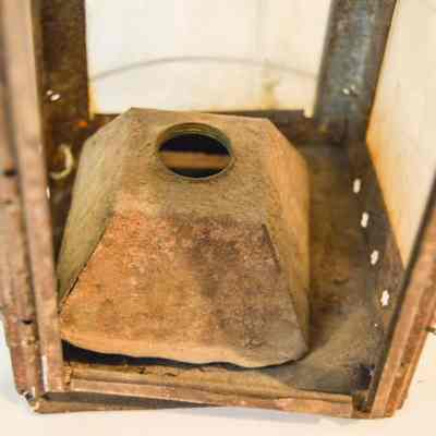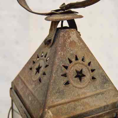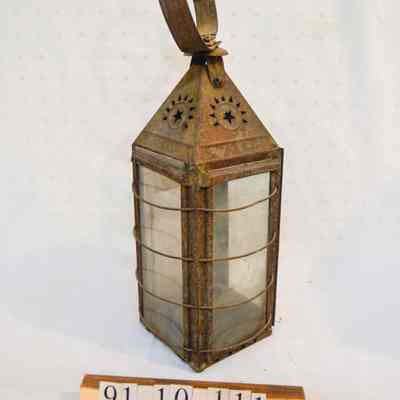 Metal lantern with a square base and rectangular sides. Three of the sides have a glass panel in the center that slides up and out of a slot. Three metal rings surround the frame of the lantern. At the top, there is a pyramid-shaped cap with triangular vents on each side with a star in the center, and a circular handle attached to the top. On the inside of the lantern, there is a burner with a circular hole in the center.Dimensions