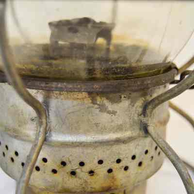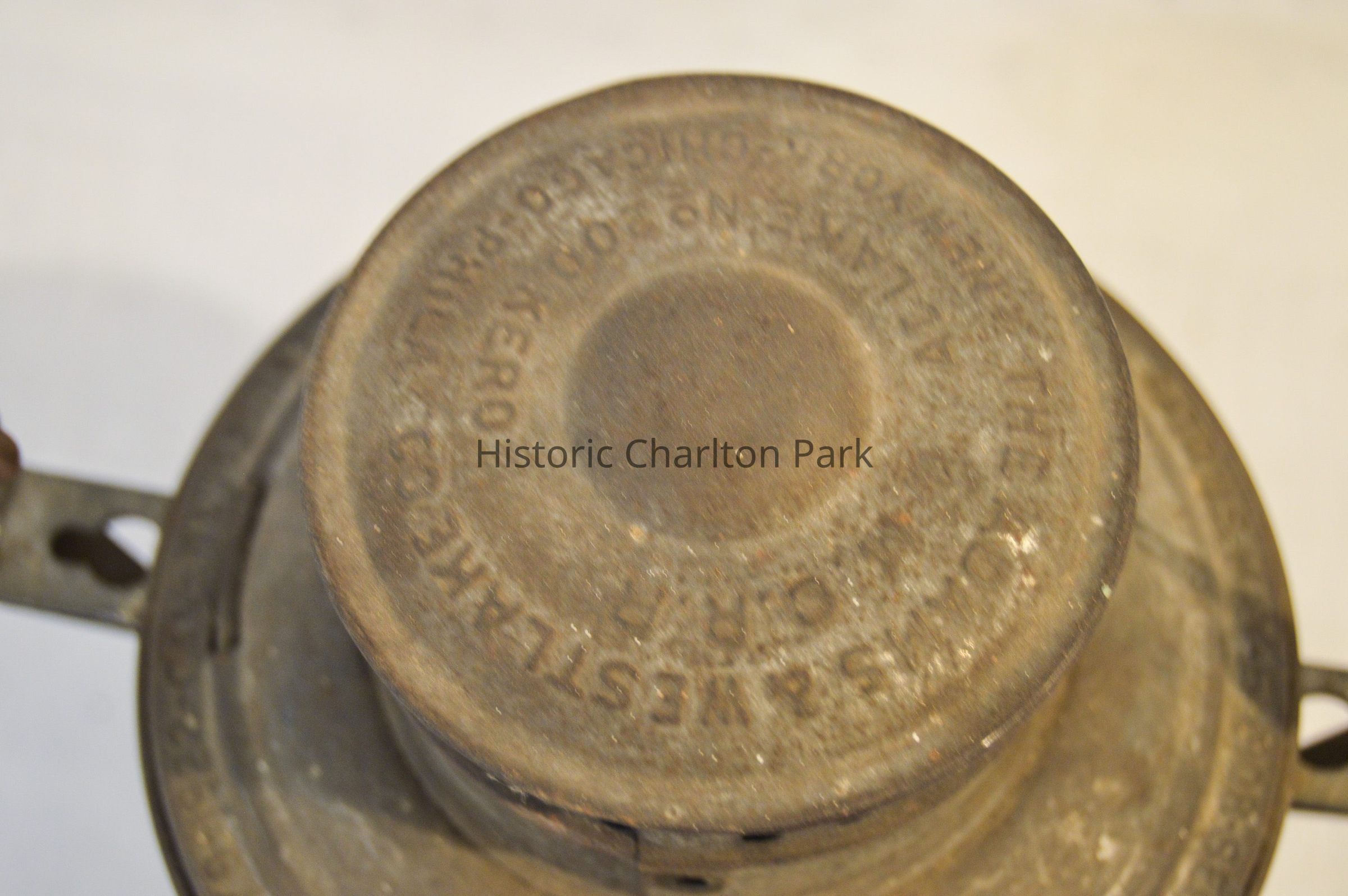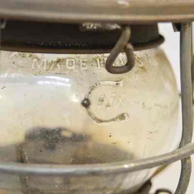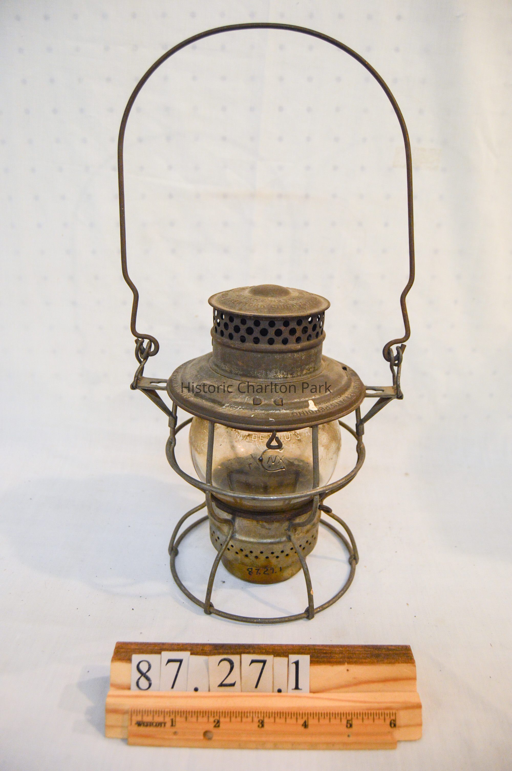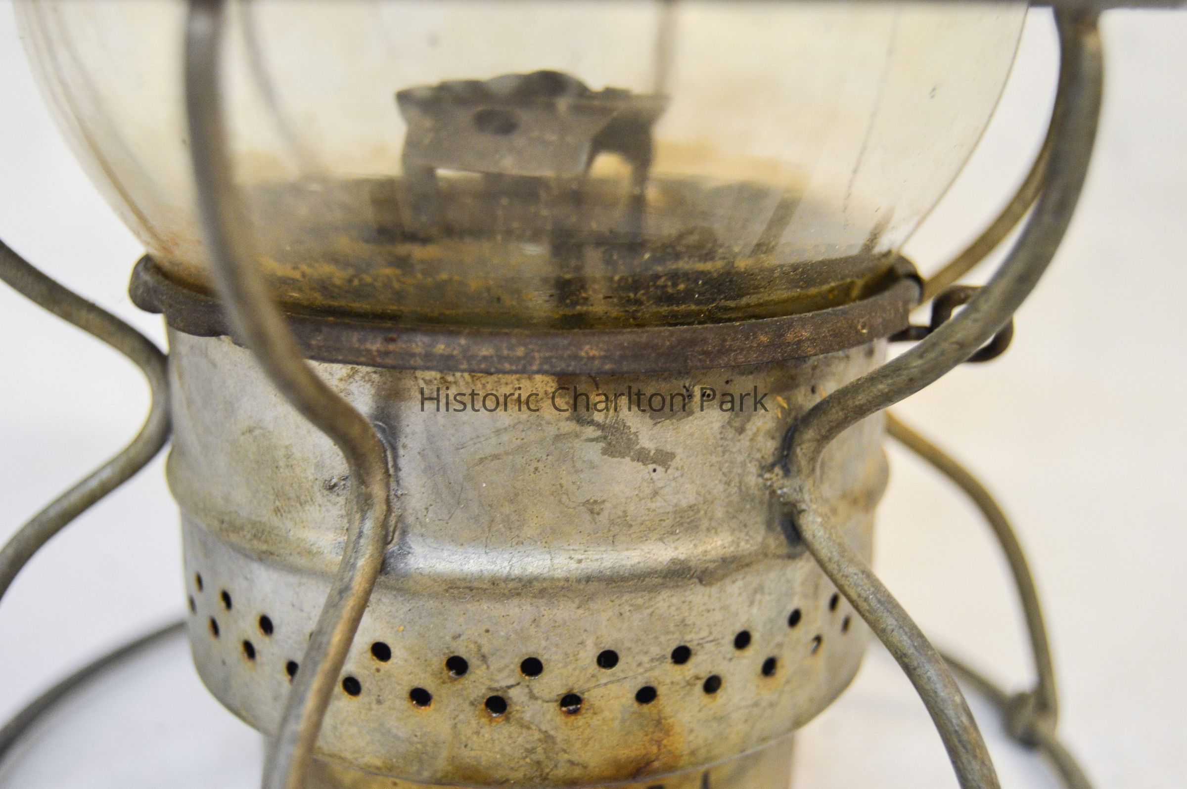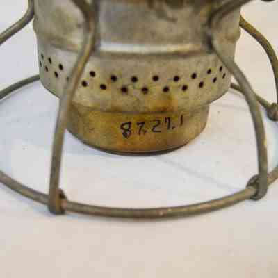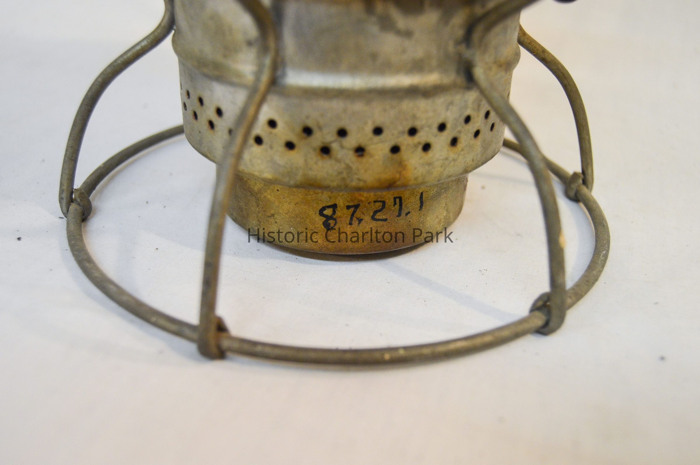 Metal railroad lantern. The base of the lantern is cylindrical and has circular vents around the middle. The base has a burner in the center, which consists of a key-shaped knob on the side and a somewhat cube-shaped emitter in the center. The burner is surrounded by a somewhat spherical glass chimney and the entire base and chimney are enclosed by a wire frame. The frame consists of six vertical bars and two horizontal rings, one around the chimney and one at the bottom for support. There is a disc-shaped cap at the top of the chimney and a cylindrical top to the lantern. The top has circular vents near the top edge and inscriptions on the top. A looped metal handle is attached to the sides of the frame.Inscription/Signature/Marks