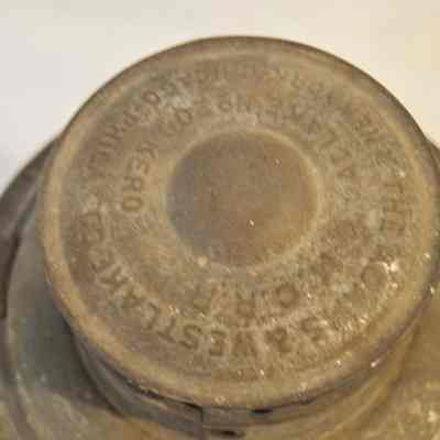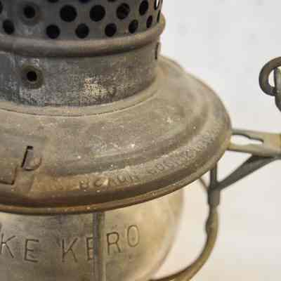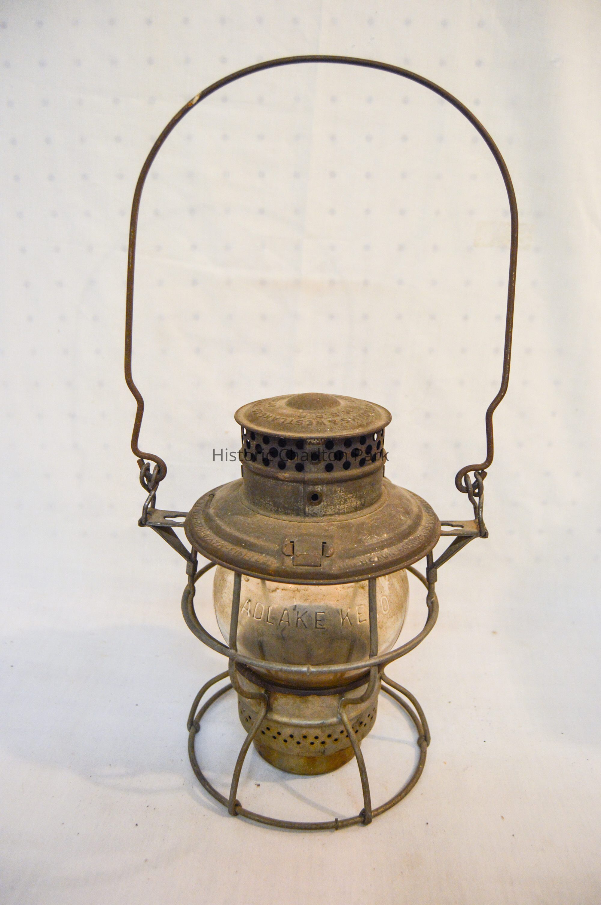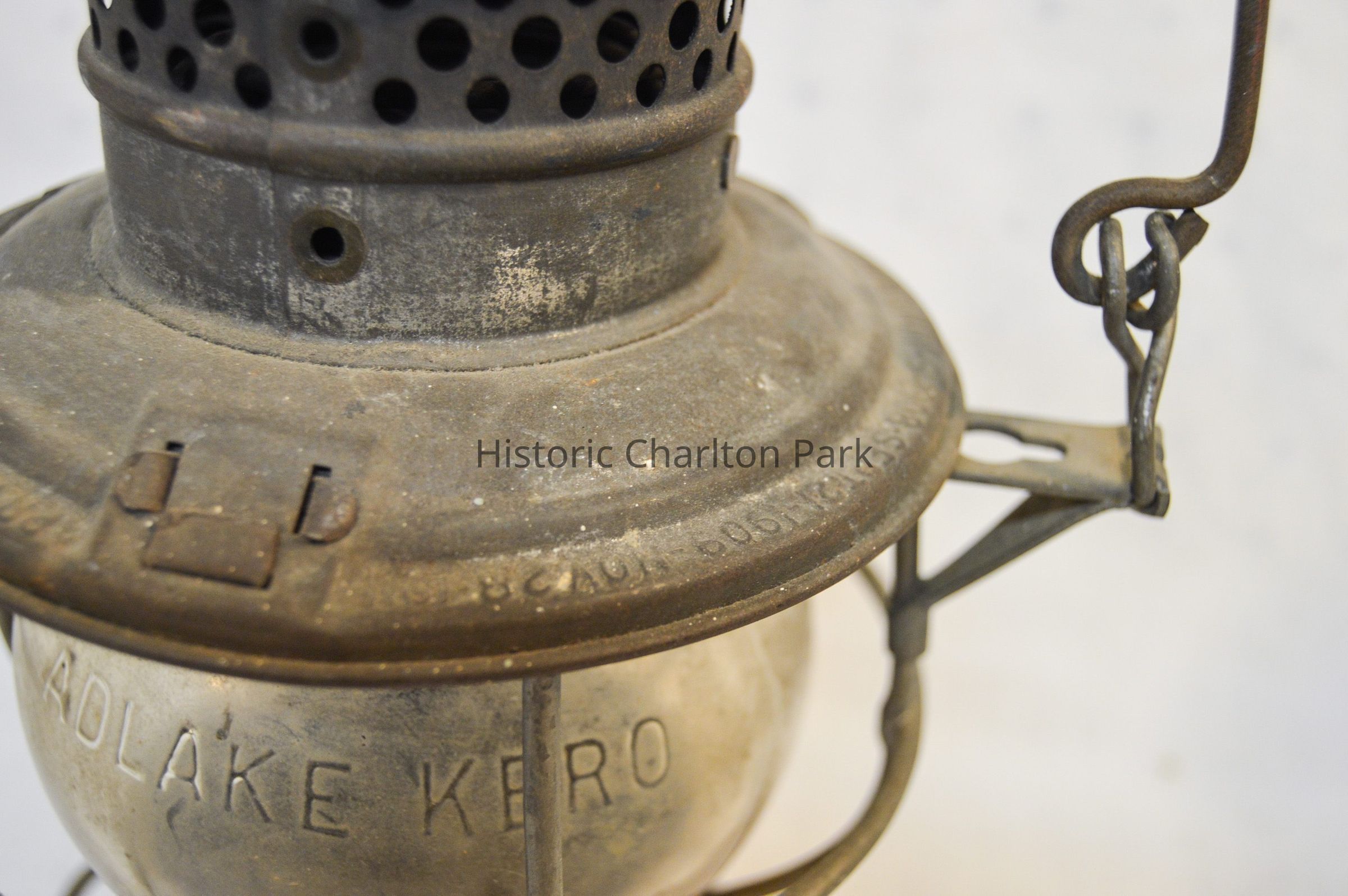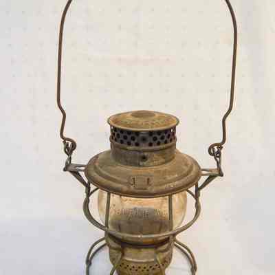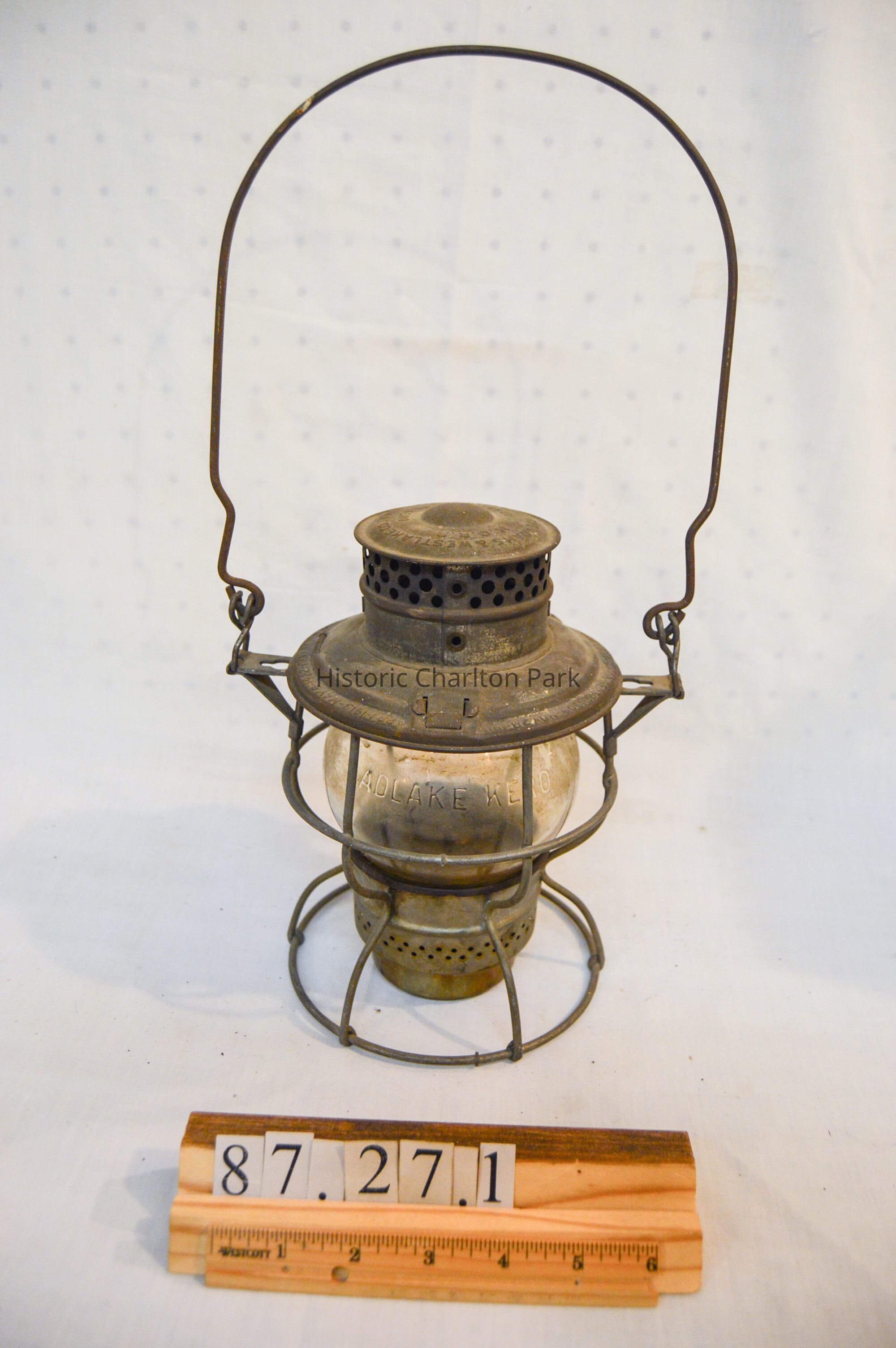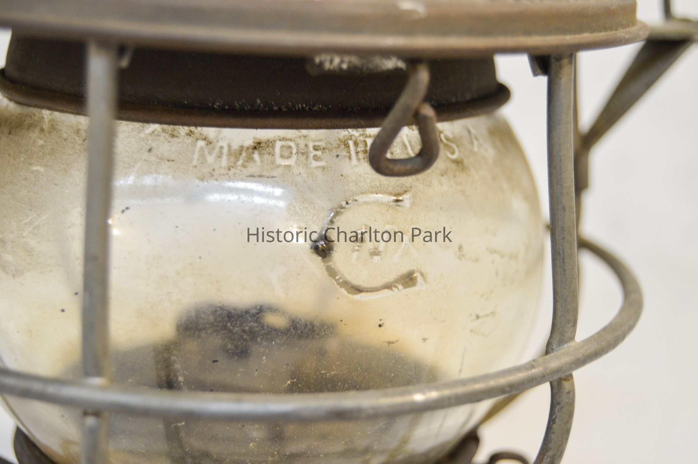 Metal railroad lantern. The base of the lantern is cylindrical and has circular vents around the middle. The base has a burner in the center, which consists of a key-shaped knob on the side and a somewhat cube-shaped emitter in the center. The burner is surrounded by a somewhat spherical glass chimney and the entire base and chimney are enclosed by a wire frame. The frame consists of six vertical bars and two horizontal rings, one around the chimney and one at the bottom for support. There is a disc-shaped cap at the top of the chimney and a cylindrical top to the lantern. The top has circular vents near the top edge and inscriptions on the top. A looped metal handle is attached to the sides of the frame.Inscription/Signature/Marks