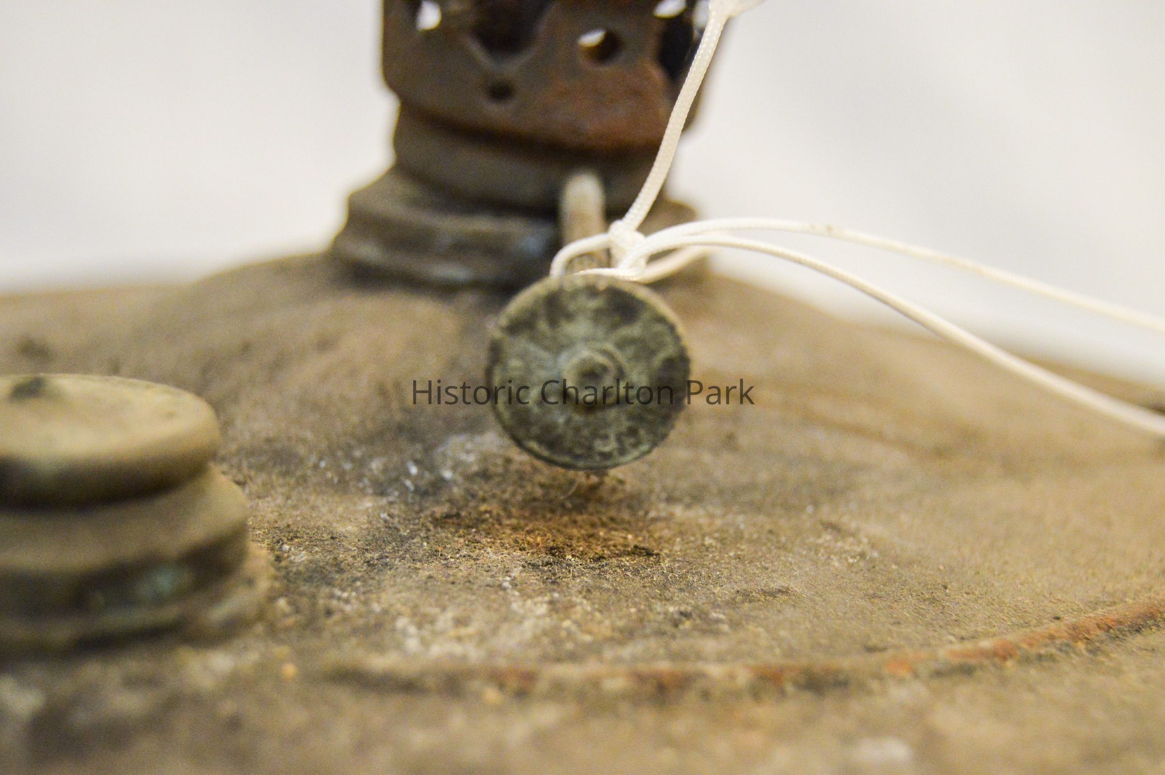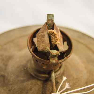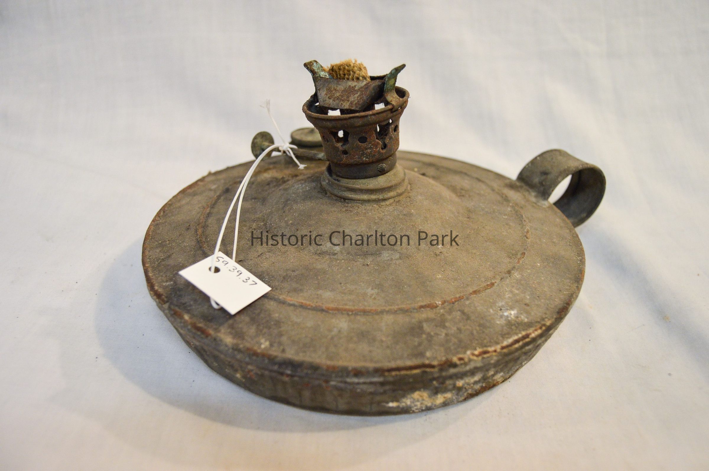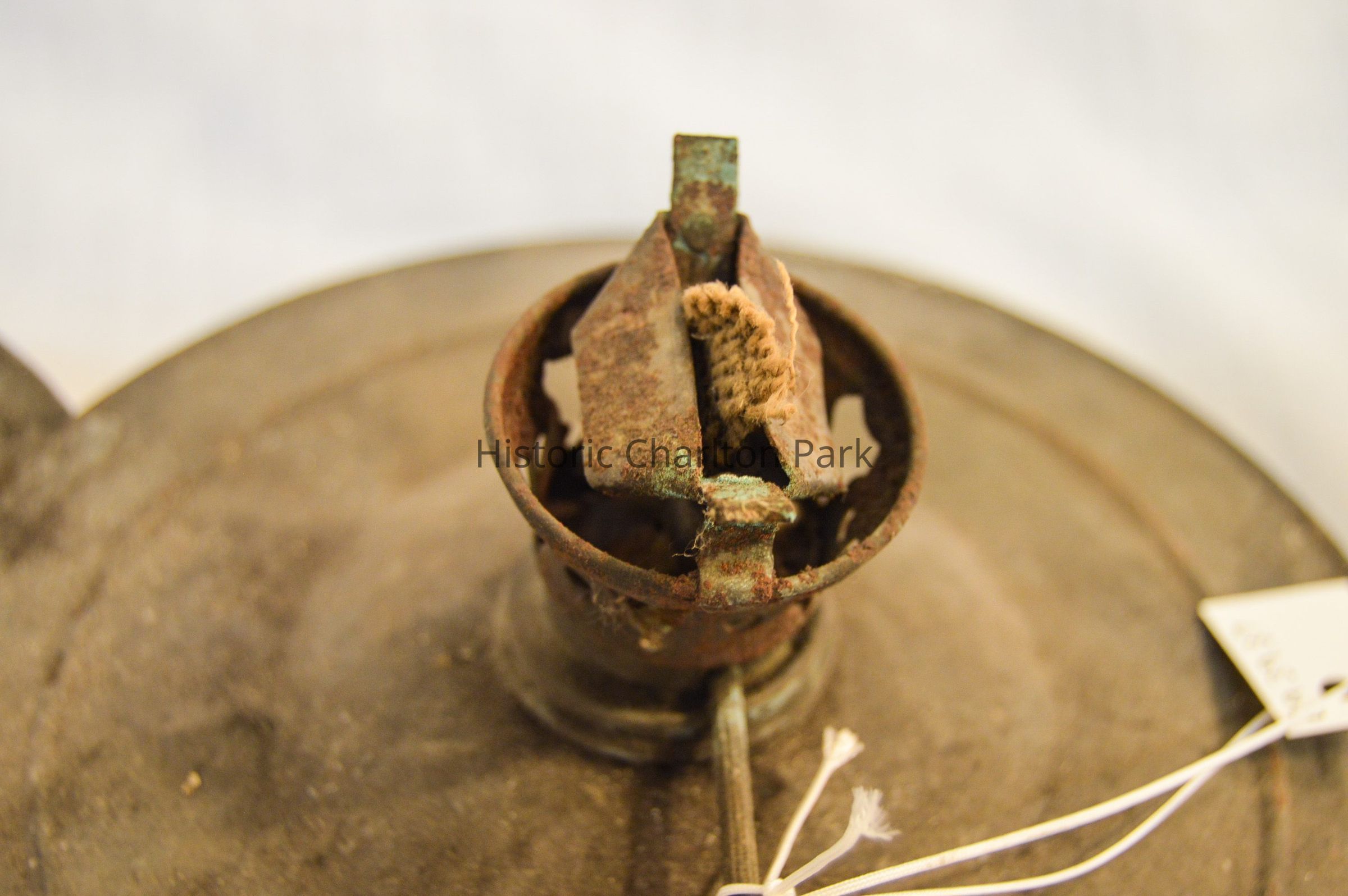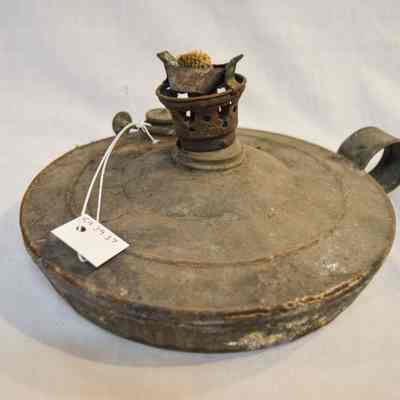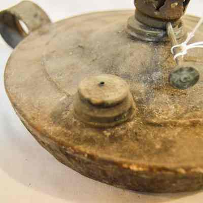 Circular metal kerosene lamp. The lamp has a metal handle made of a looped piece of flat metal on one side of the base. There is a fuel spout 90 degrees to the side of the handle and a burner in the center of the lamp. The burner has a knob and a small, cylindrical container with decorative holes and a piece of metal in the center that holds the wick in place. The entire burner screws into the top of the lamp.Inscription/Signature/Marks