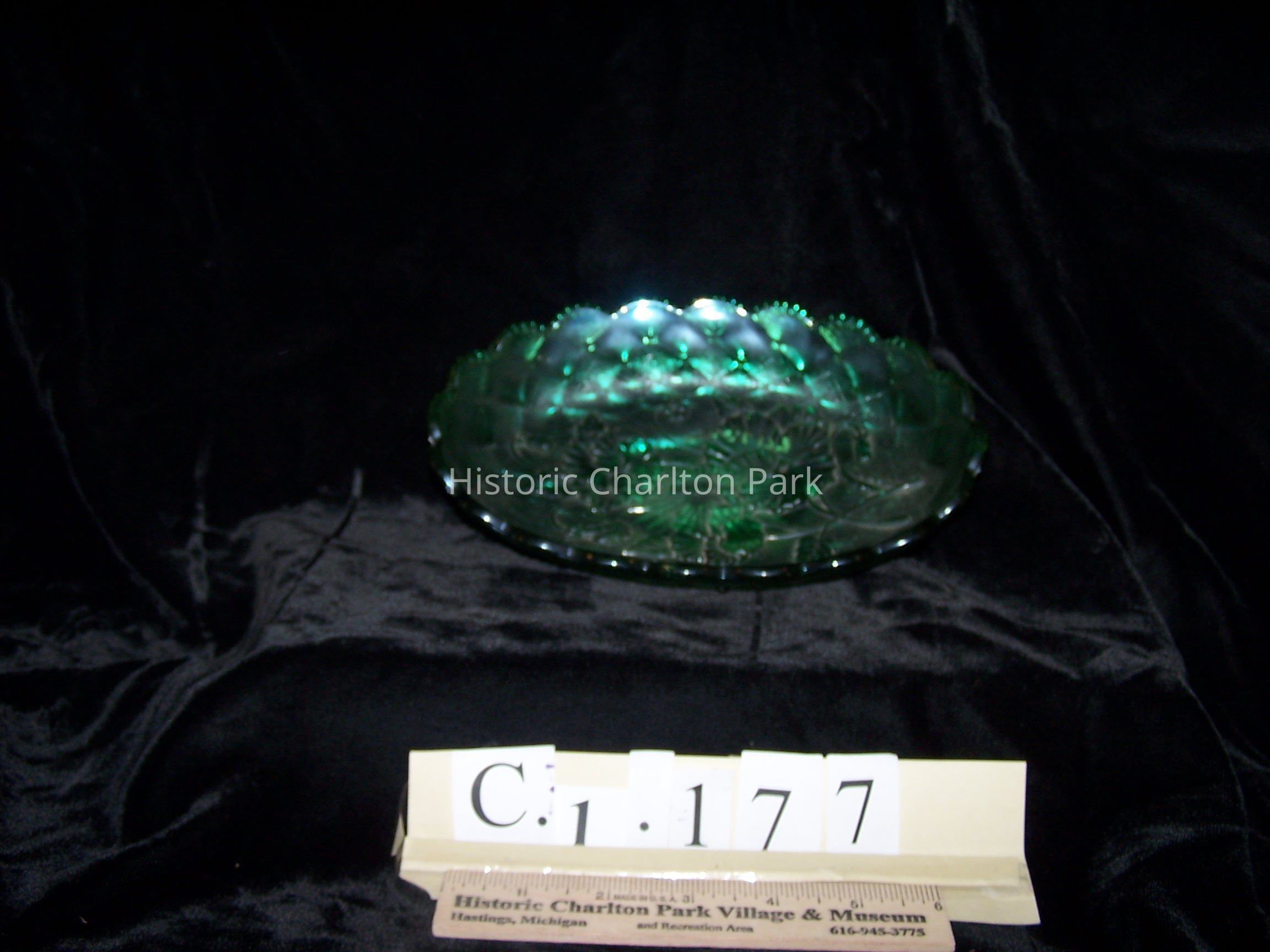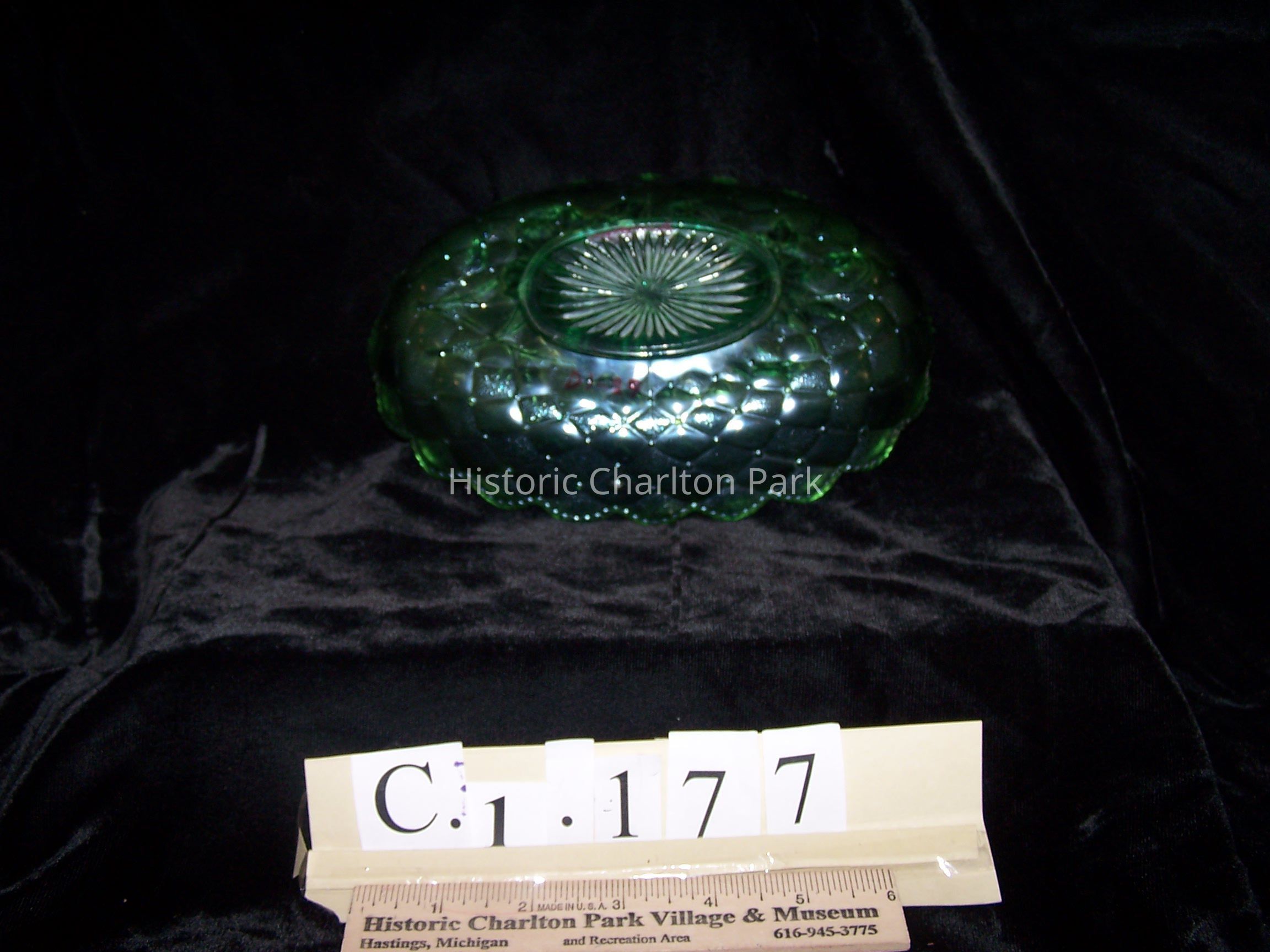 Green carnival glass oblong relish dish with "Pansy" pattern on interior and "Quilted diamond" on the exterior made by Imperial Glass Co. Has lost its iridescence, only distinguishable as carnival glass by pattern. Pattern production began in 1910.