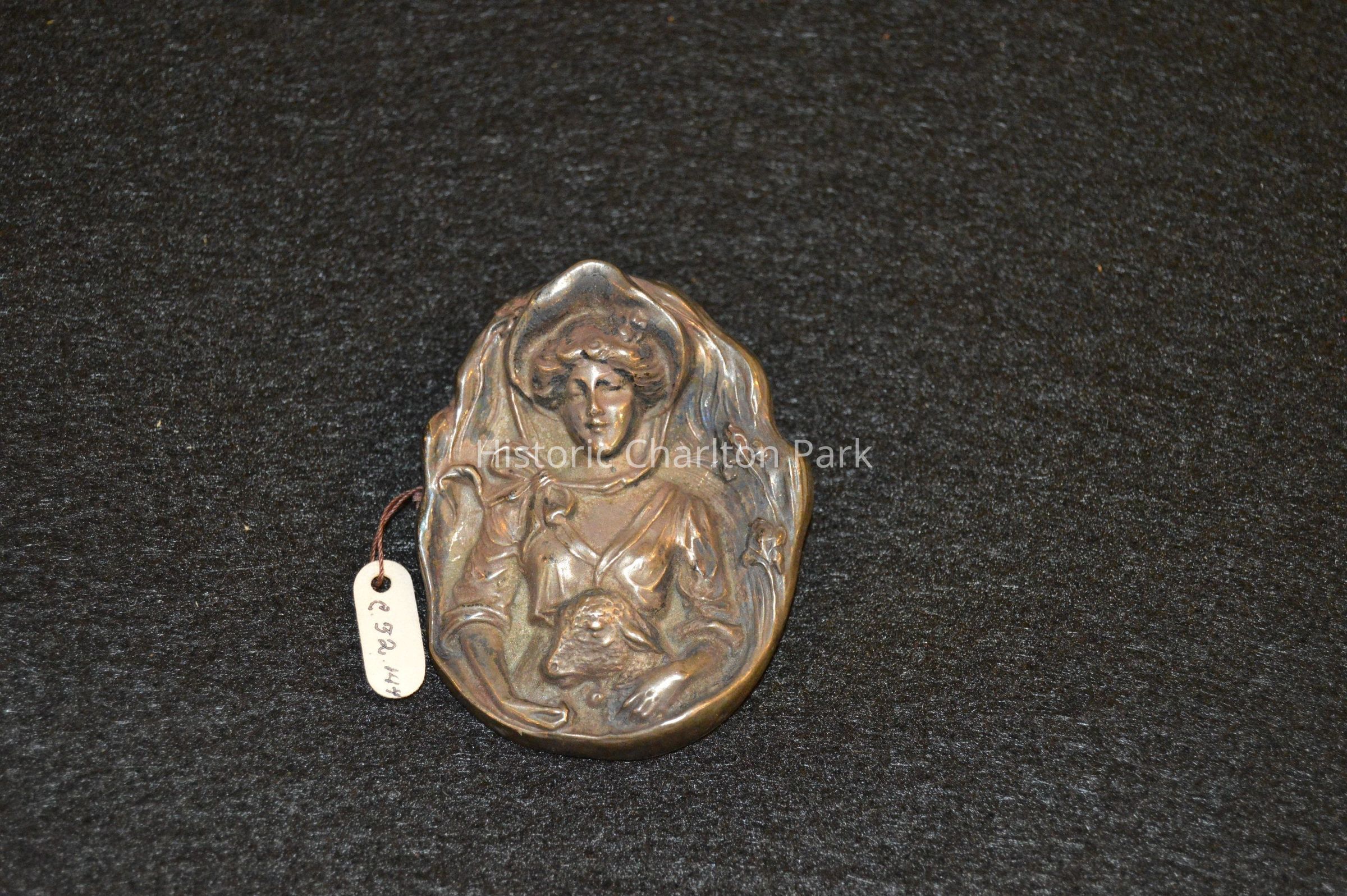 Silver plated cameo style brooch depicting a young woman with a lamb. Portrays the "Gibson Girl", originally illustrated by Charles Dana Gibson in the 1890's. Gibson girls epitomized feminine beauty and were popular in the late 1800s.